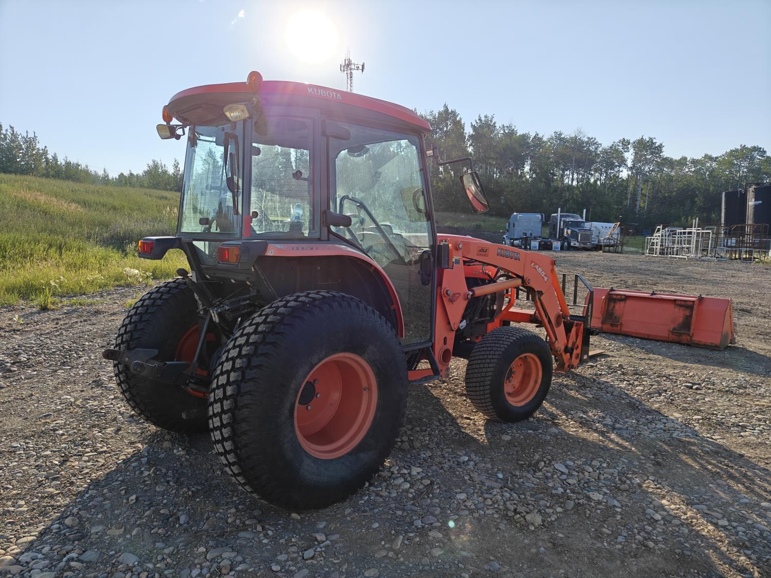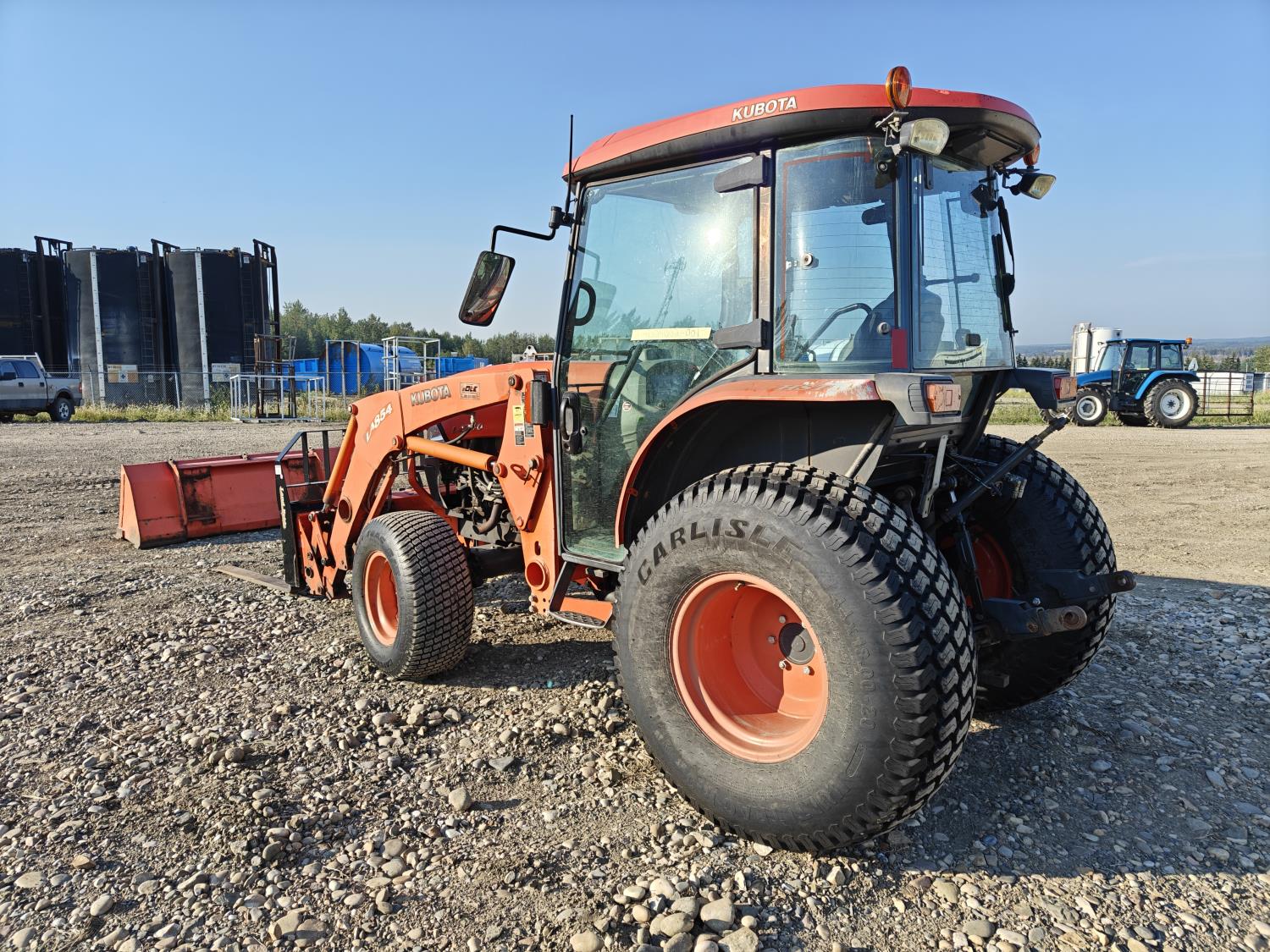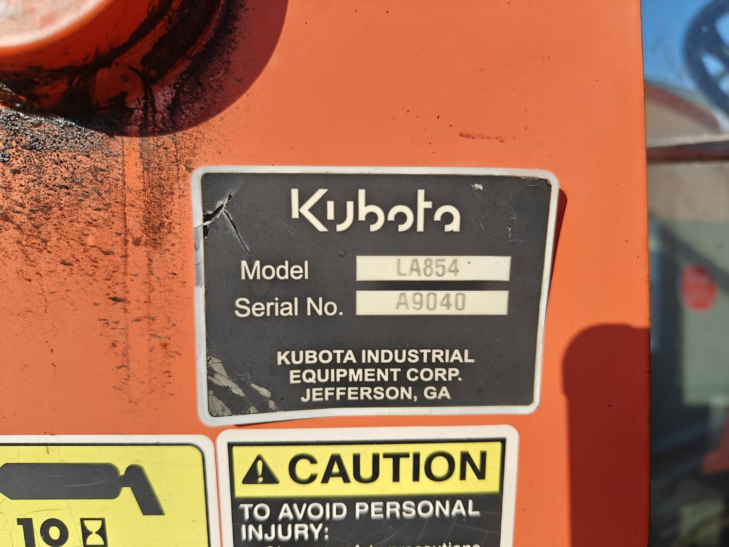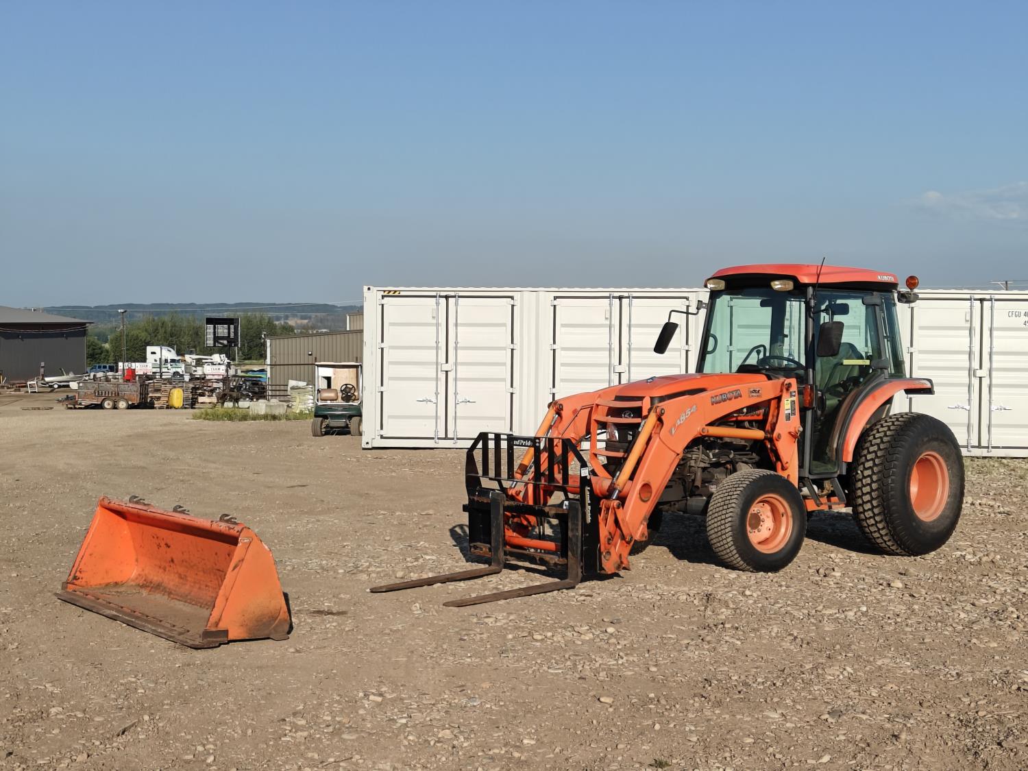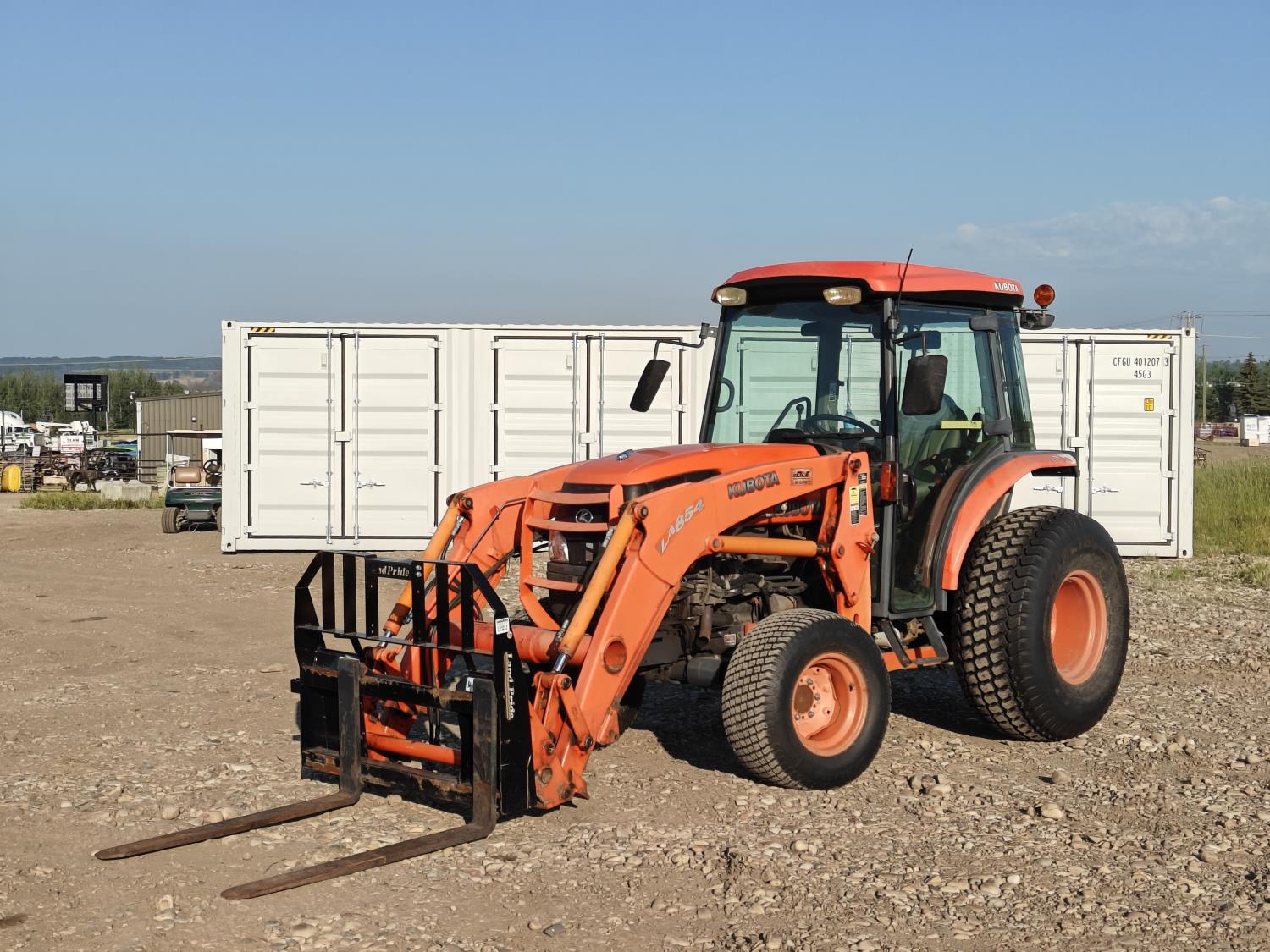 Kubota LA854 loader, Q/A, 73 inch bucket, Kubota 2.4 L 4 cylinder 47 HP, diesel engine, 41 PTO HP, hydro 3 range transmission, 10 GPM hydraulic pump, cab, rear differential lock, joystick, A/C, radio, upgraded stereo, 48" Land Pride pallet forks , 540 PTO, 3 point hitch, 2 rear hydraulic outlets, 29X12.50-15 front tires, 44X18.00-20 rear tires