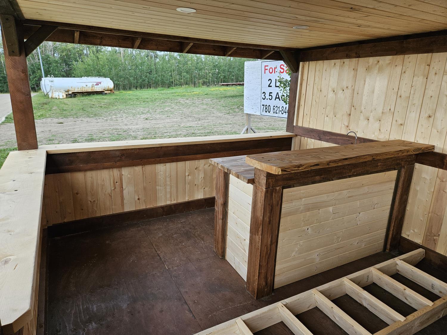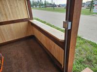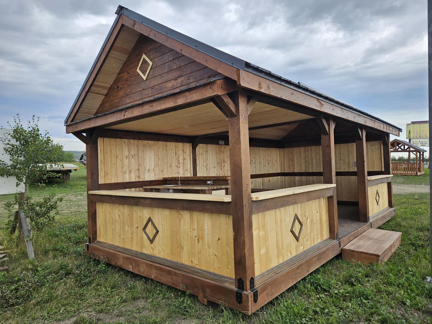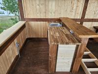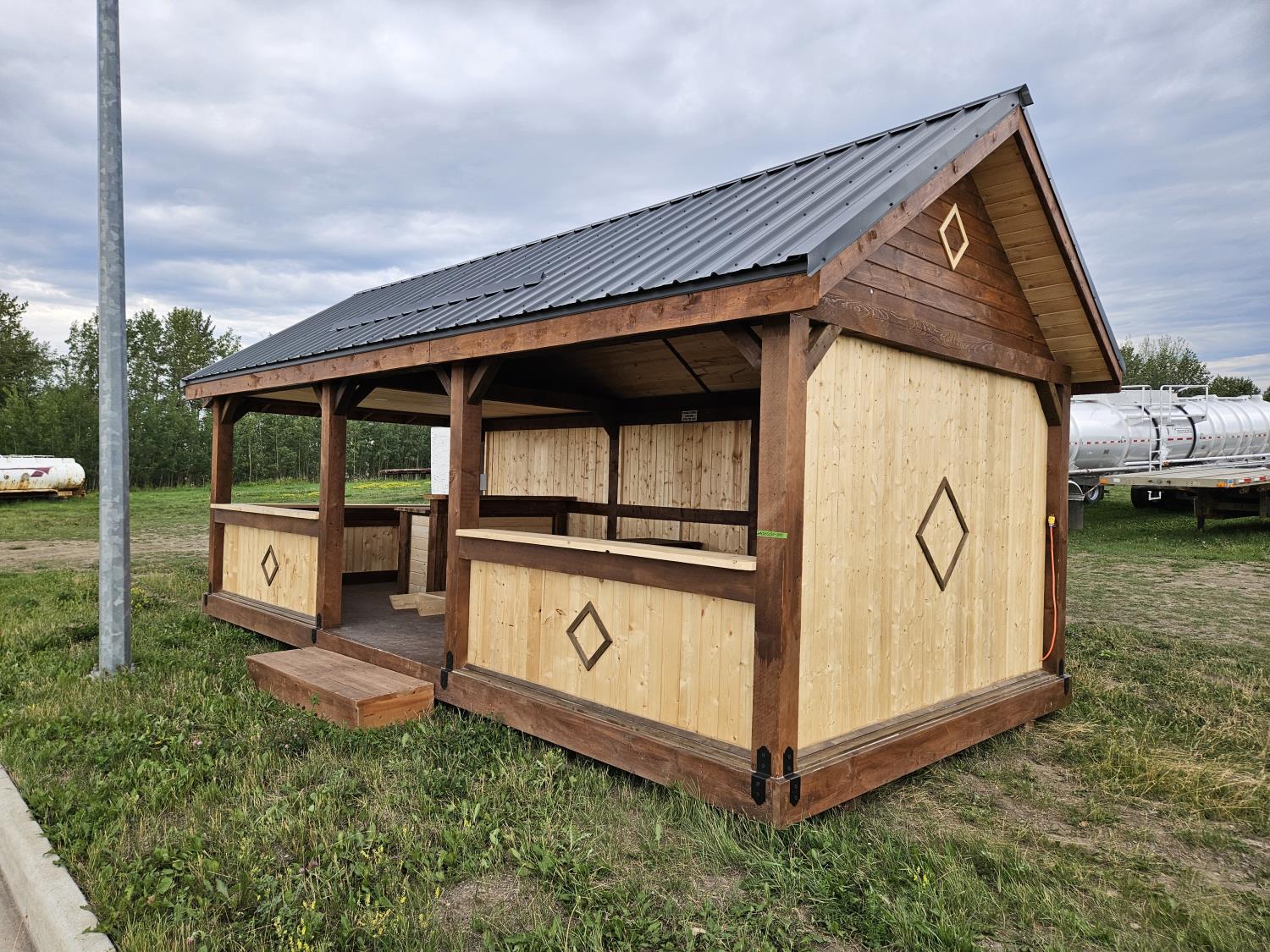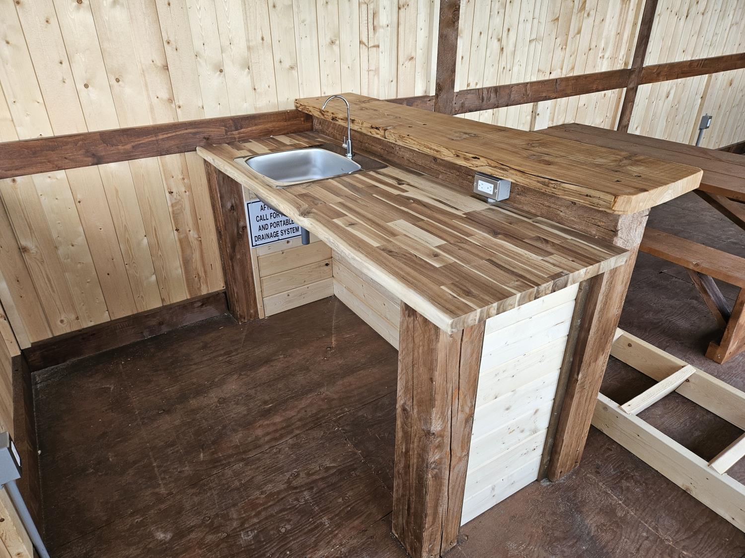 12 ft x 24 ft, 8.5 ft x 10.5 ft loft, 6 ft x 25 inch sink and counter top, 74 inch x 28 inch picnic table, ladder, LED pot lights throughout, fan, receptacles, metal roof