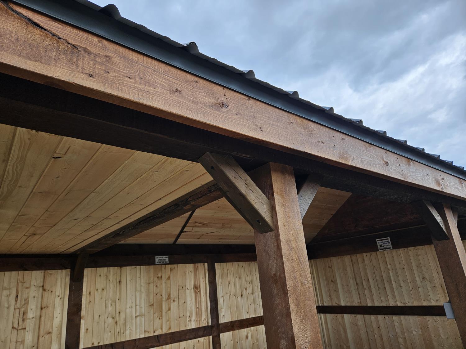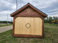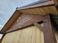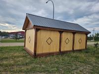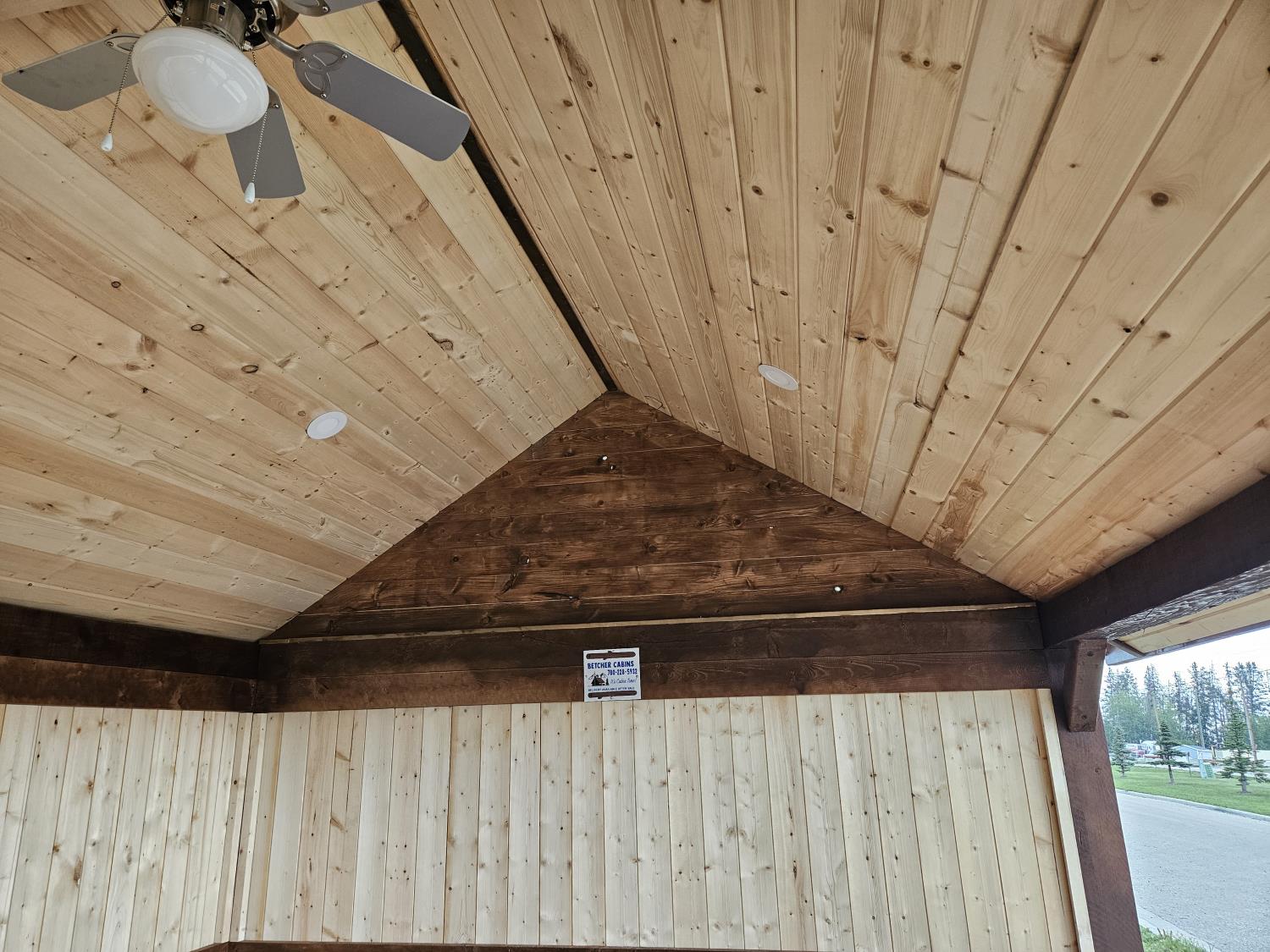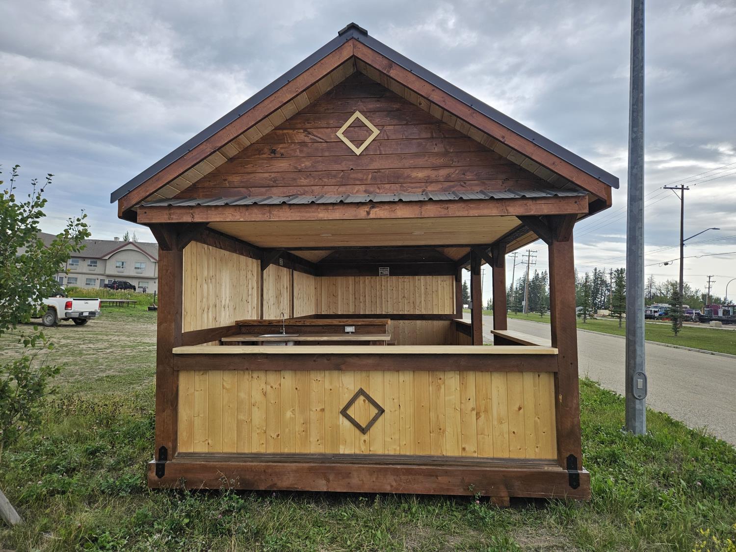12 ft x 24 ft, 8.5 ft x 10.5 ft loft, 6 ft x 25 inch sink and counter top, 74 inch x 28 inch picnic table, ladder, LED pot lights throughout, fan, receptacles, metal roof
