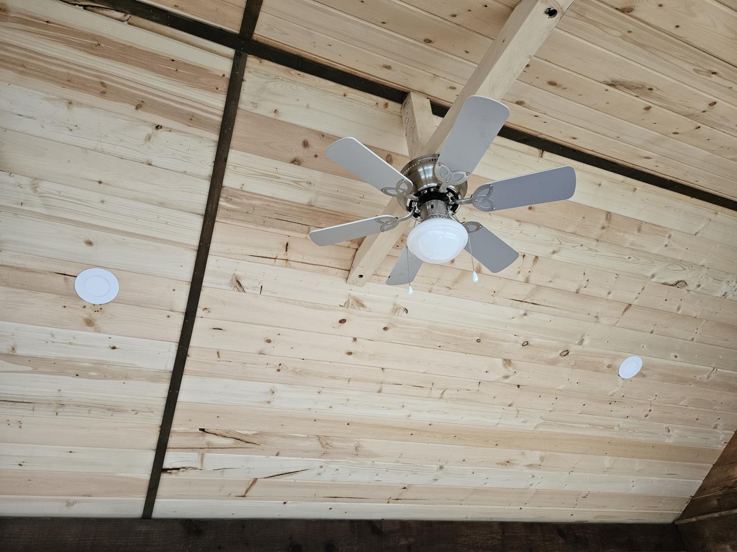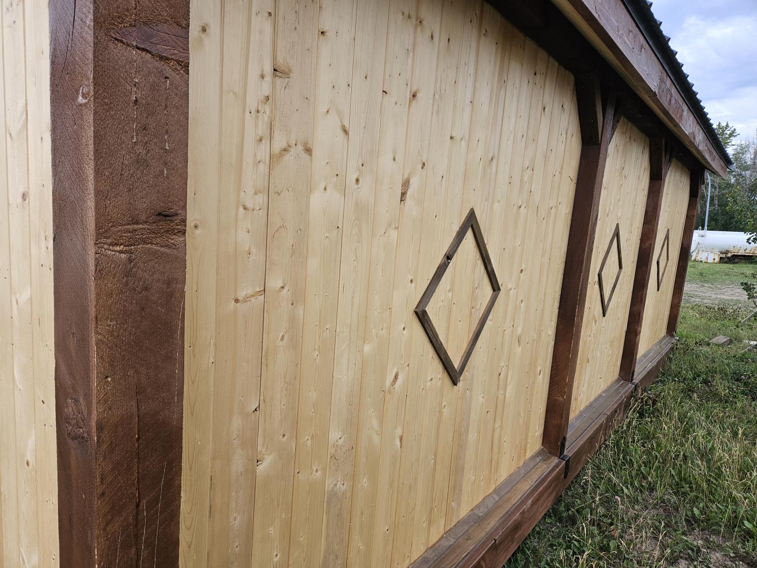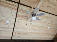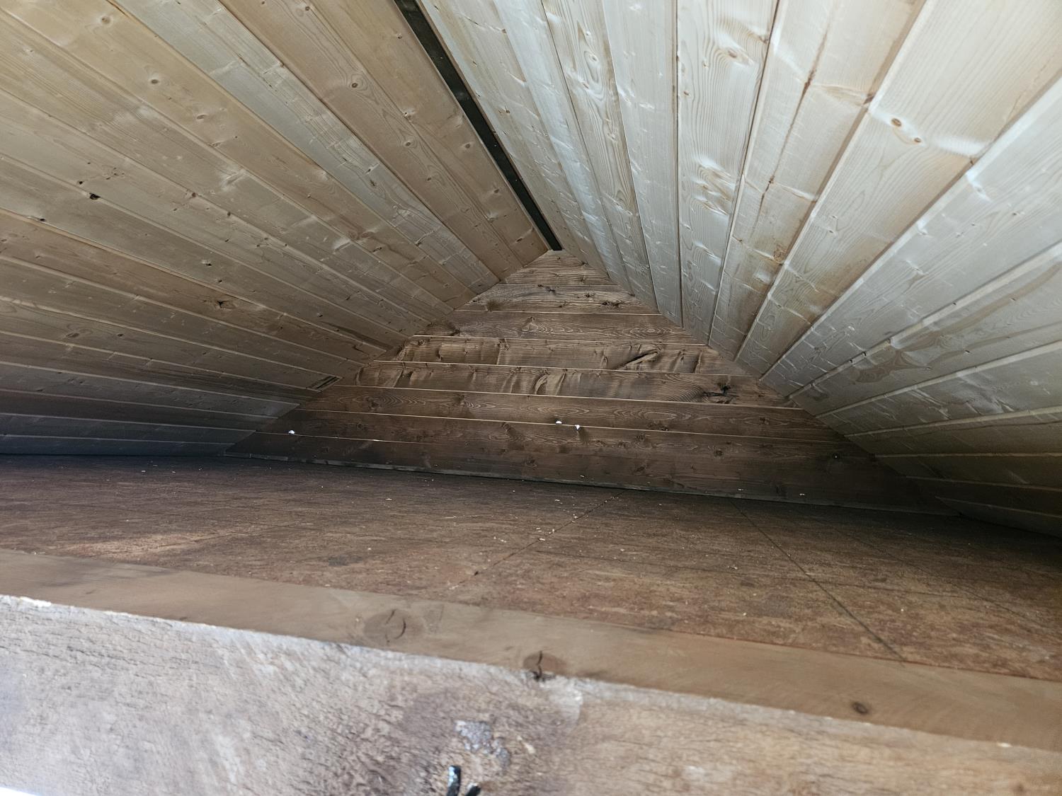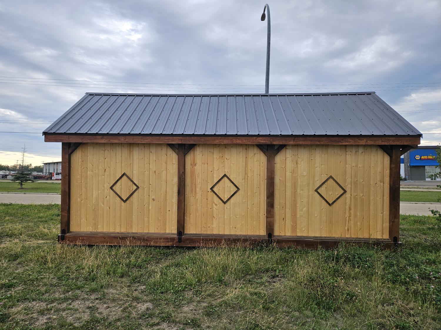 12 ft x 24 ft, 8.5 ft x 10.5 ft loft, 6 ft x 25 inch sink and counter top, 74 inch x 28 inch picnic table, ladder, LED pot lights throughout, fan, receptacles, metal roof