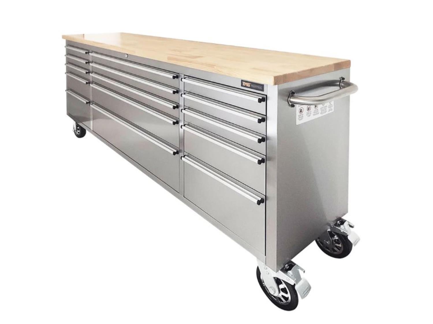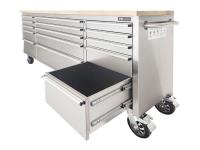 Rubberwood tabletop, 15 lockable drawers, locking wheels