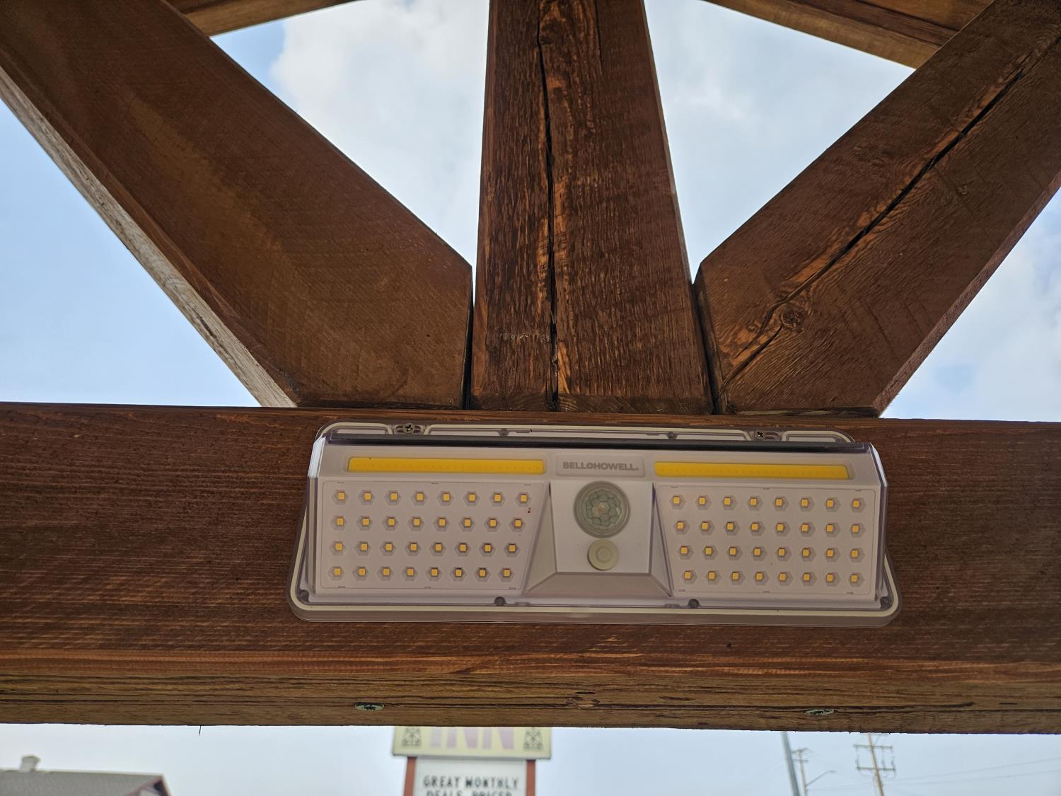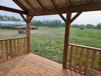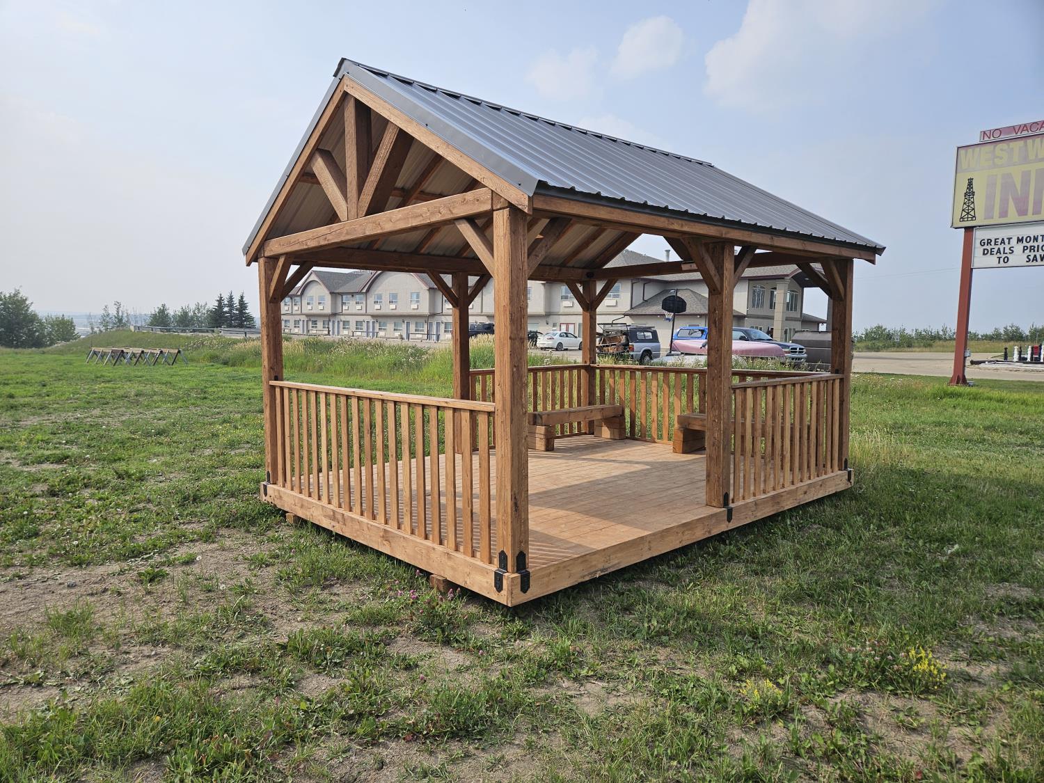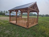 147 inch x 195 inch, 40 inch hand rail, interior lights, (2) 5 ft benches, tin roof
