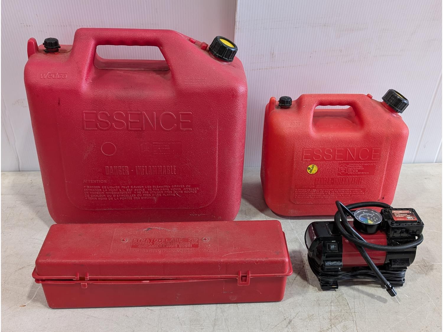 1166 (2) Jerry Cans, Road Flares, 12V Air Pump