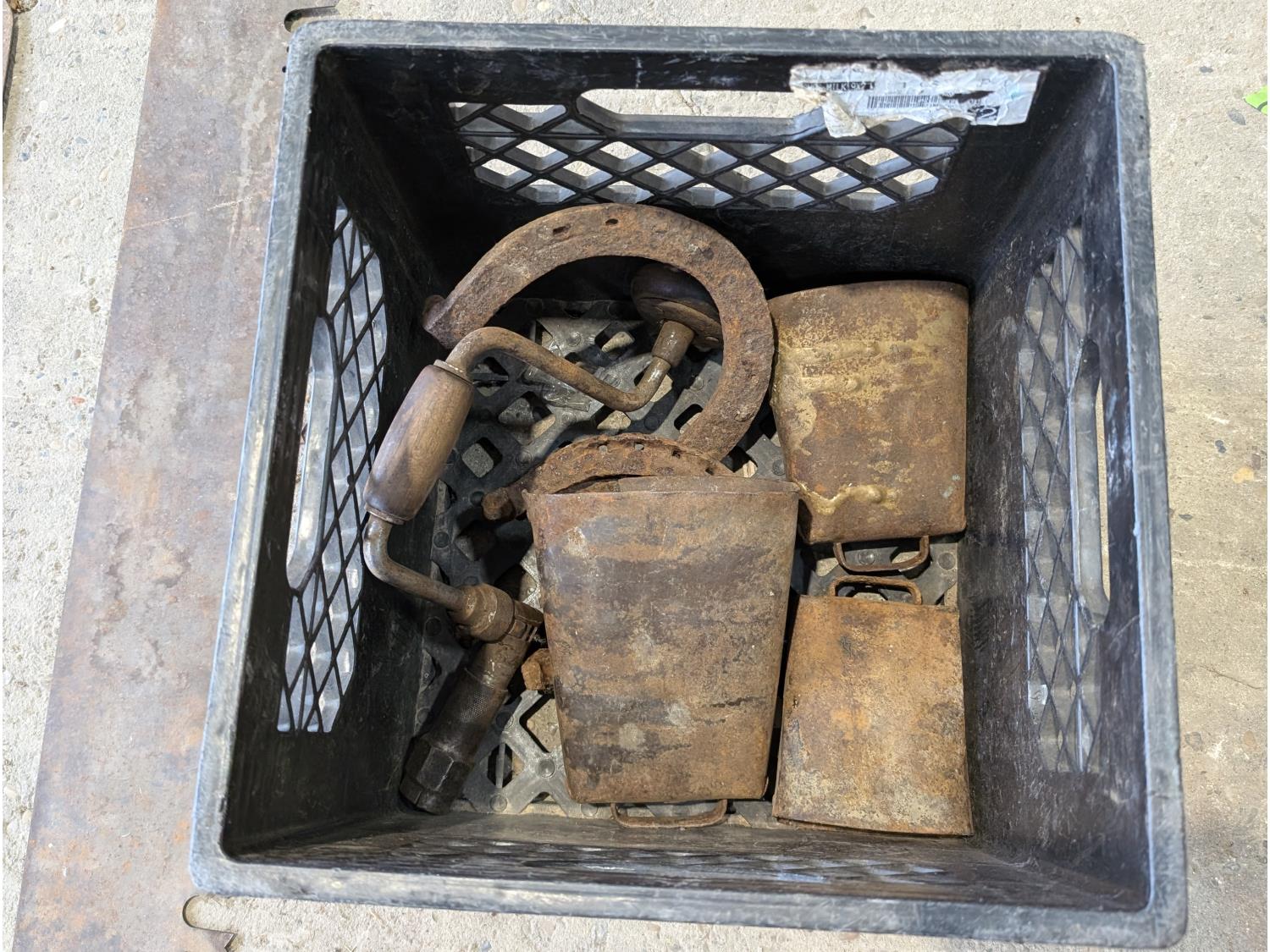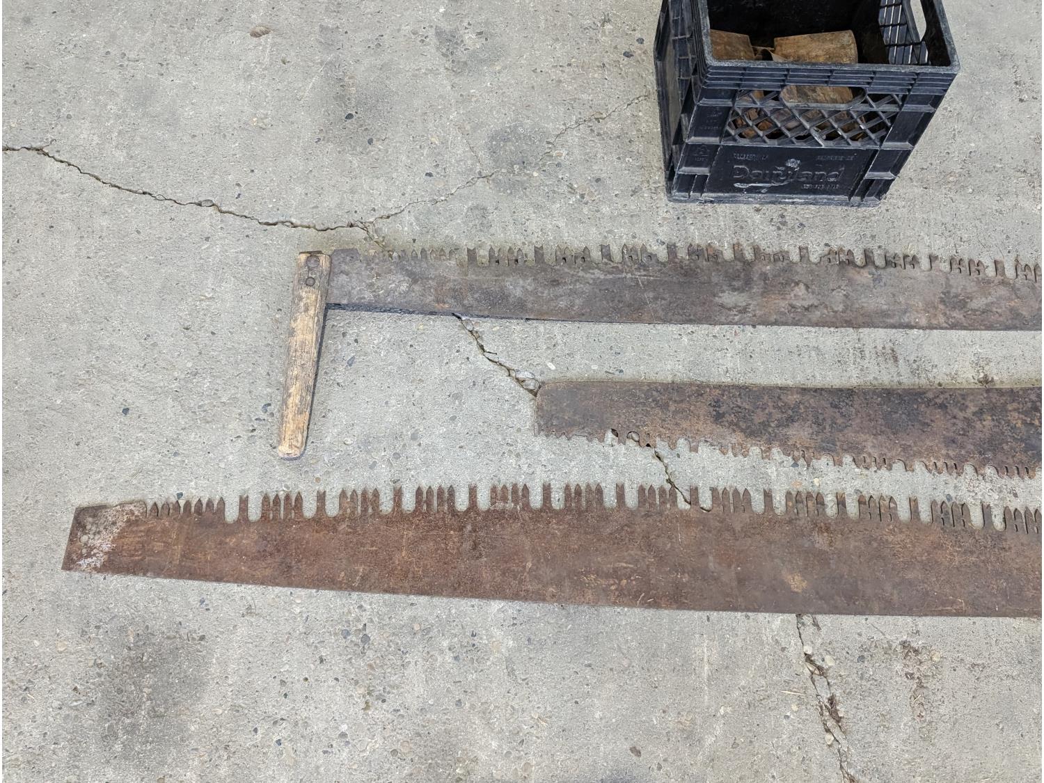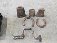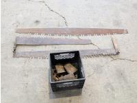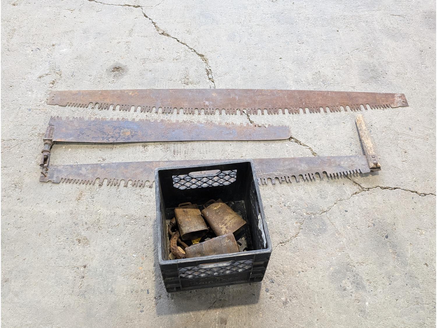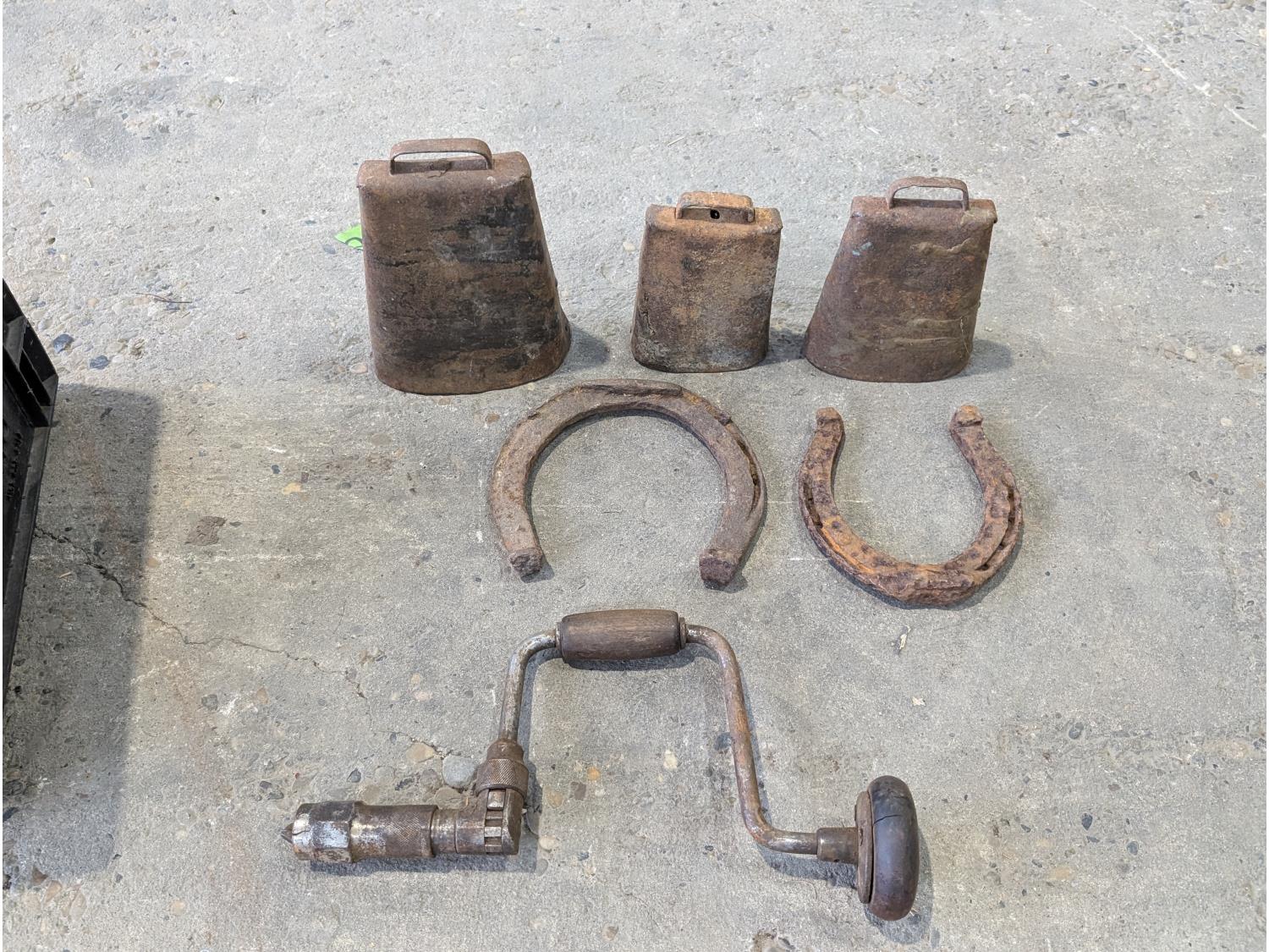 1694 (3) Antique Saw Blades, (3) Cow Bells and Drill