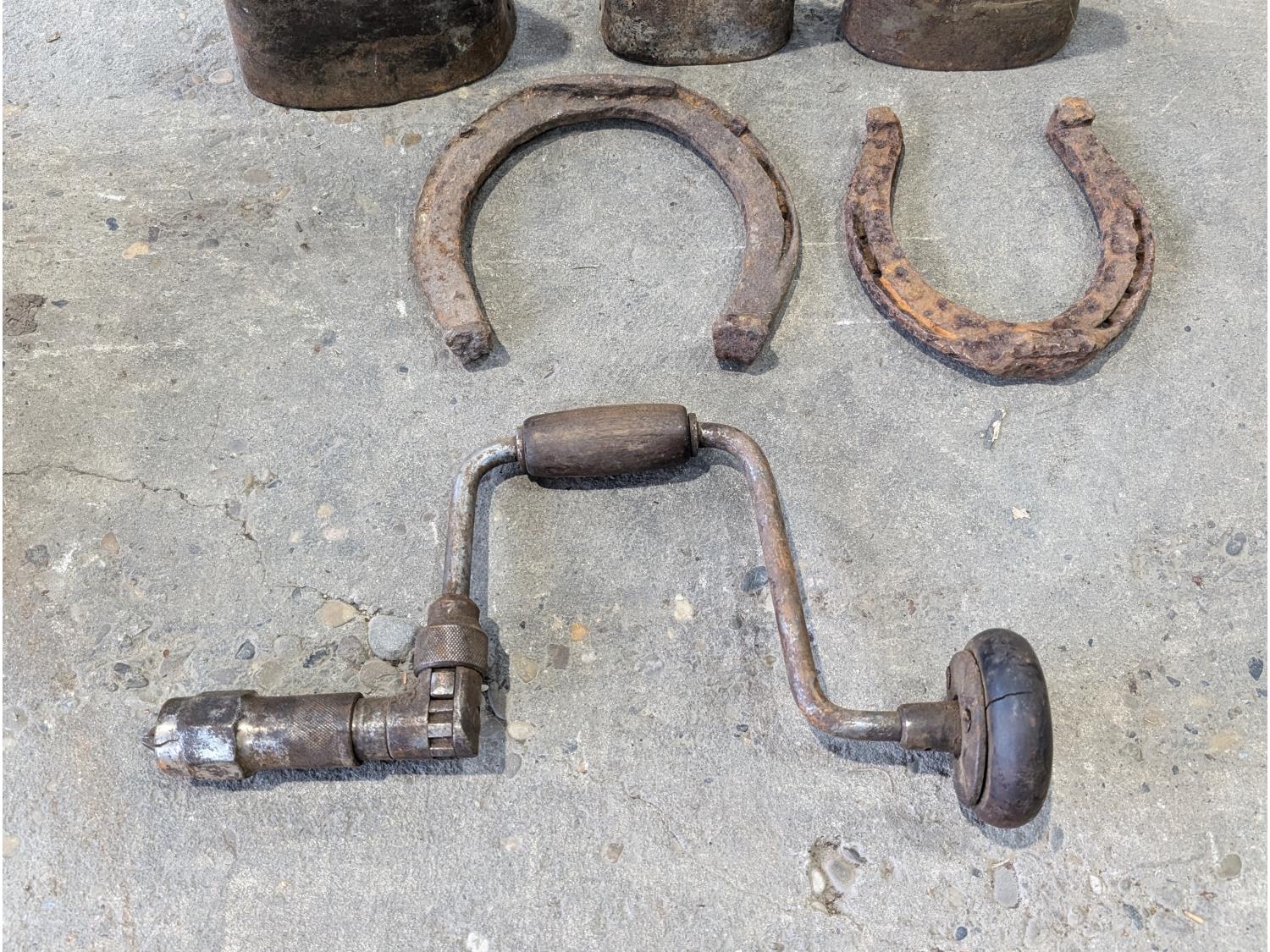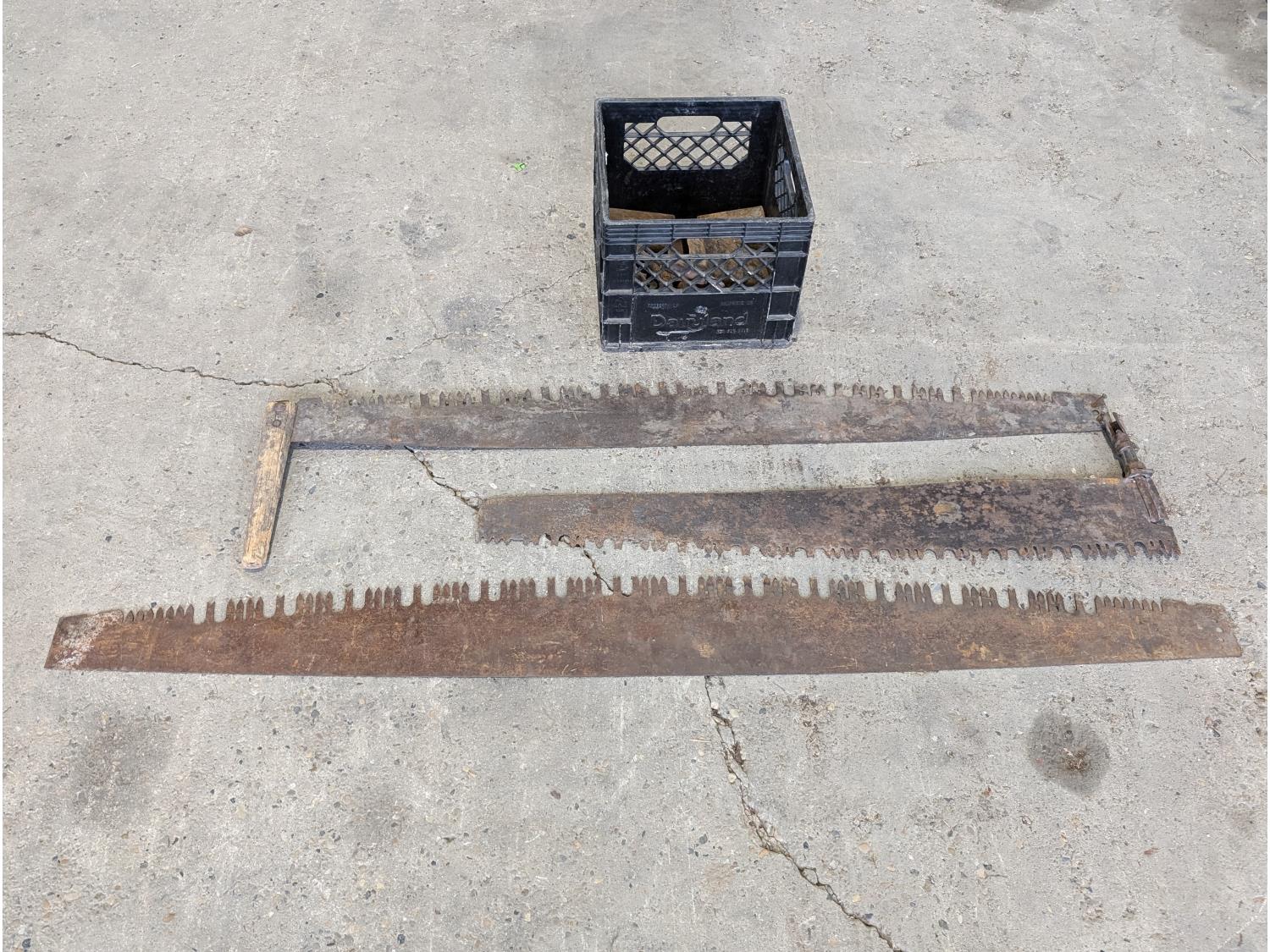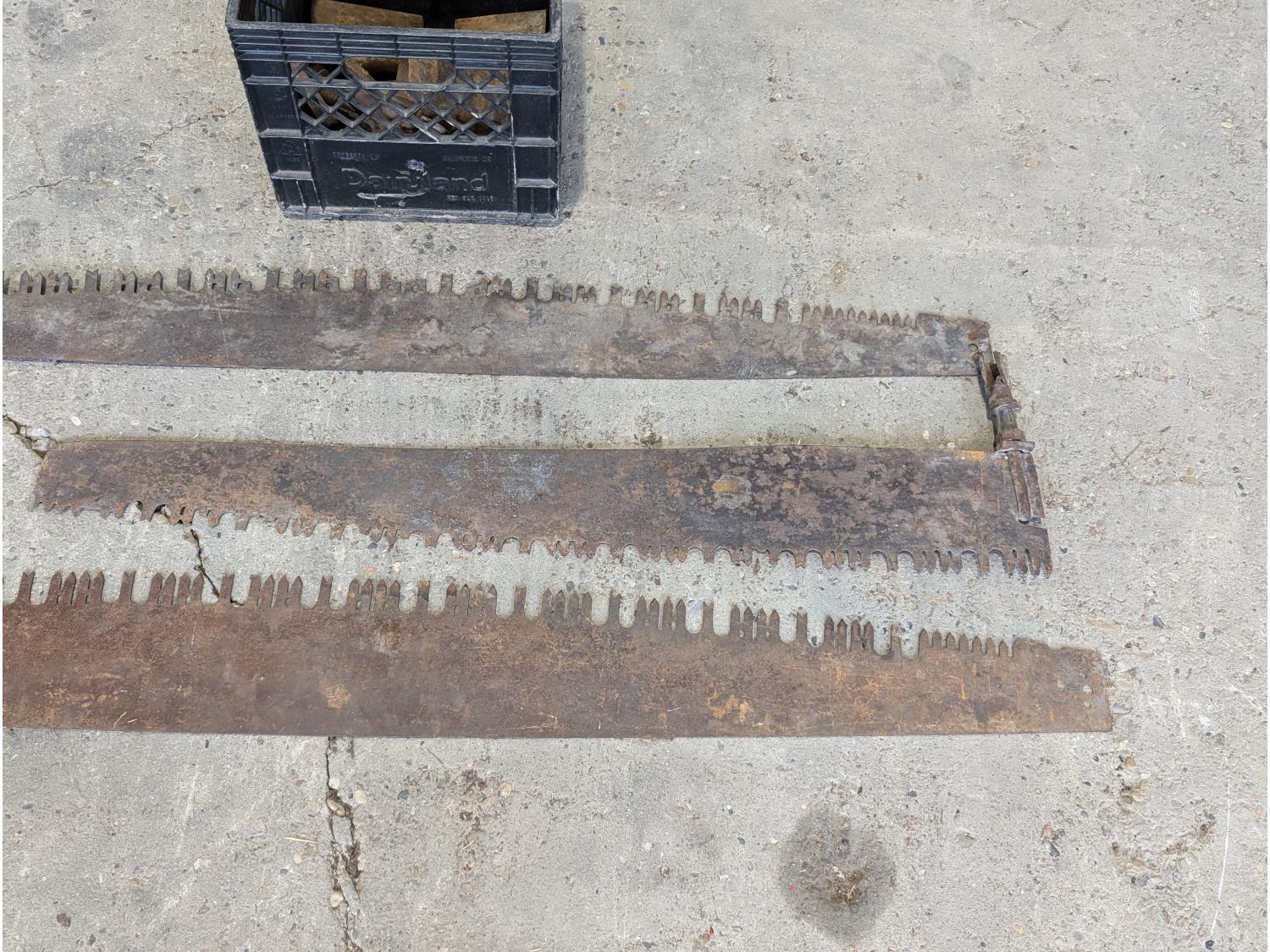 1694 (3) Antique Saw Blades, (3) Cow Bells and Drill