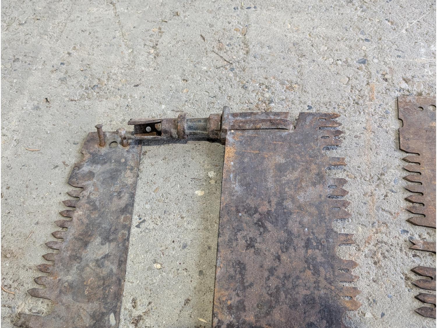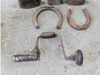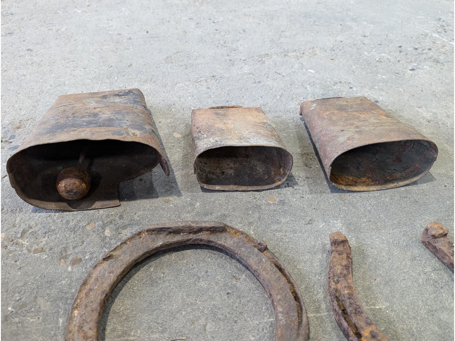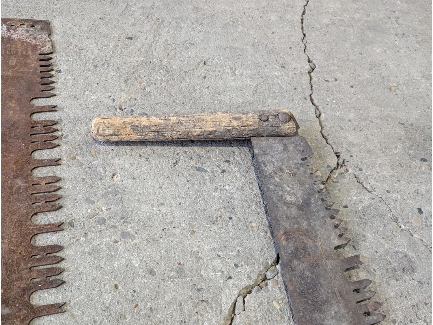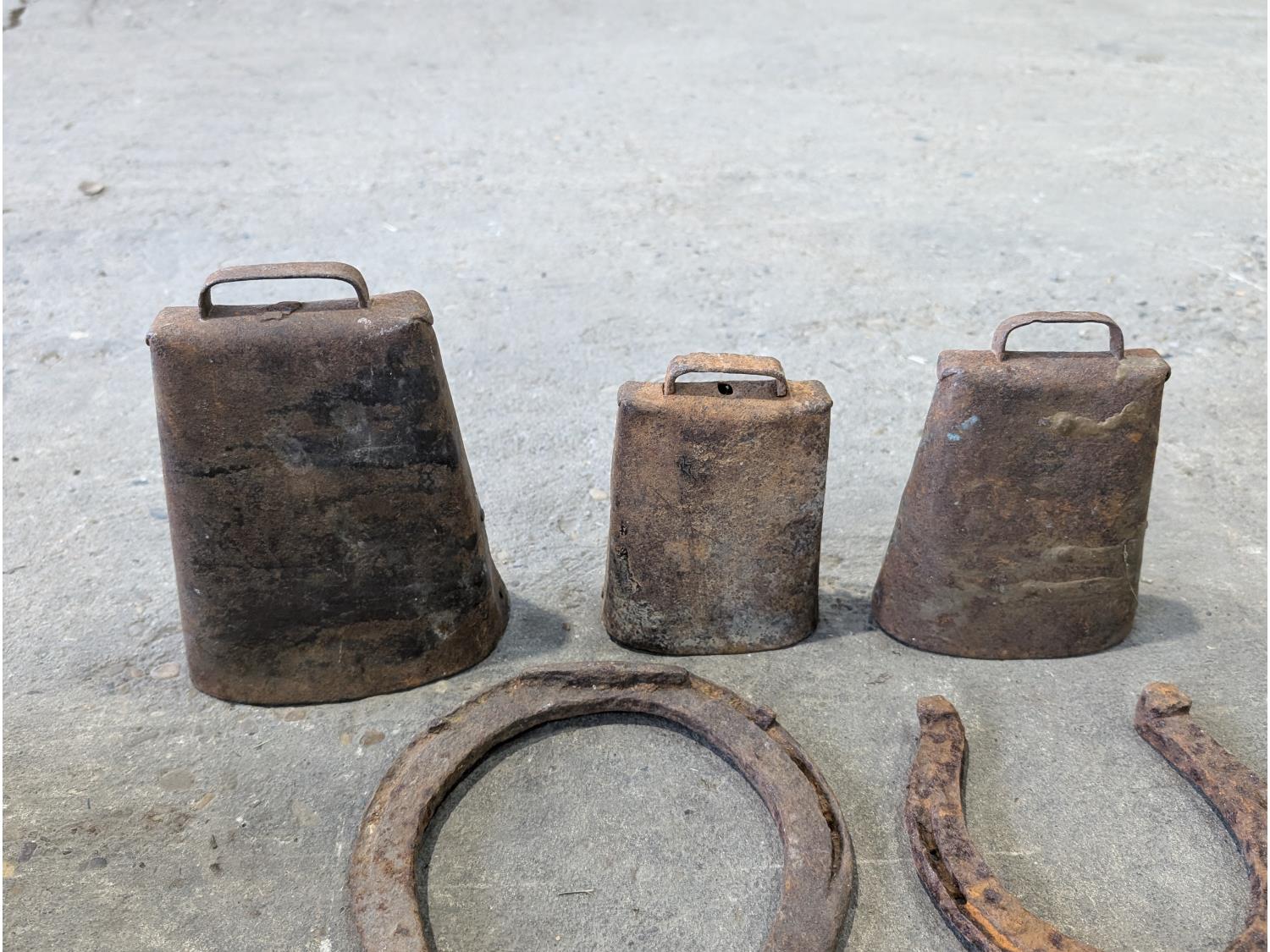 1694 (3) Antique Saw Blades, (3) Cow Bells and Drill