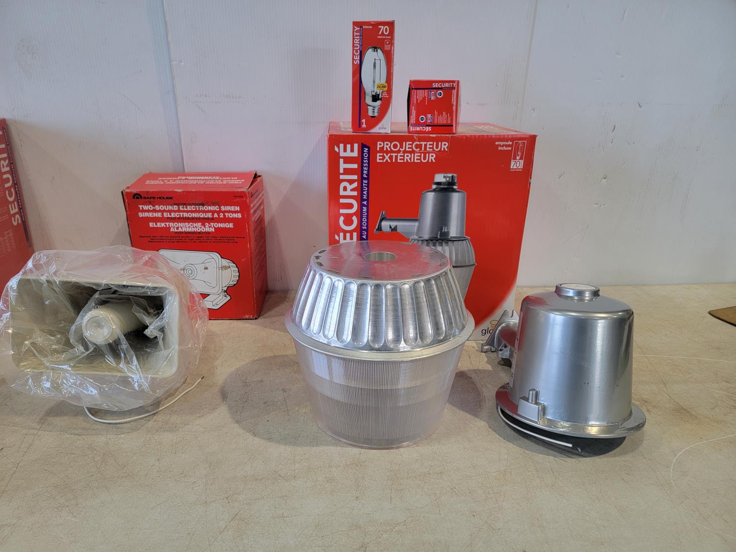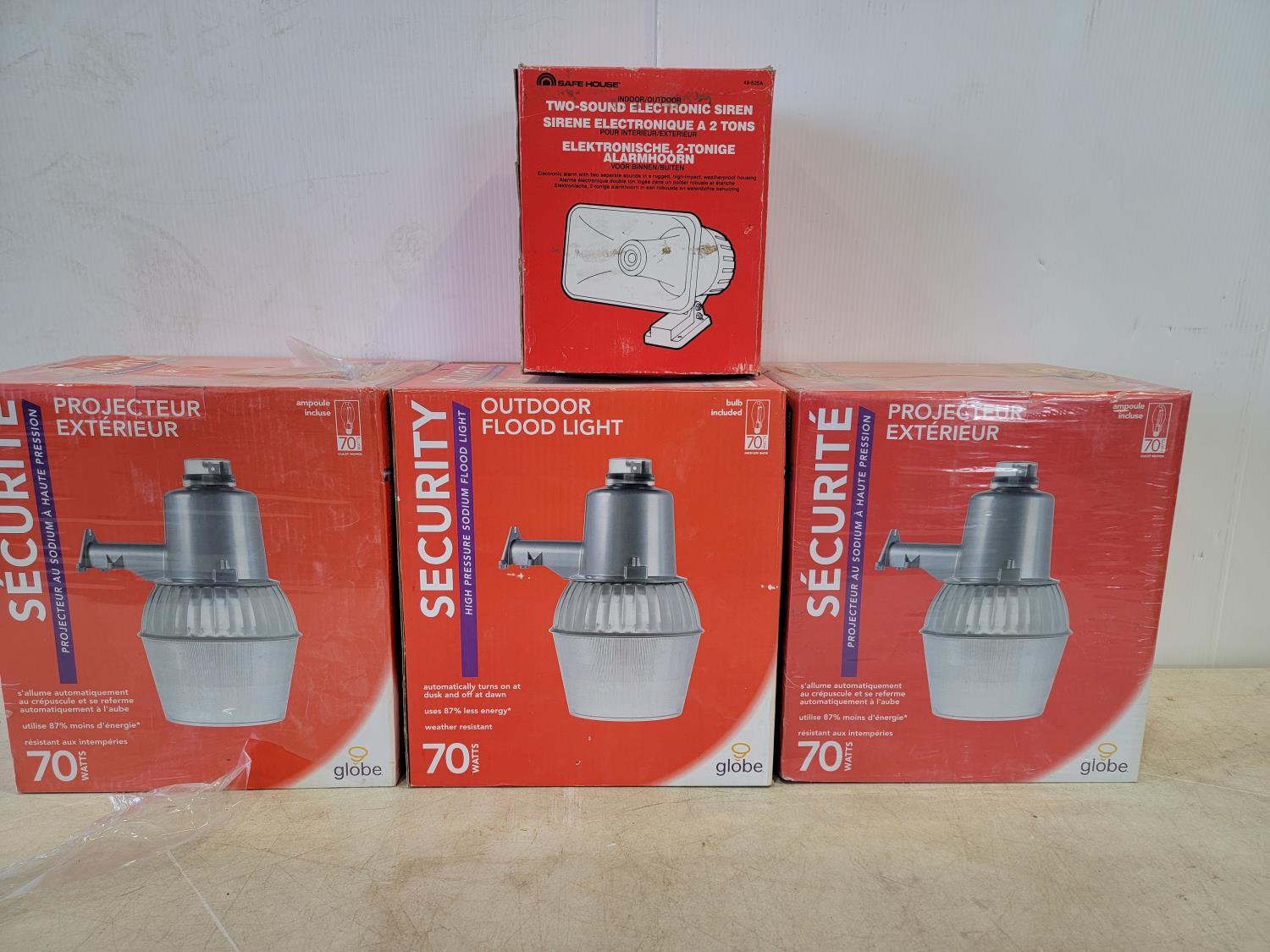 1158 (3) Security 70 Watt Outdoor Flood Lights and Safe House Electronic Siren