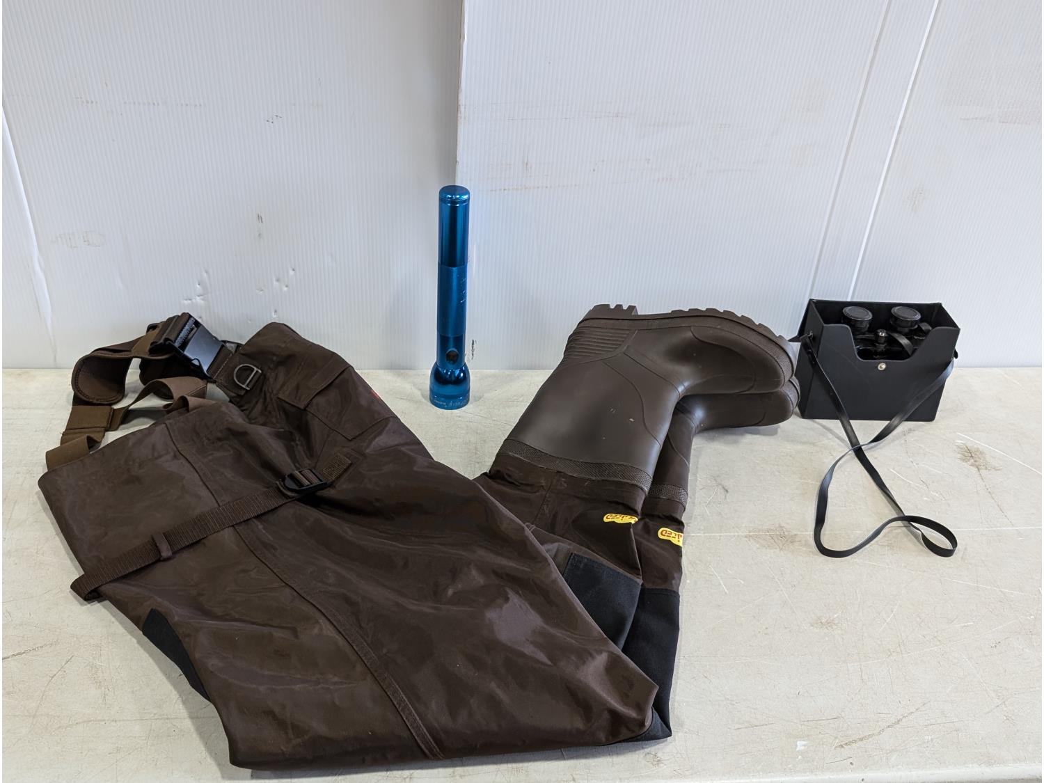 1148 Bushline outdoors Size 10 Hip Waders, Maglite and Bushell Binoculars