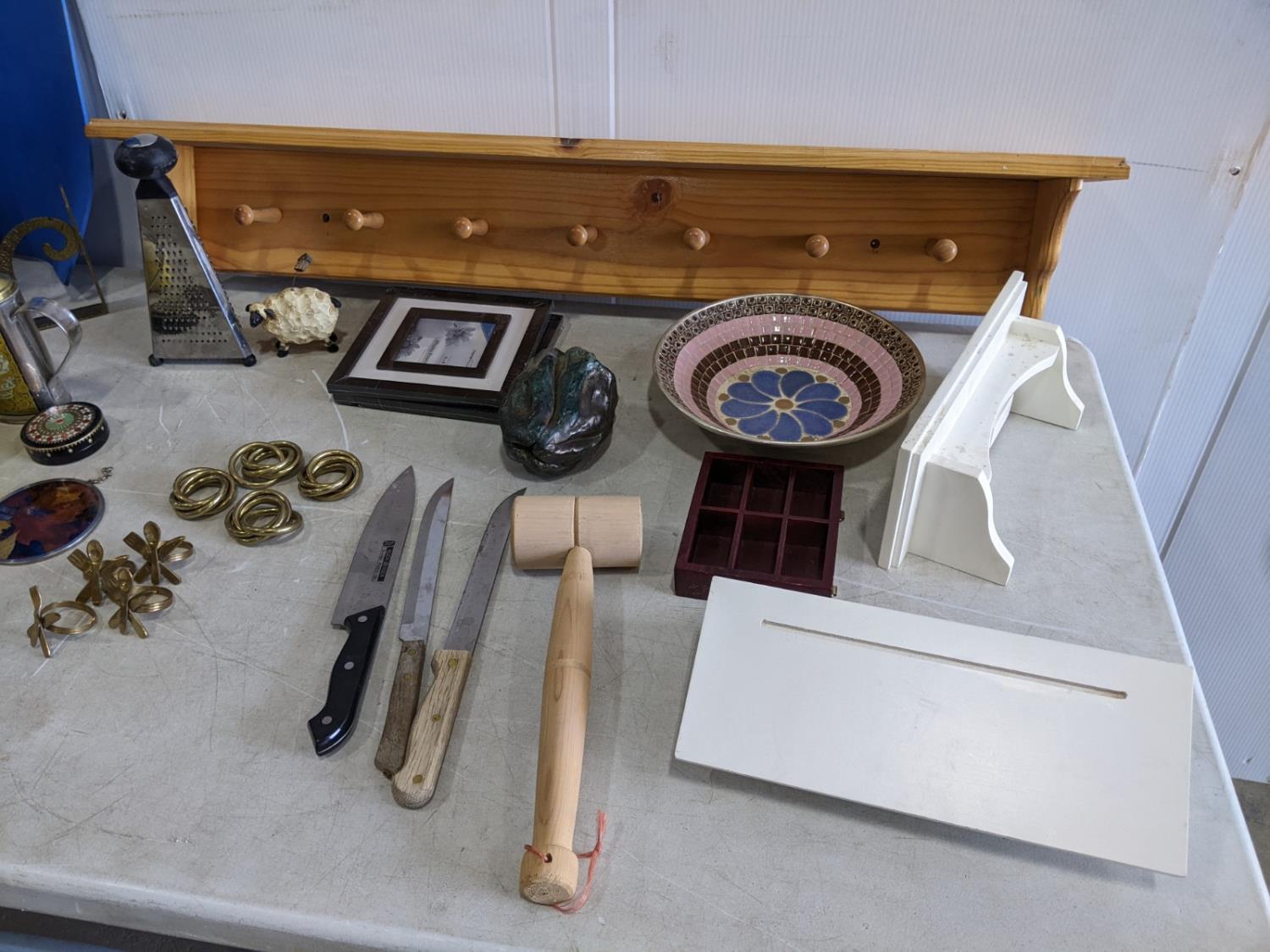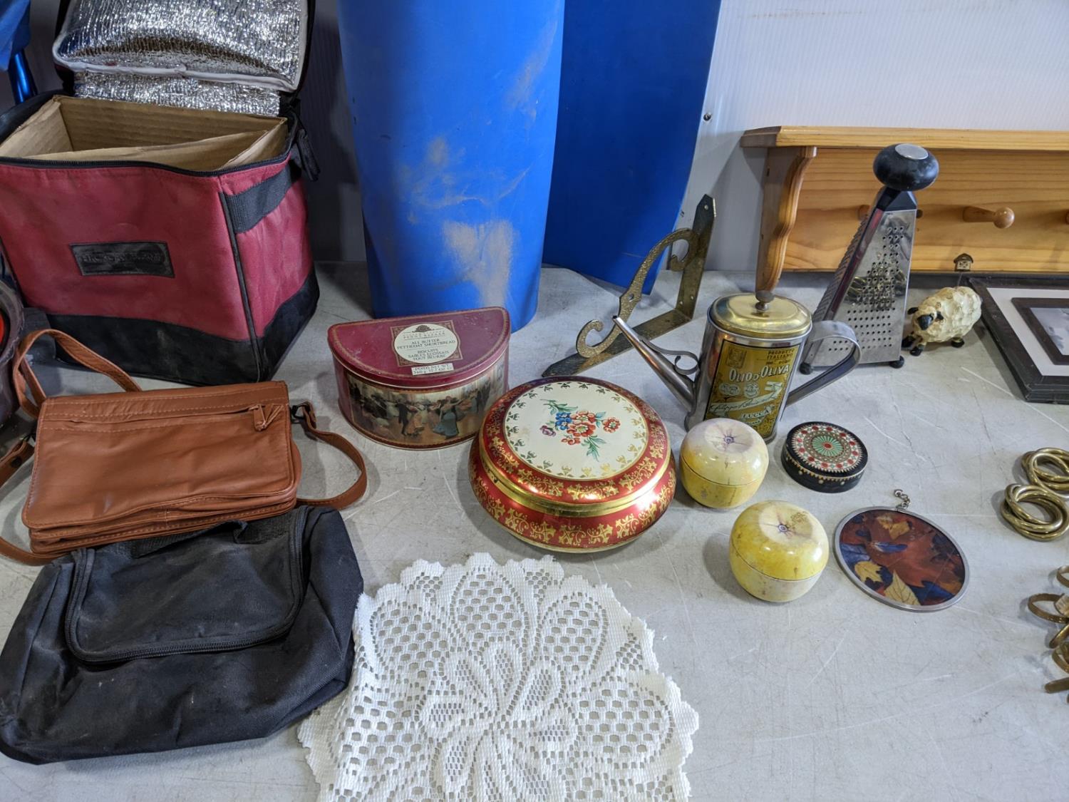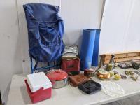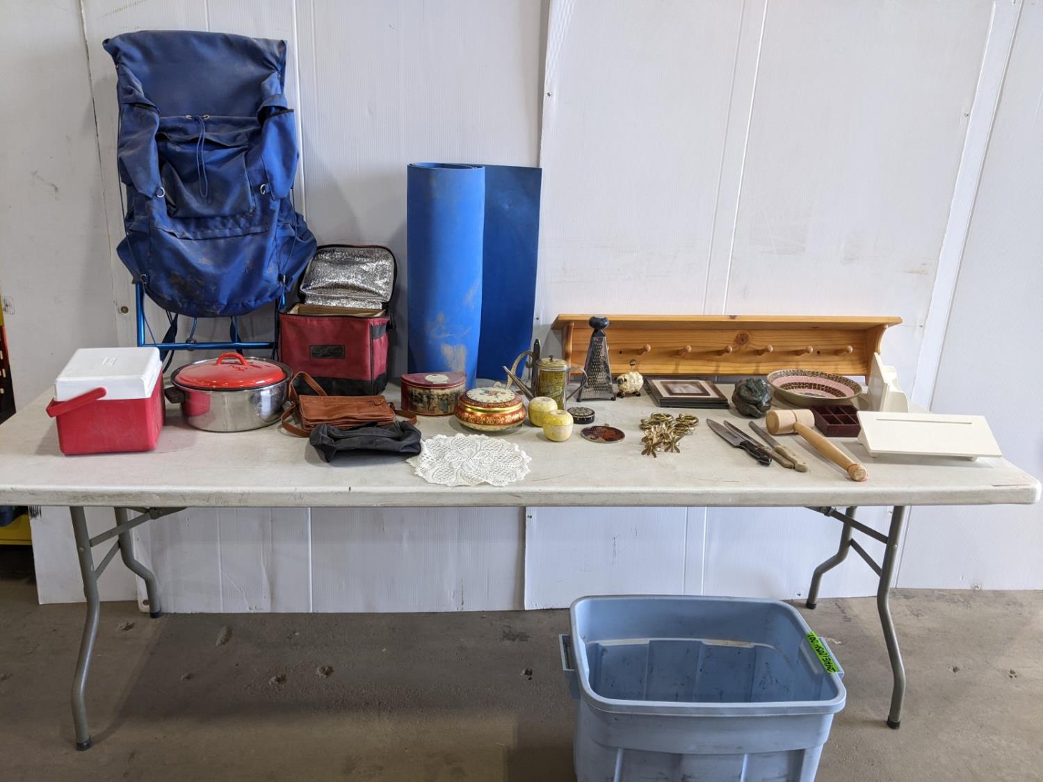 ridged frame backpack, cooler, assorted tins, utensils wall shelves