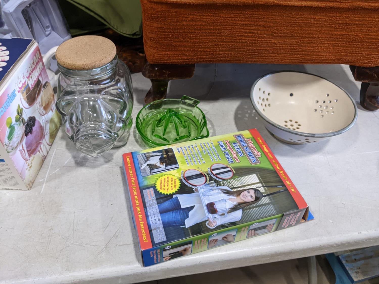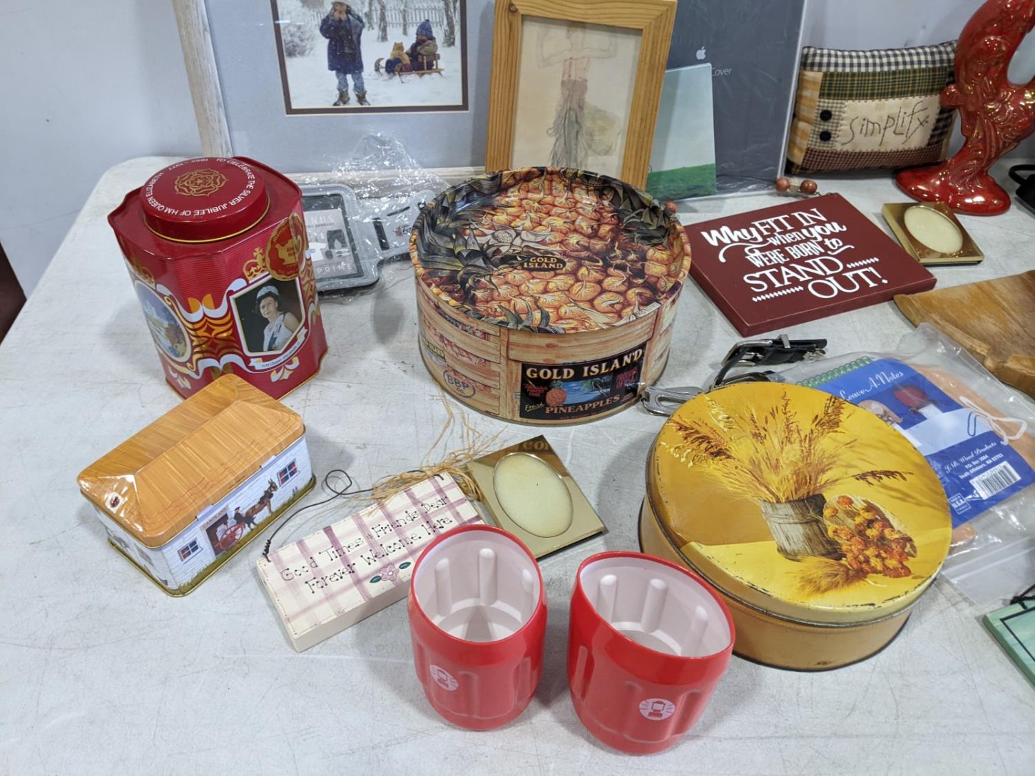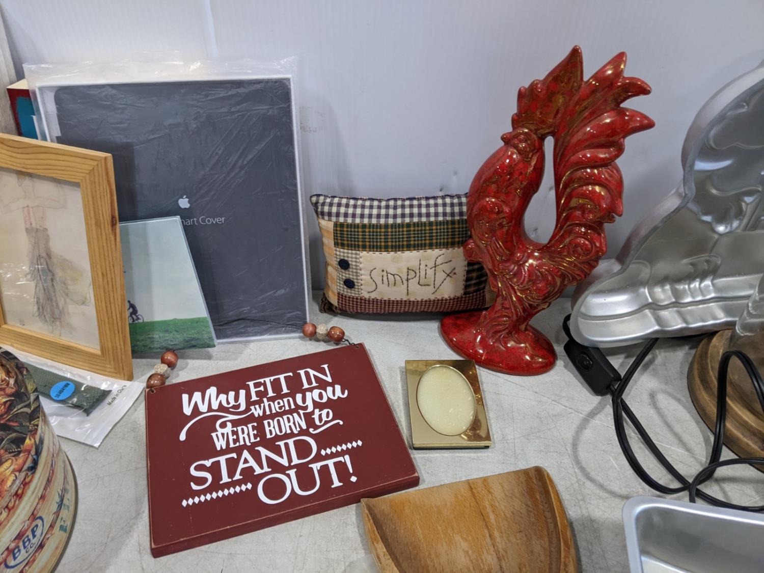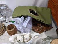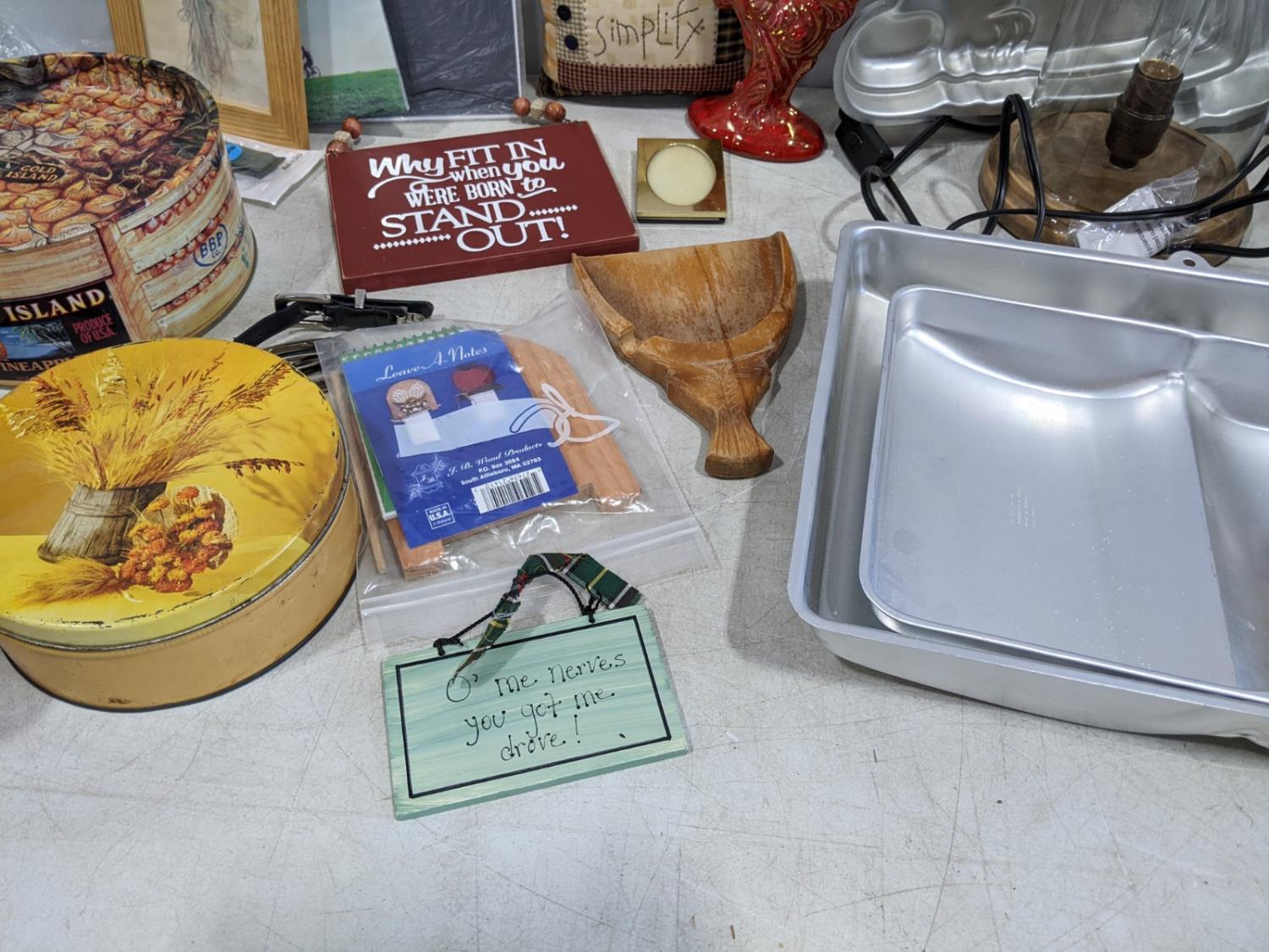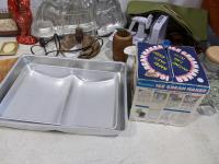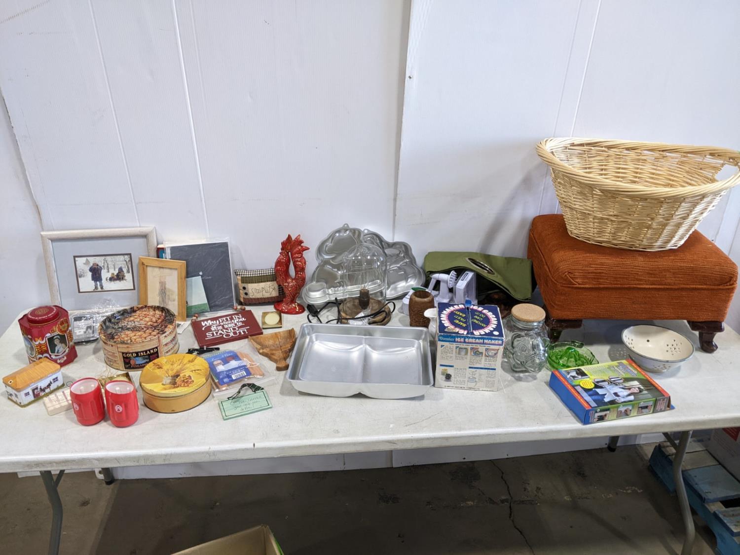tins, ipad cover, baking pans, foot stool, basket