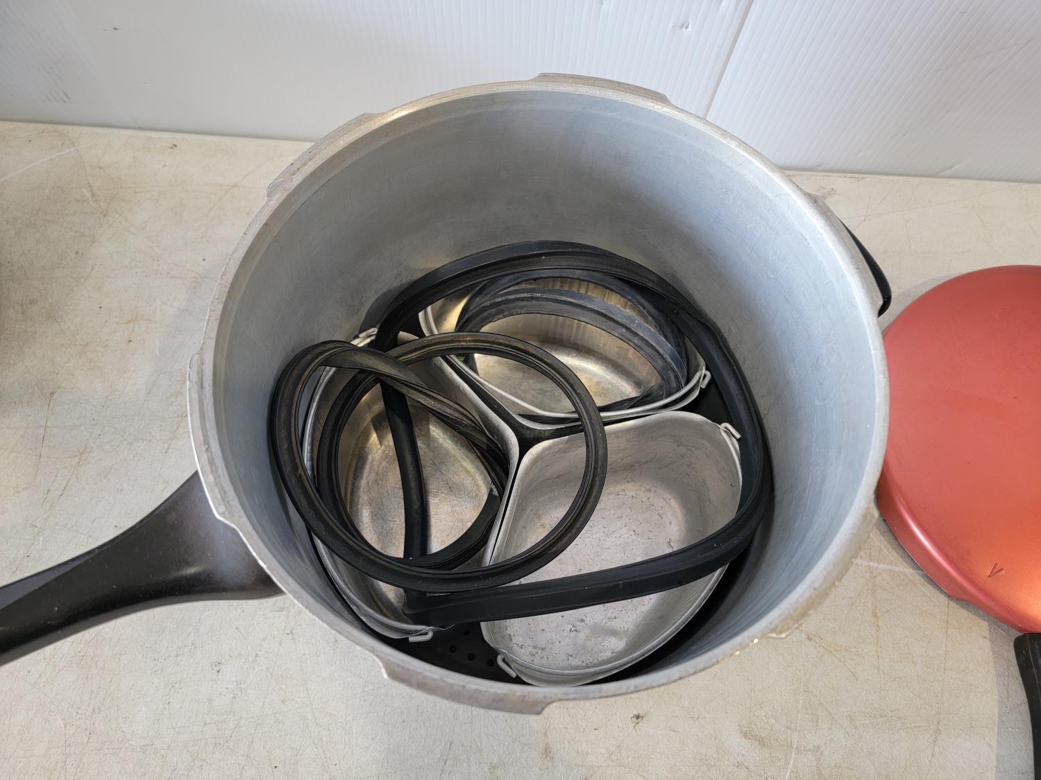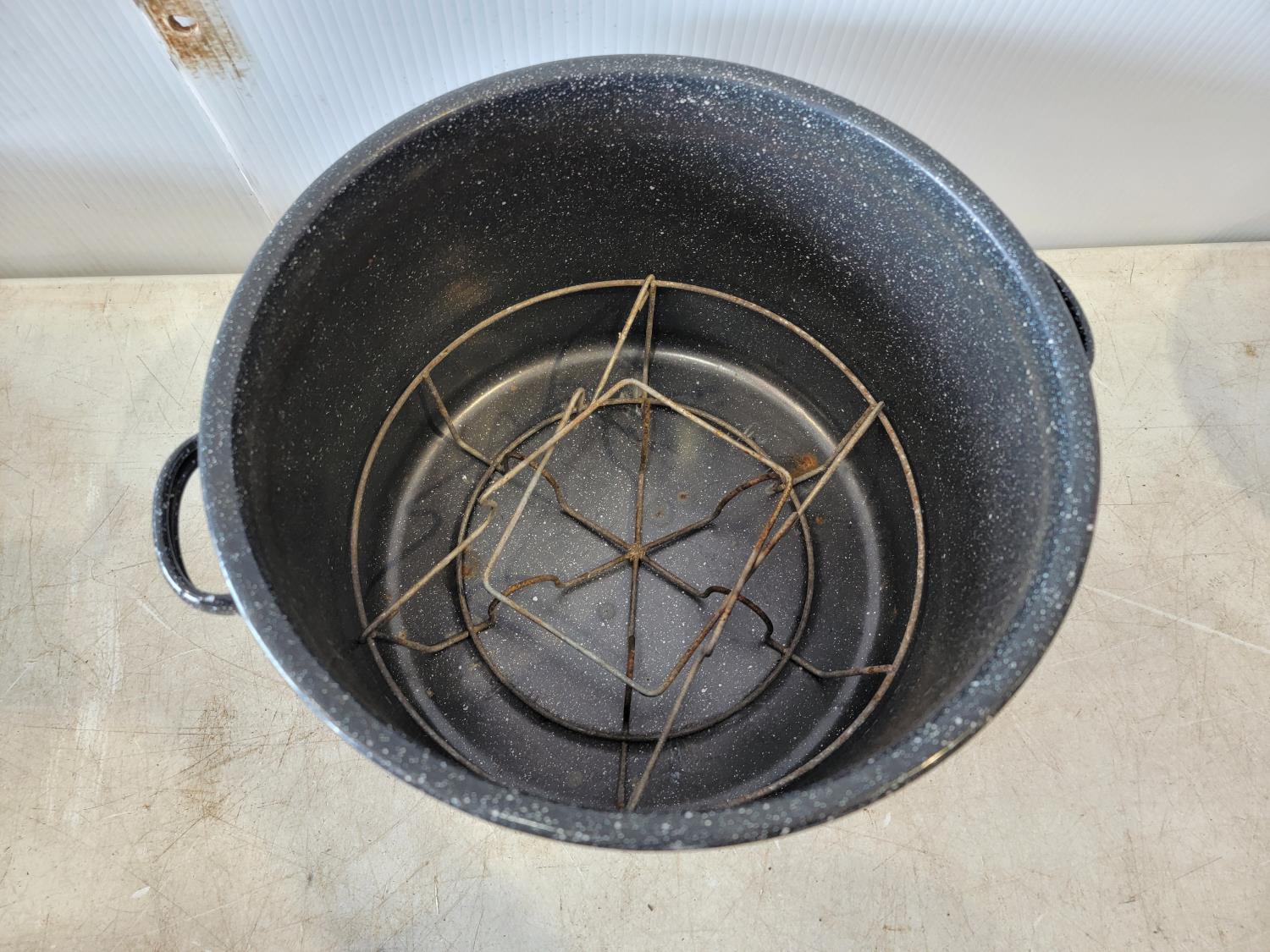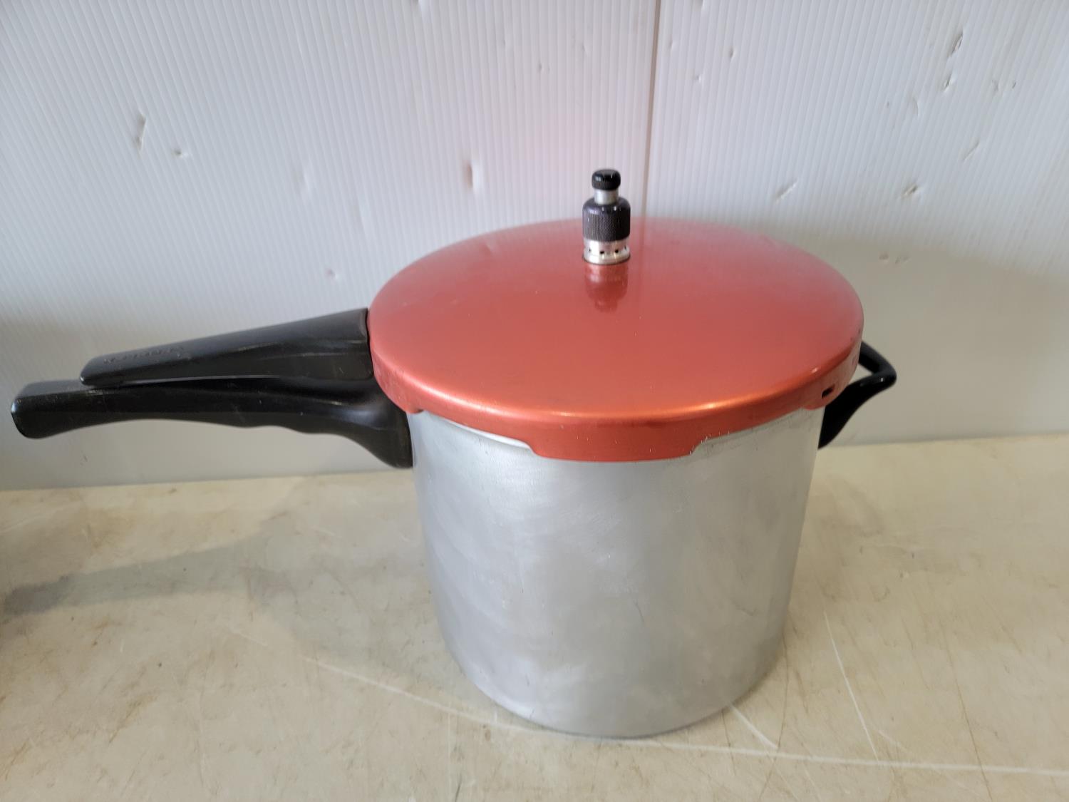 Teledex Pressure Cooker, canning pot and (12) jars, Fischer Scientific precision triple beam balance scale, 18 inch laminated wood bathroom basin