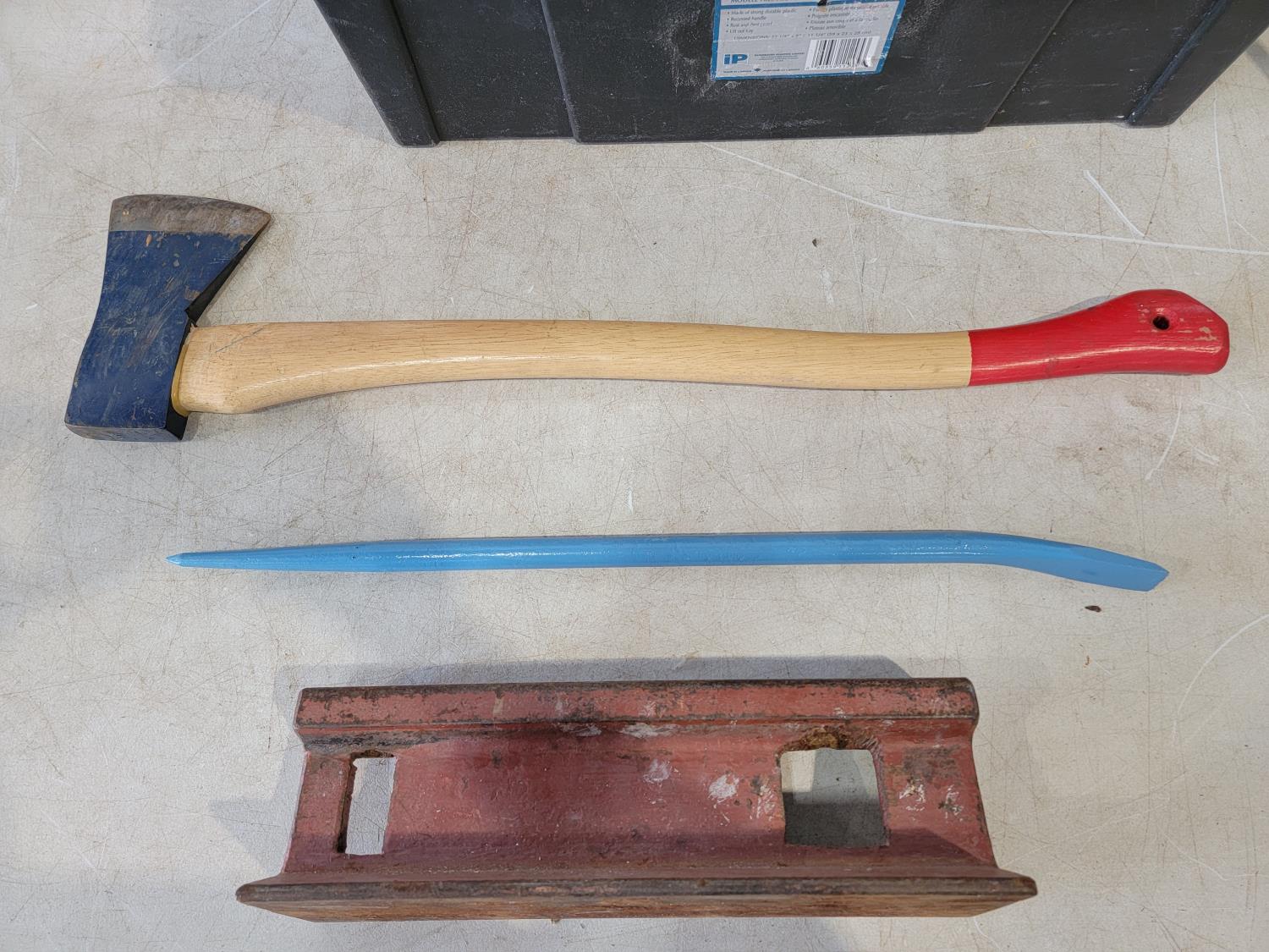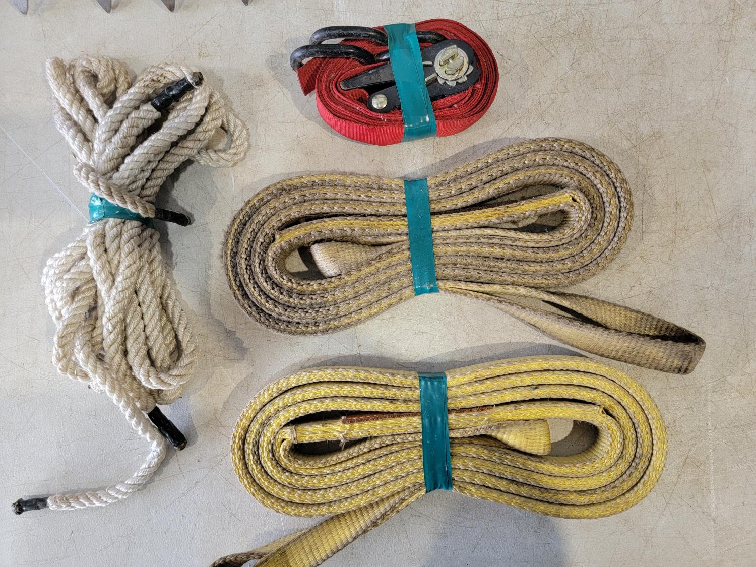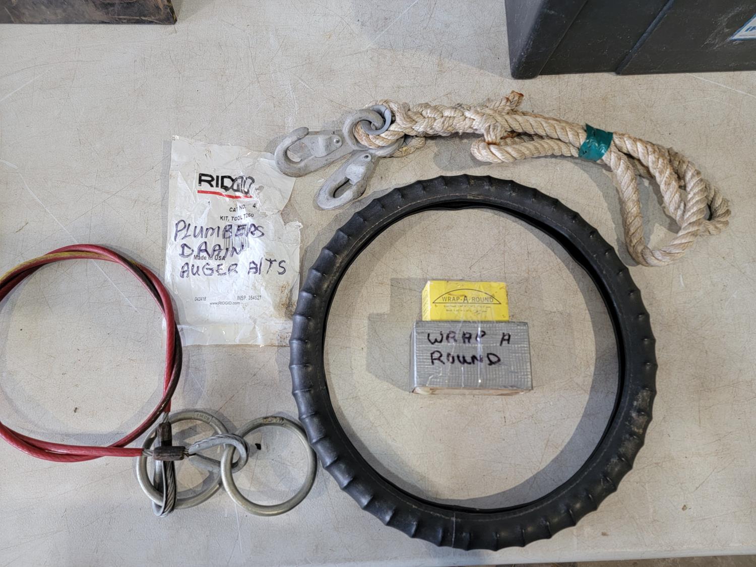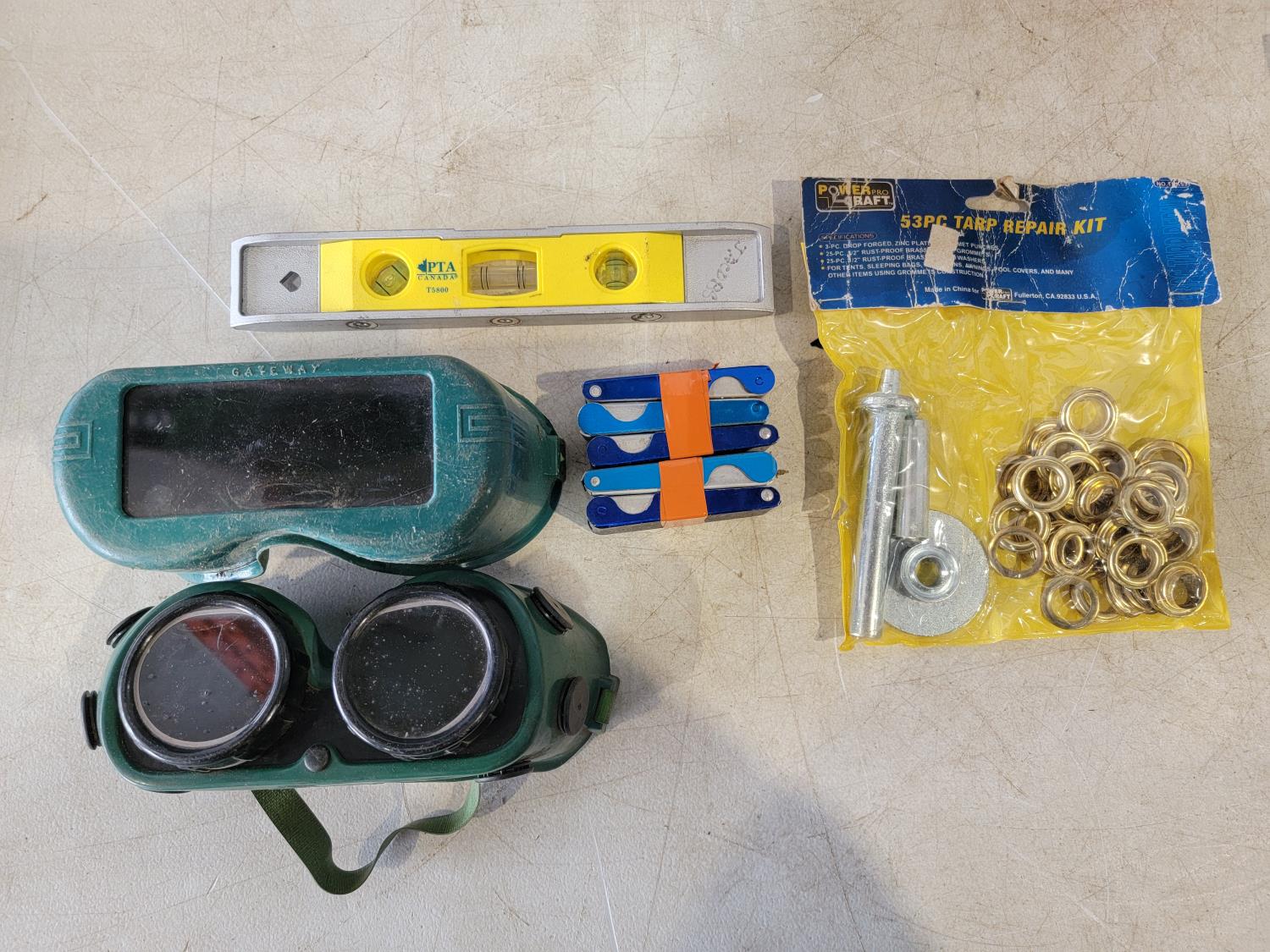 hydraulic jack, axe, grease gun, ropes, slings, (2) welding goggles, level, mud flaps, 23 inch toolbox, bolts, washers, tarp repair kit, plumbers drain auger bits, welder's tip cleaners, pitch fork, paint spray gun, tin snips