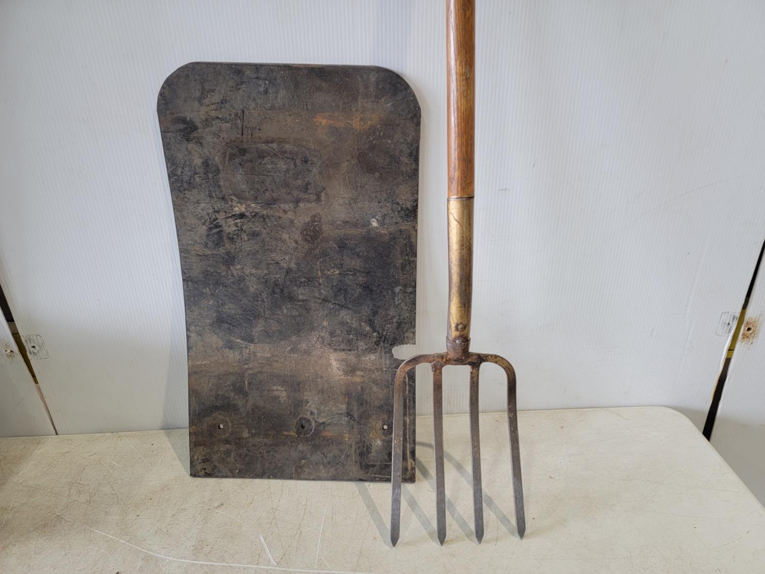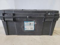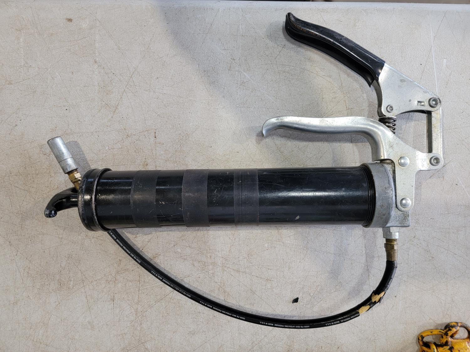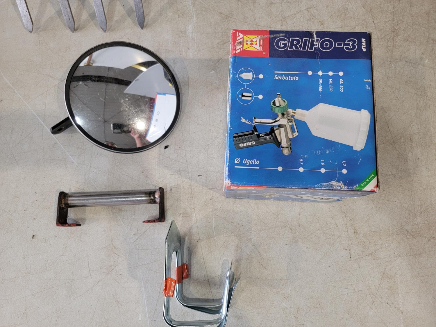 hydraulic jack, axe, grease gun, ropes, slings, (2) welding goggles, level, mud flaps, 23 inch toolbox, bolts, washers, tarp repair kit, plumbers drain auger bits, welder's tip cleaners, pitch fork, paint spray gun, tin snips