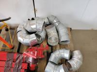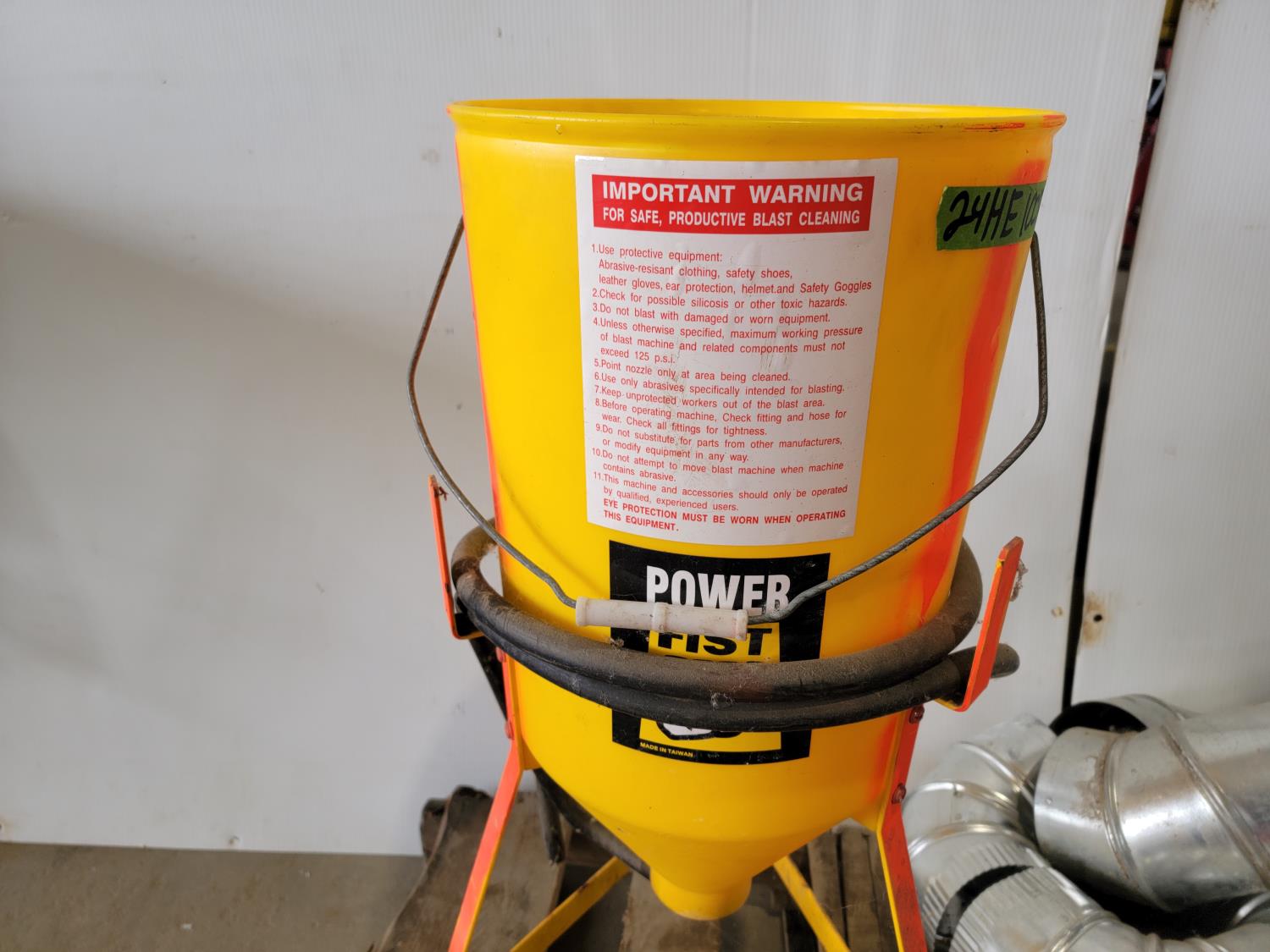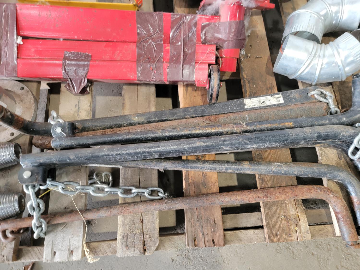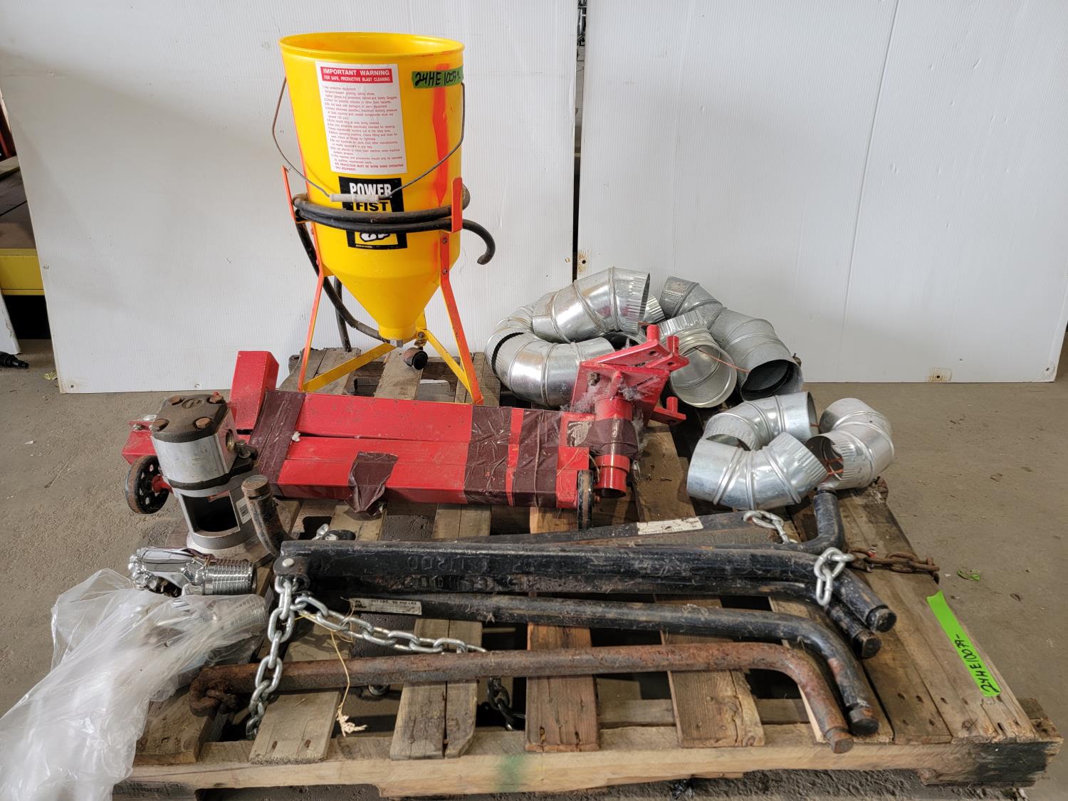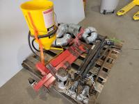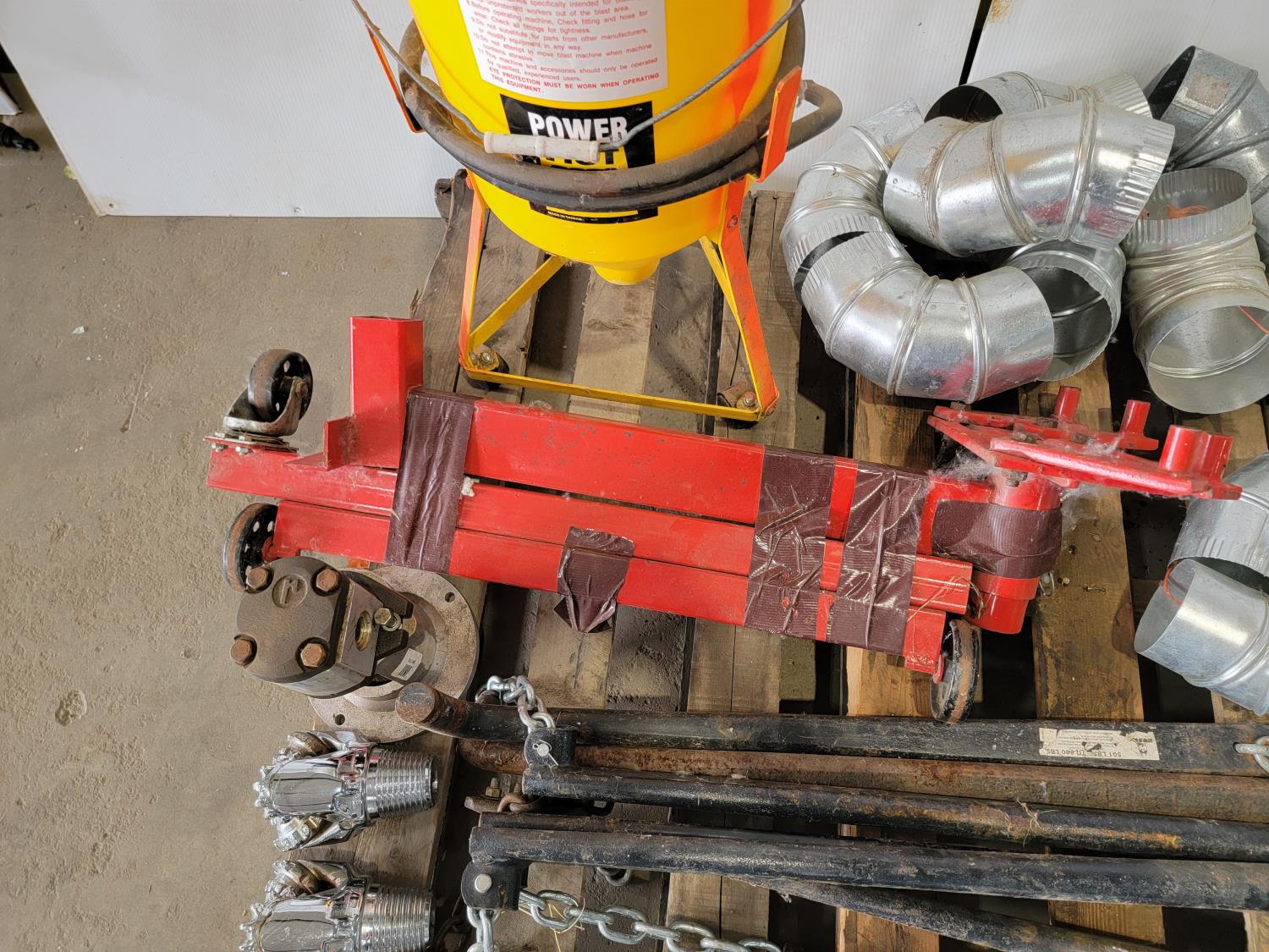 (2) drill bits, engine stand, duct fittings, Power Fist sandblast pot, trailer sway bars