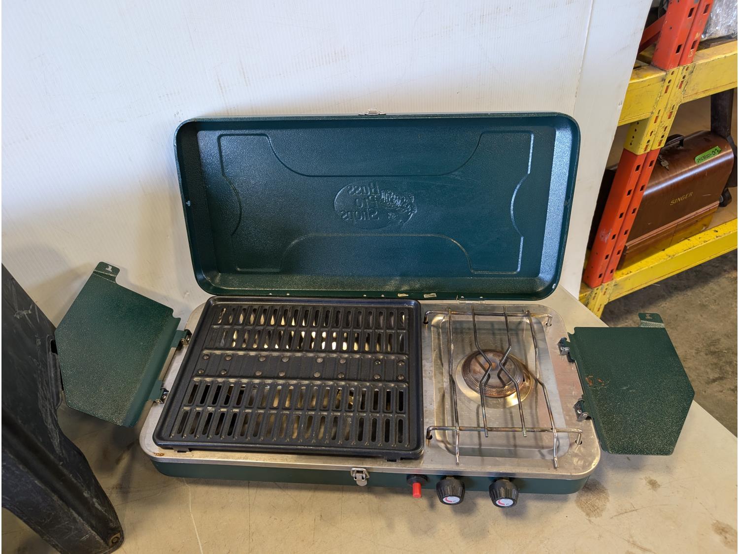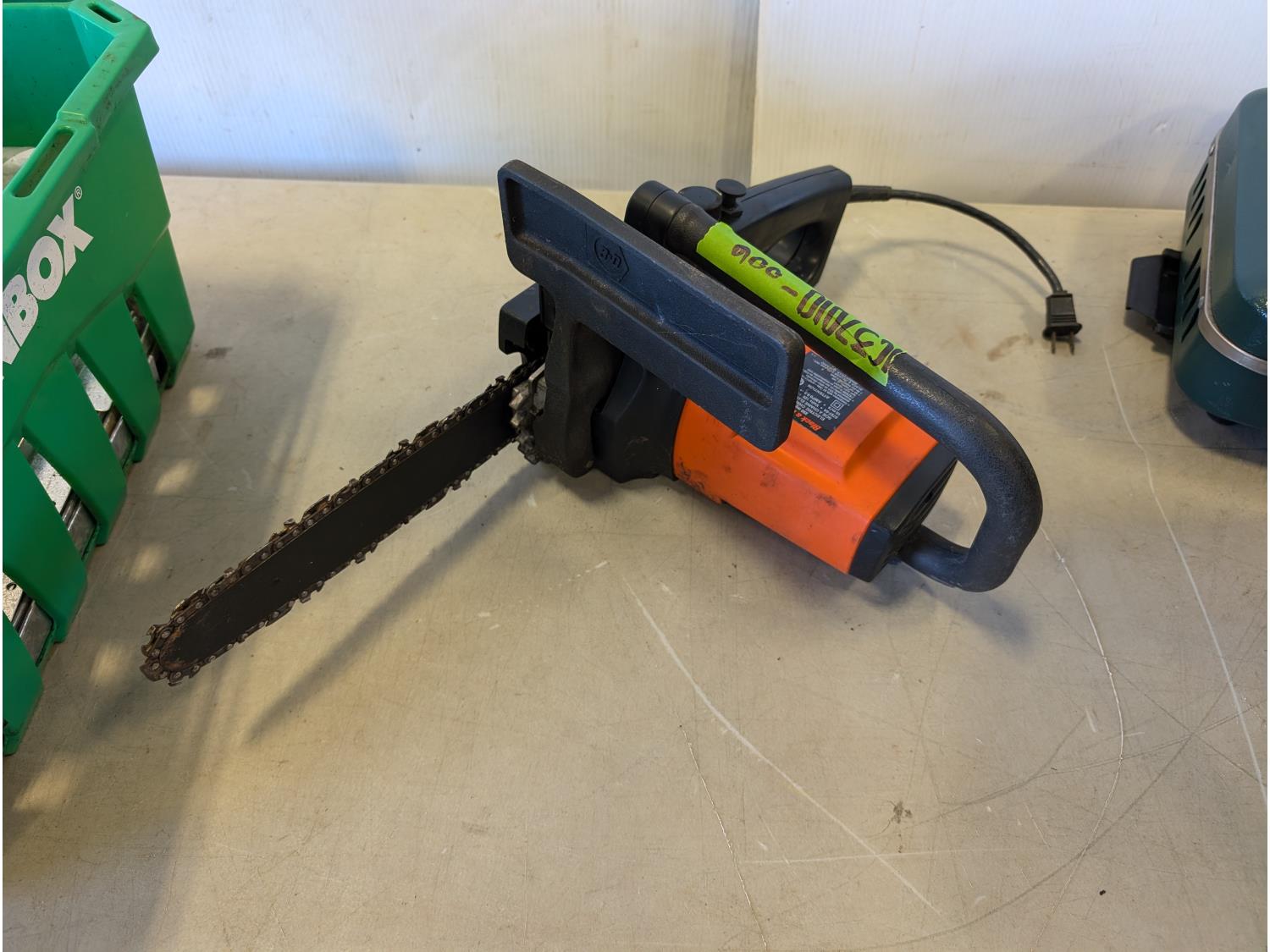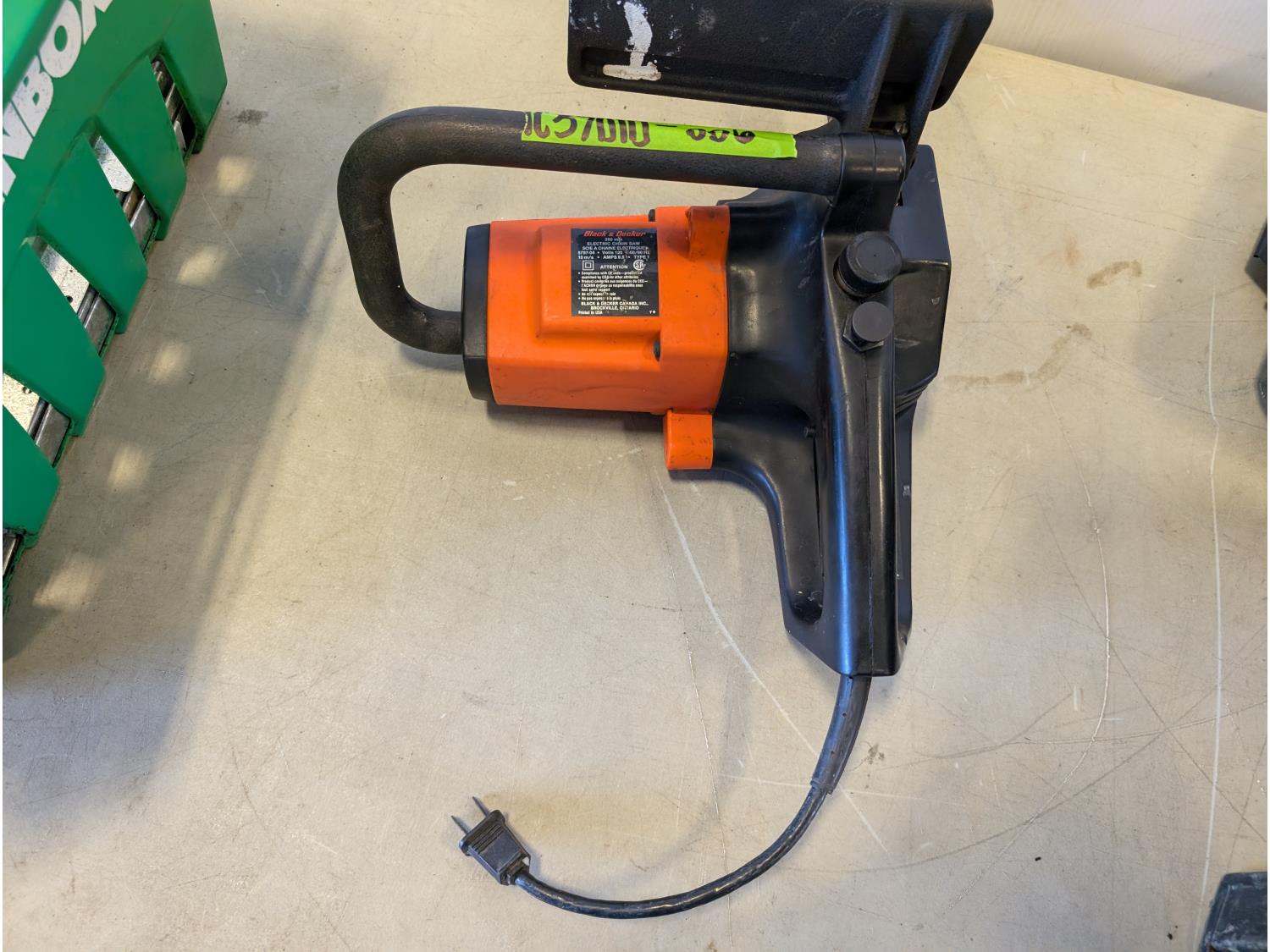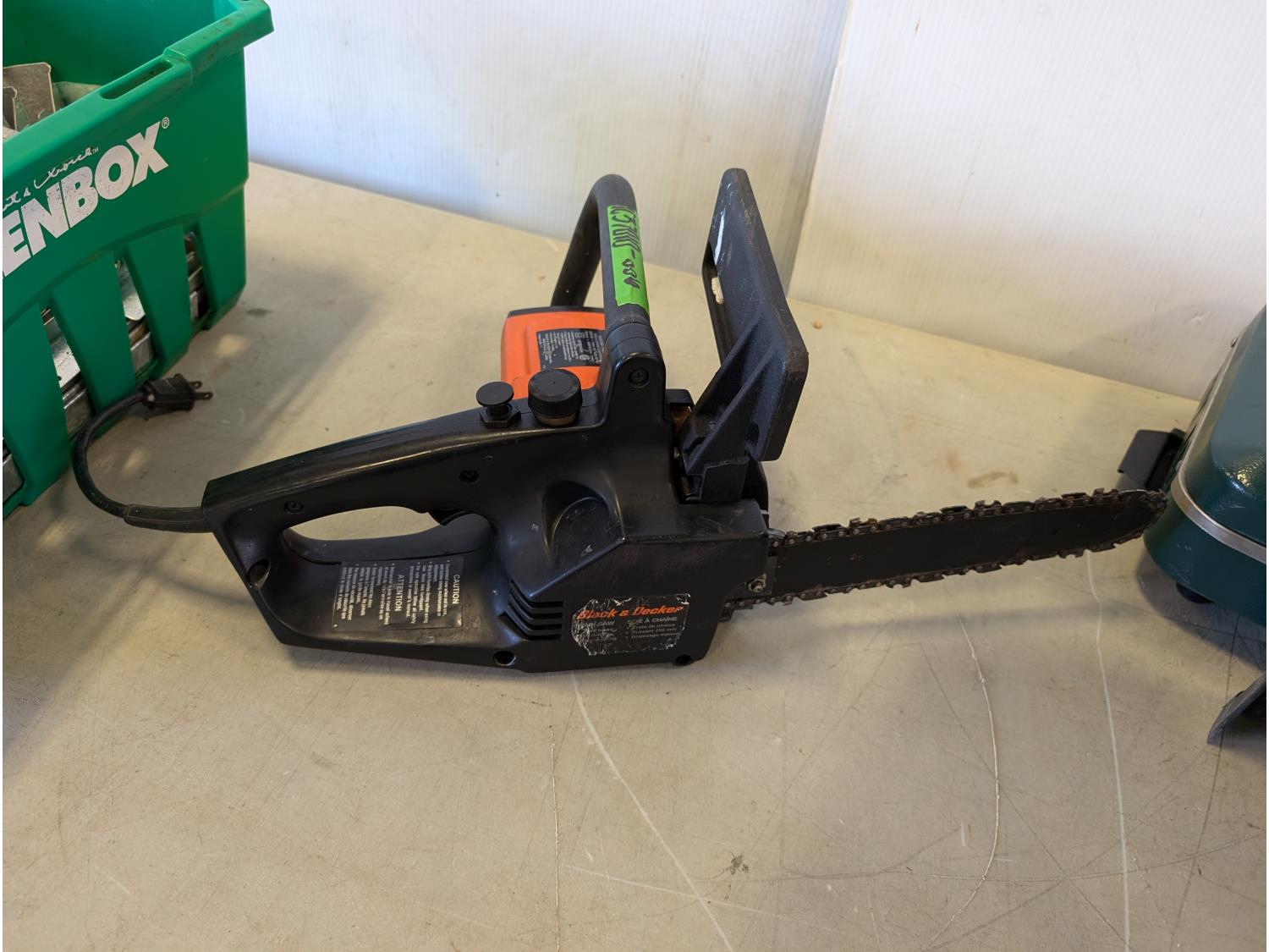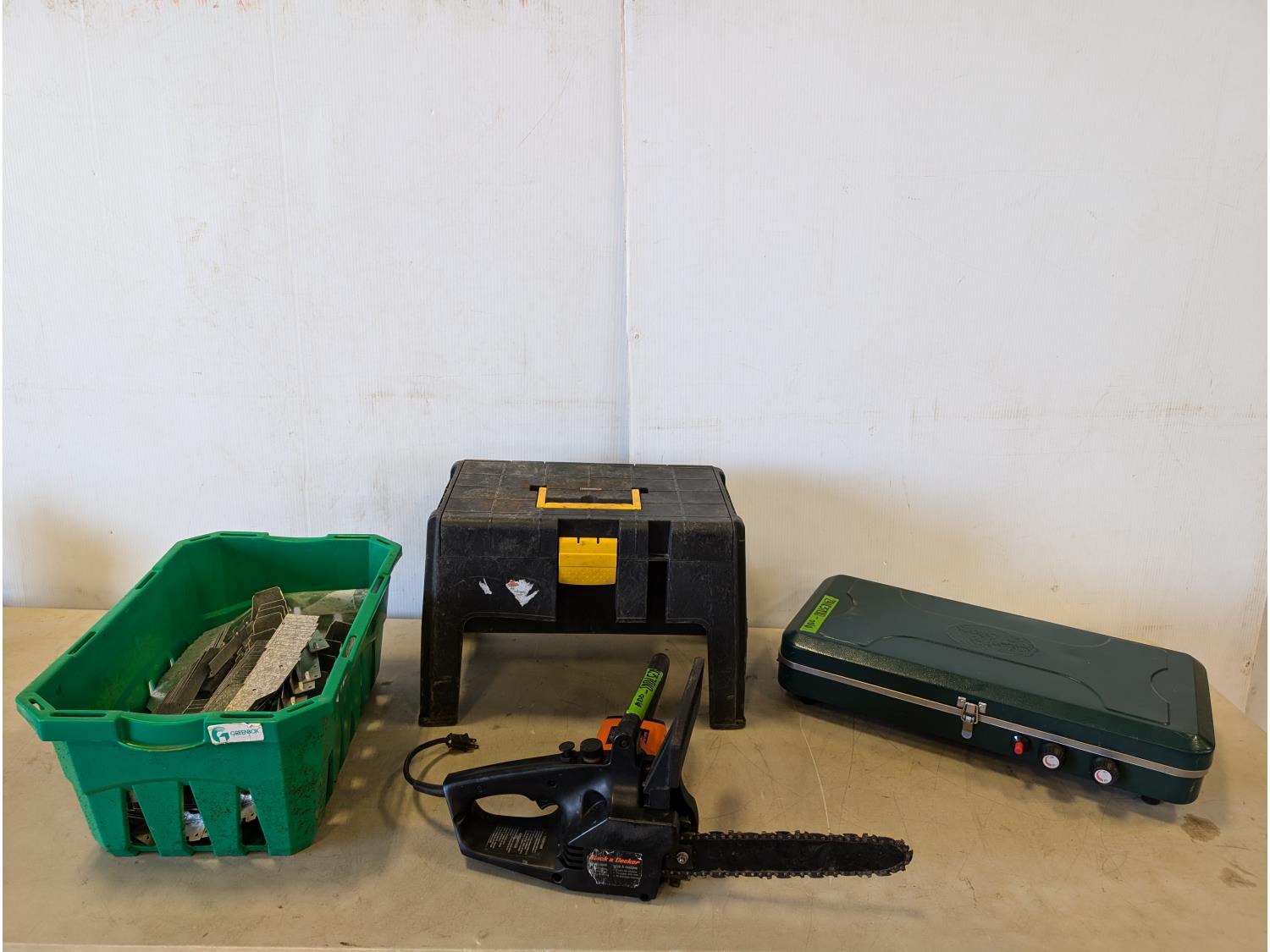 5330 Bass Pro Shops Propane Camp Stove, Black & Decker Electric Chainsaw, Step Tool Box and Qty of Joist Hangers