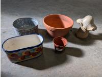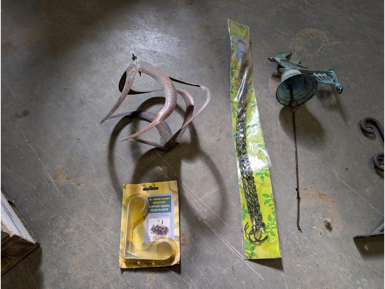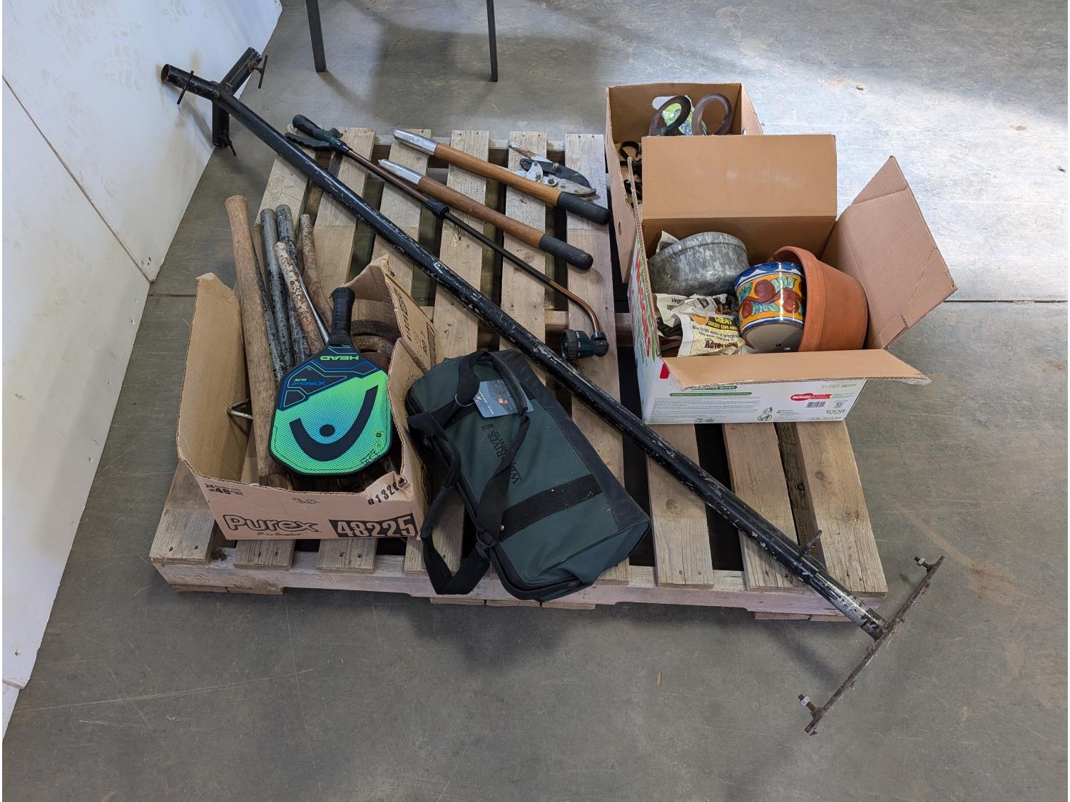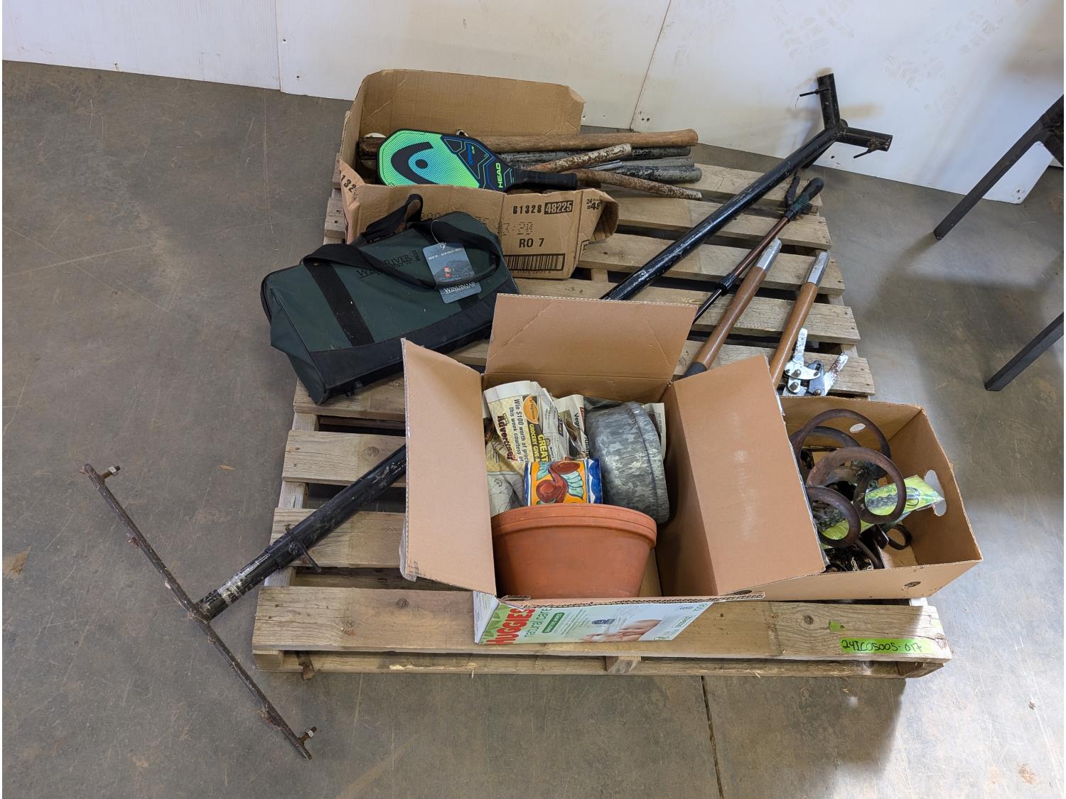 Patio chair, horseshoe game, bocce ball set, plant pots, garden decor