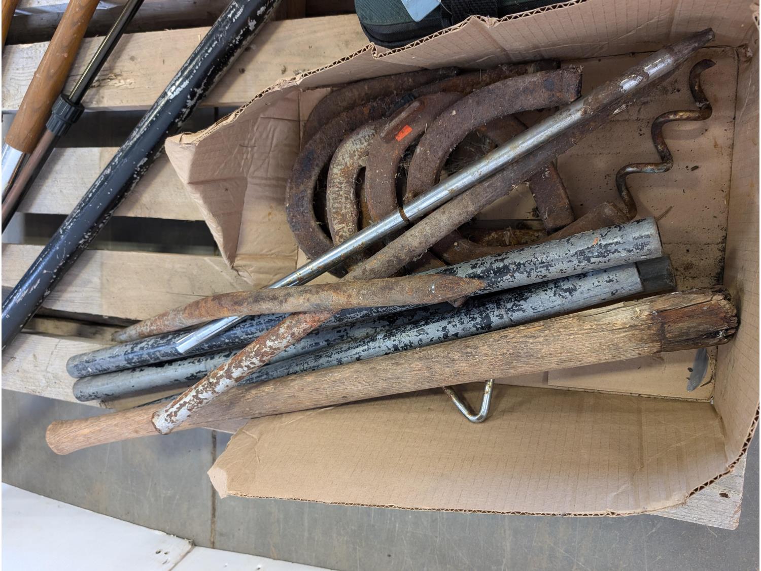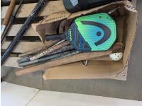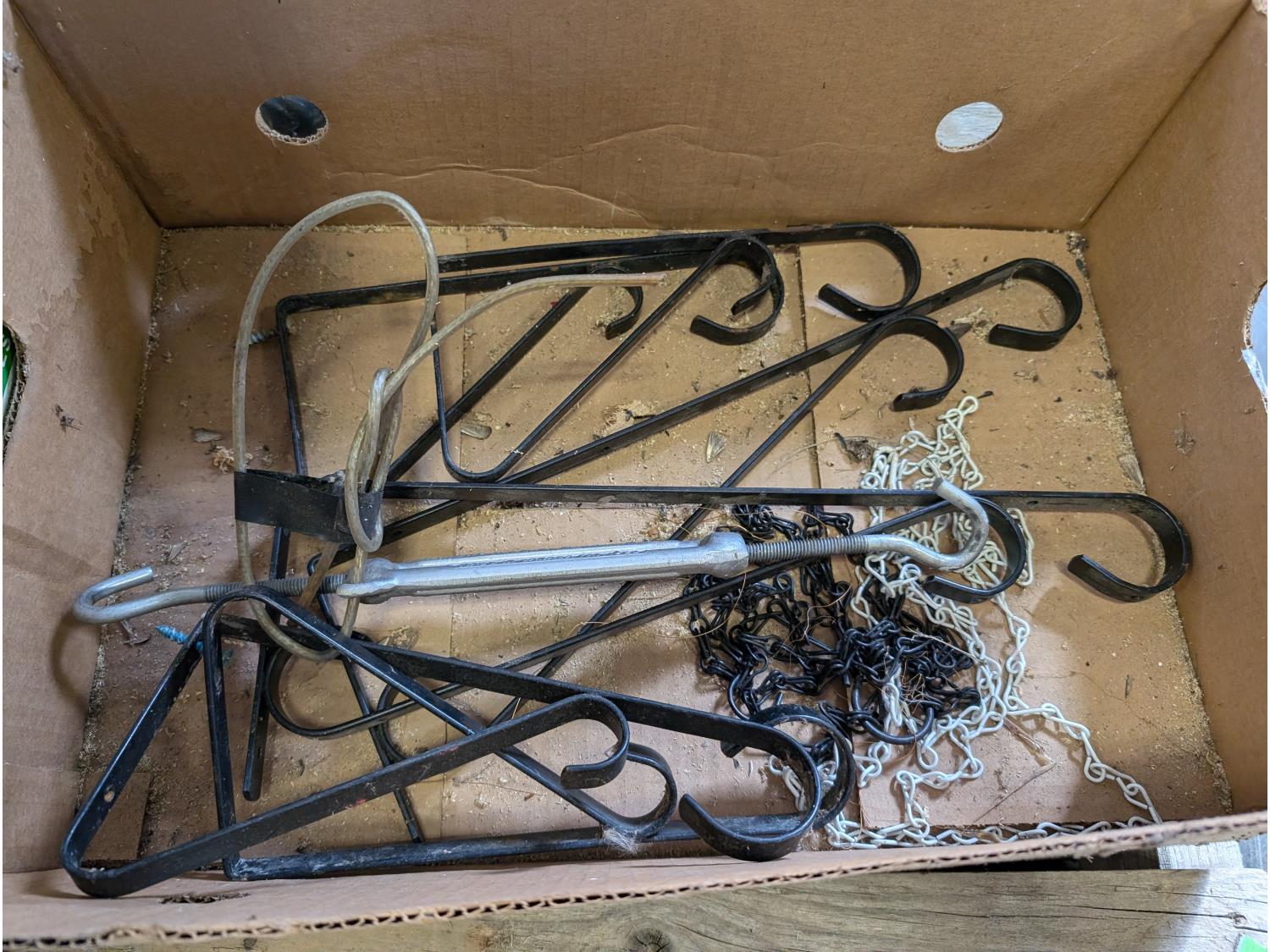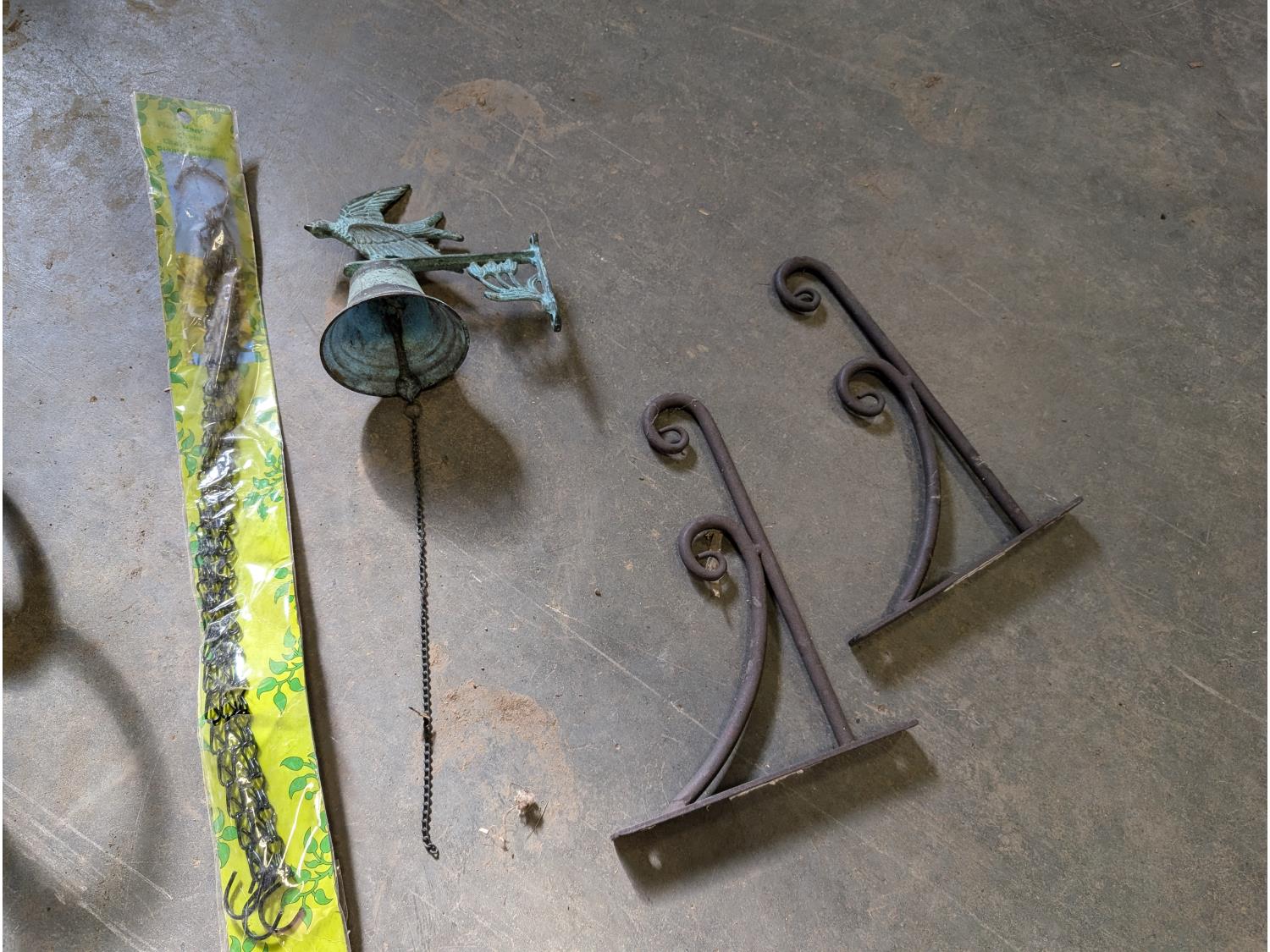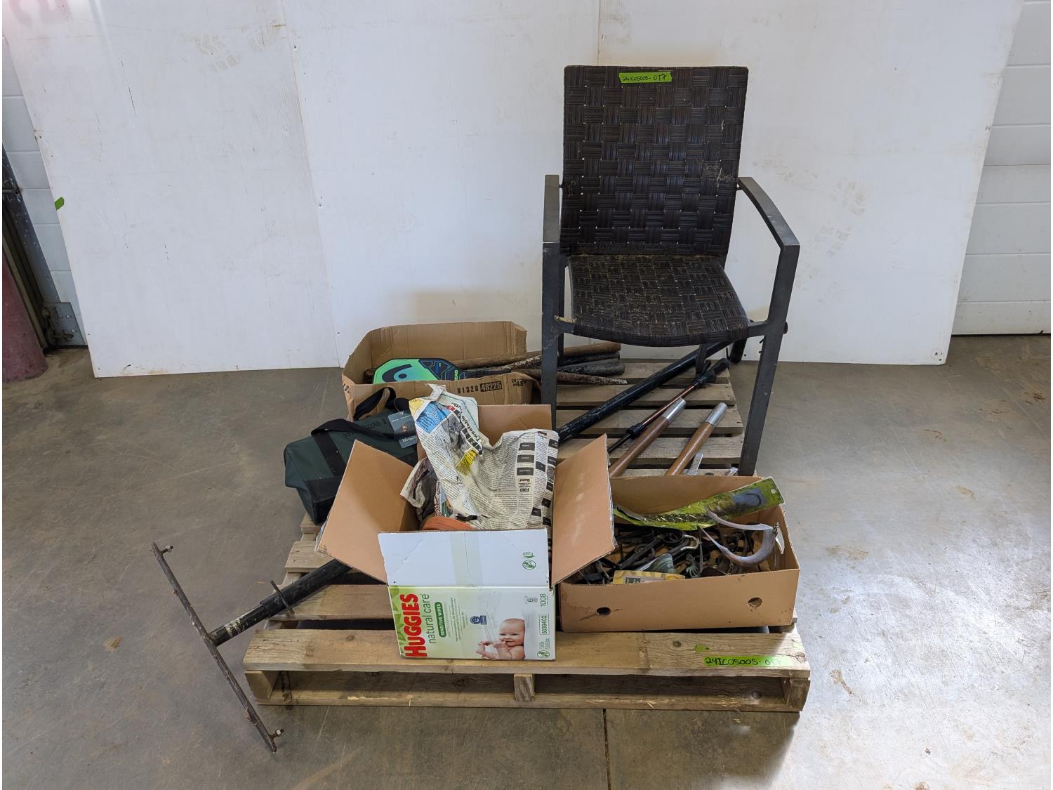 Patio chair, horseshoe game, bocce ball set, plant pots, garden decor