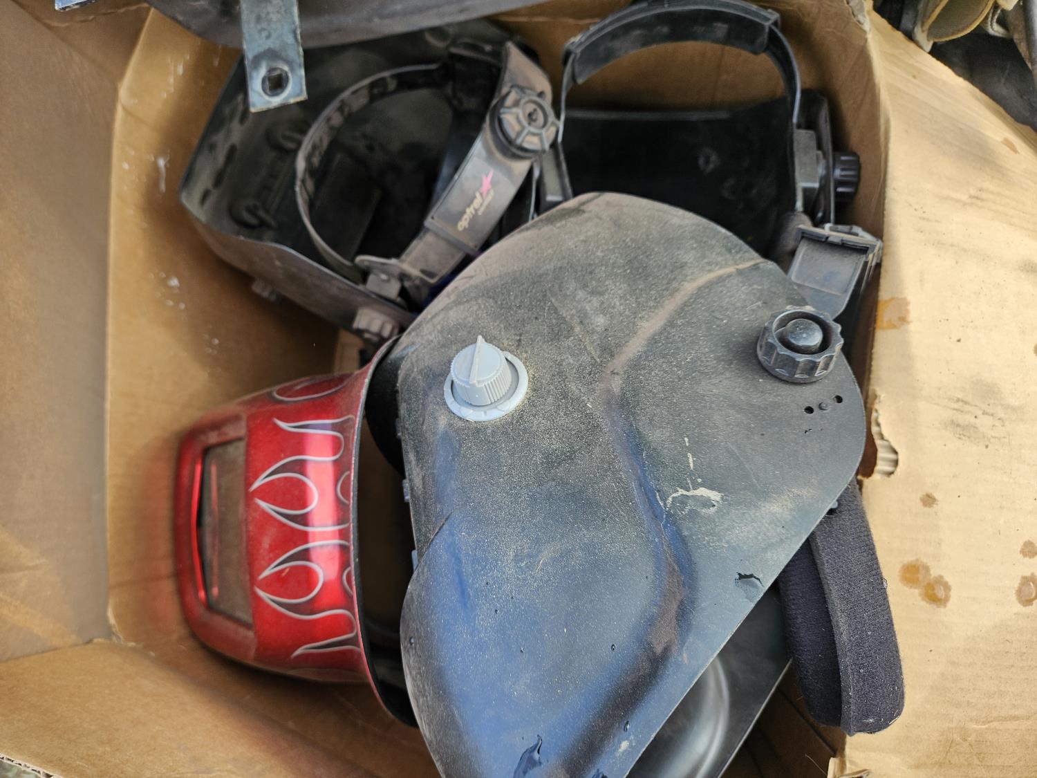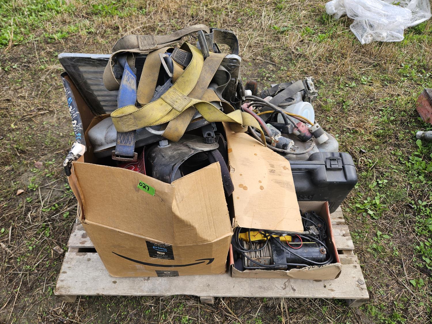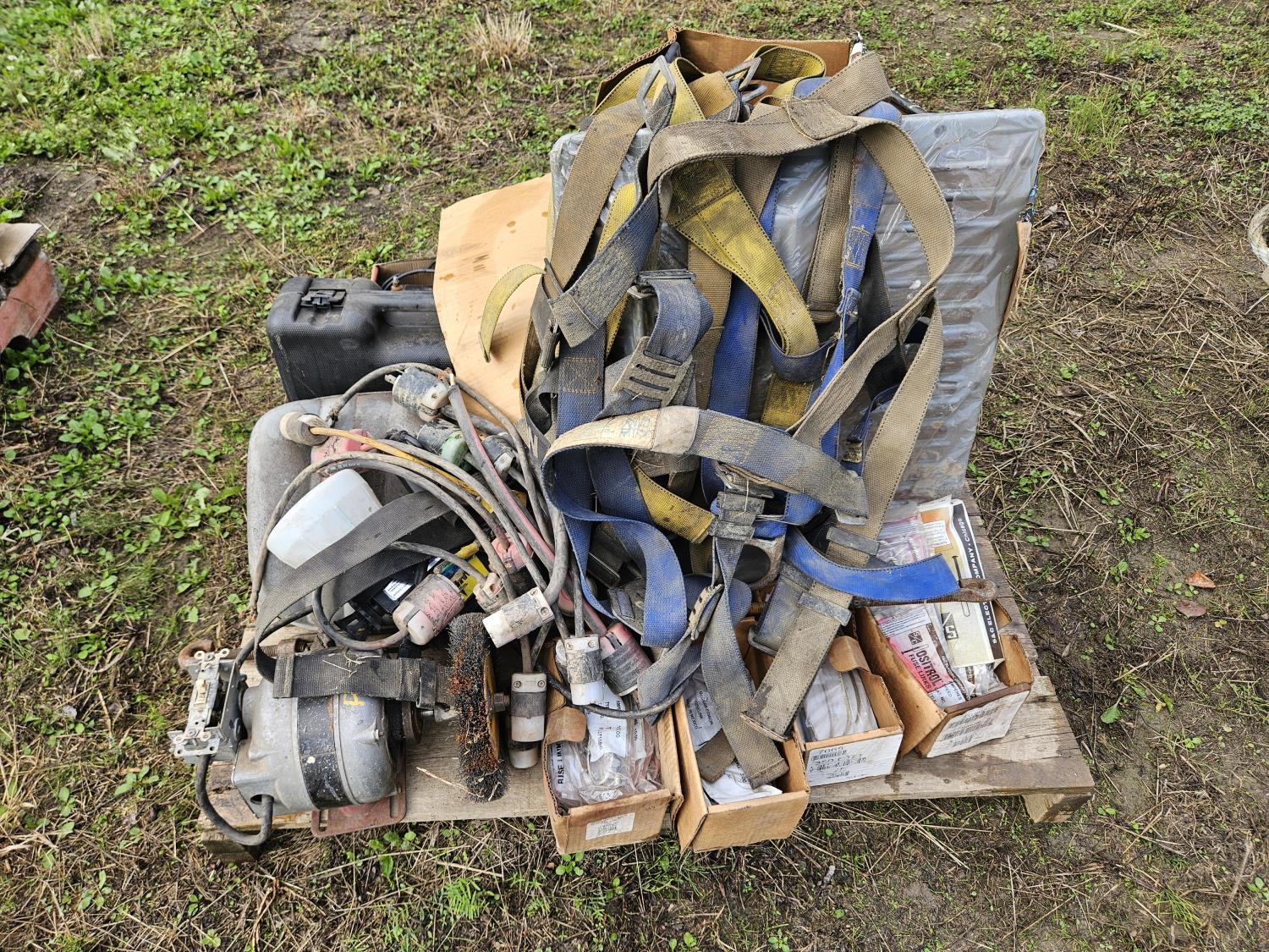 Welding helmets, shop built bench grinder, climbing harness, 12 V winch, poly case, Wagner paint sprayer, fuse links