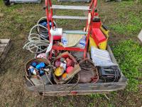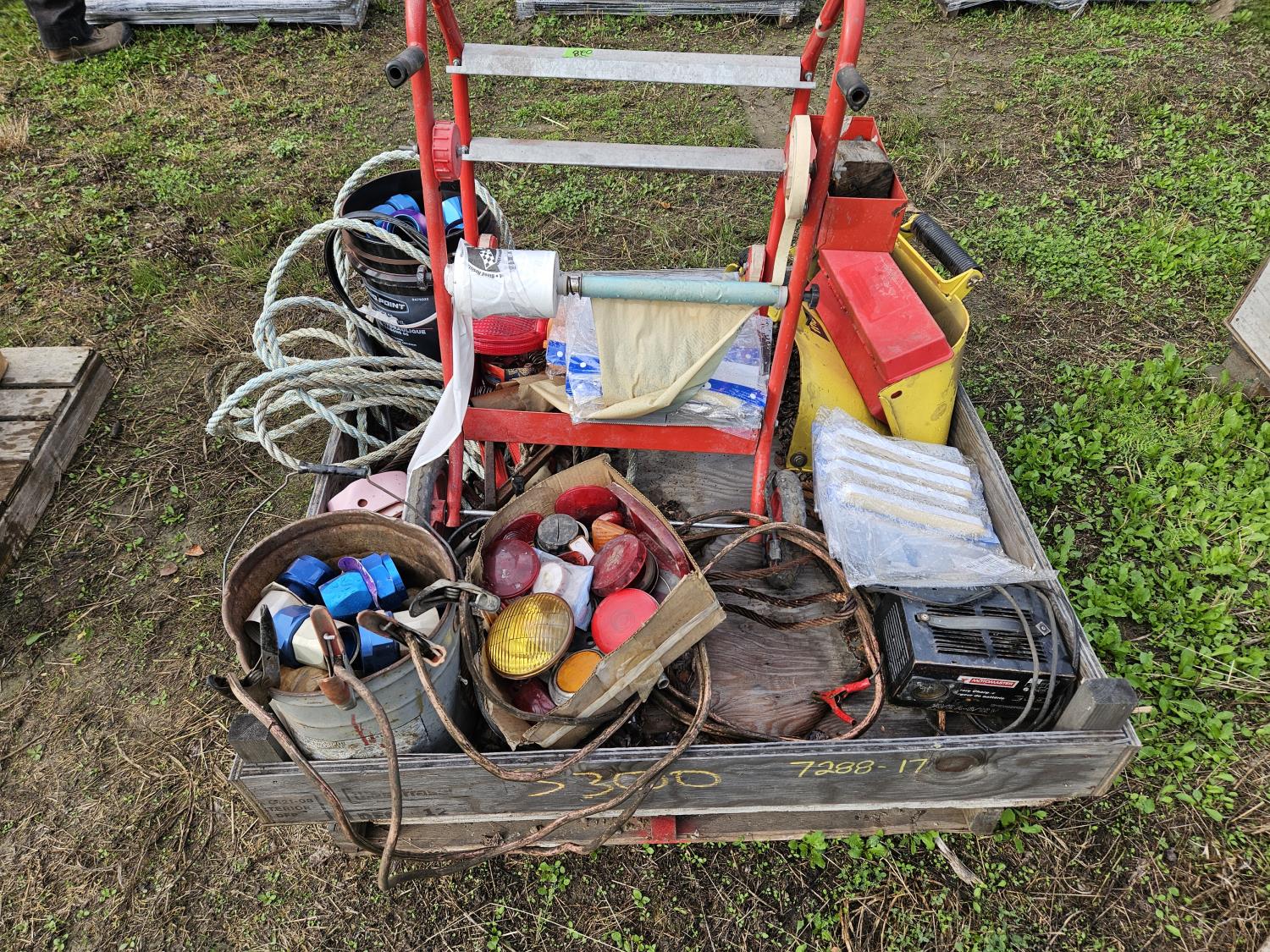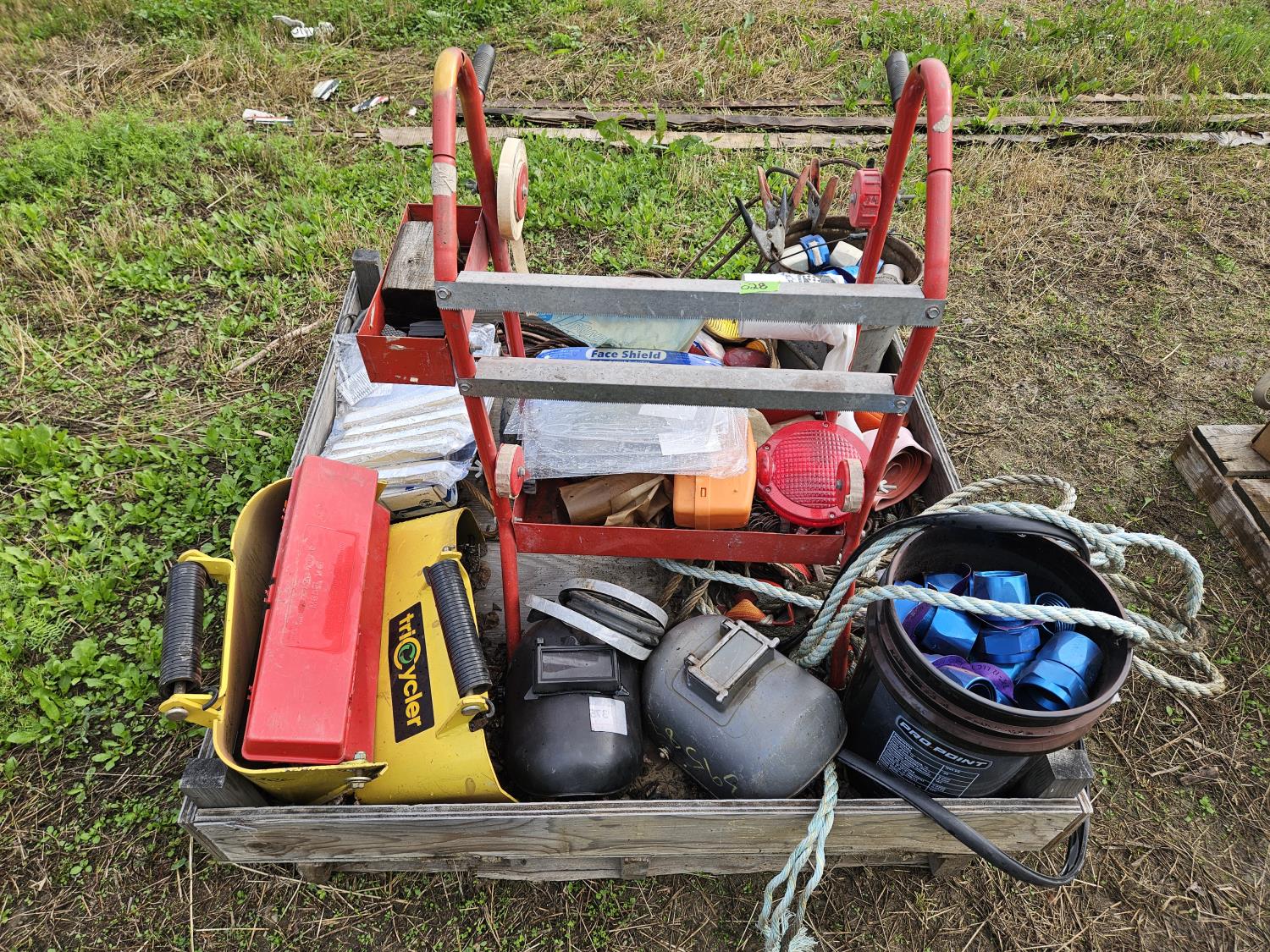 Hose fittings, welding helmets, lights, battery charger, tricycler, booster cables, spool dolly, rubber gasket, climbing lanyard with breakaway, face shield replacements