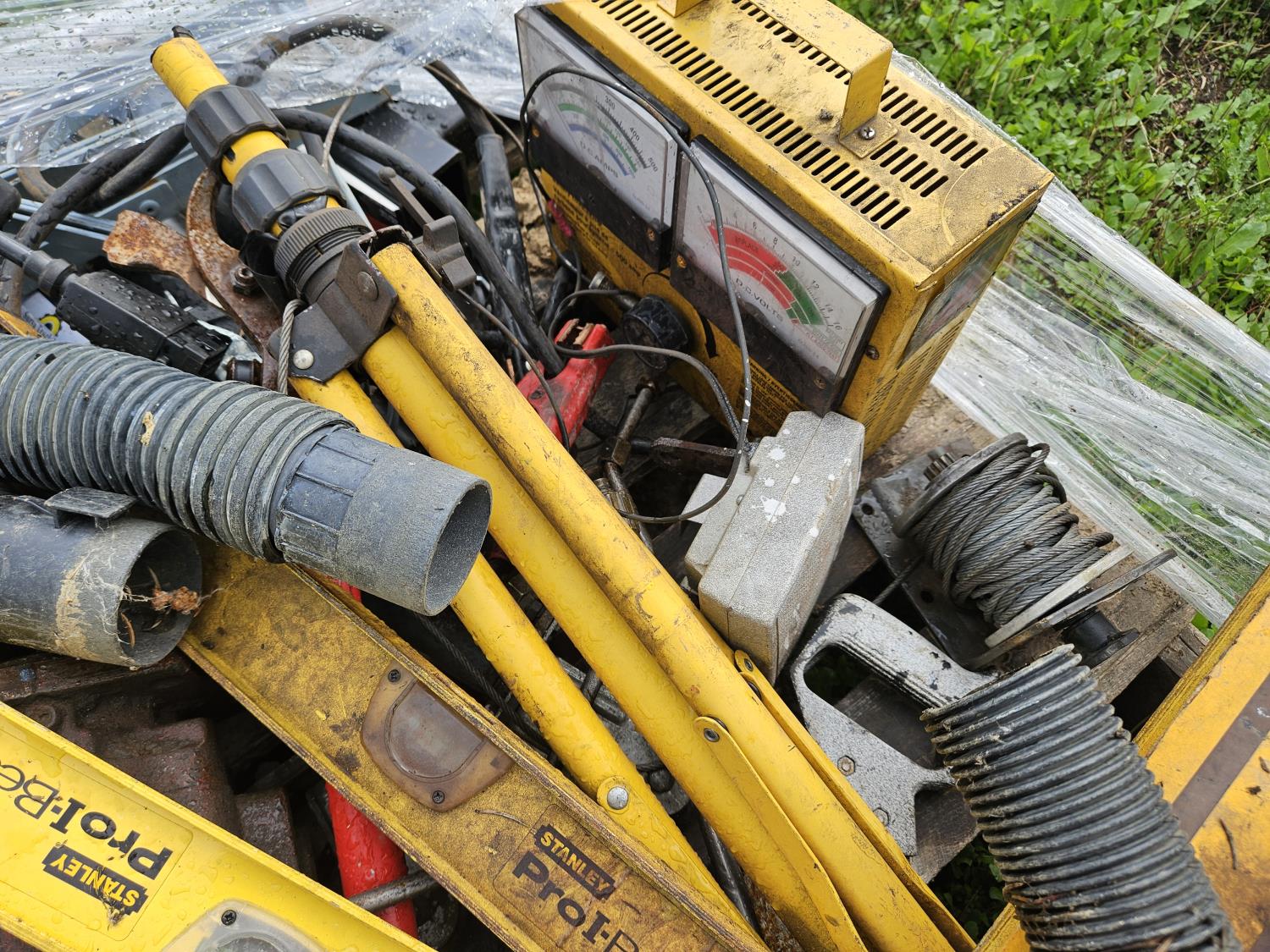 Wide load sign, 2 ft levels, tripod, wheel castors, receiver with step, shocks, hydraulic pump, hitch, hand winch