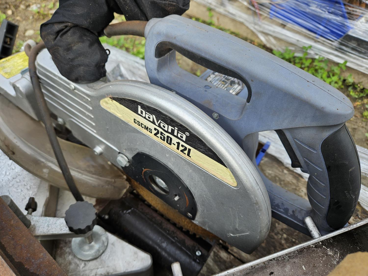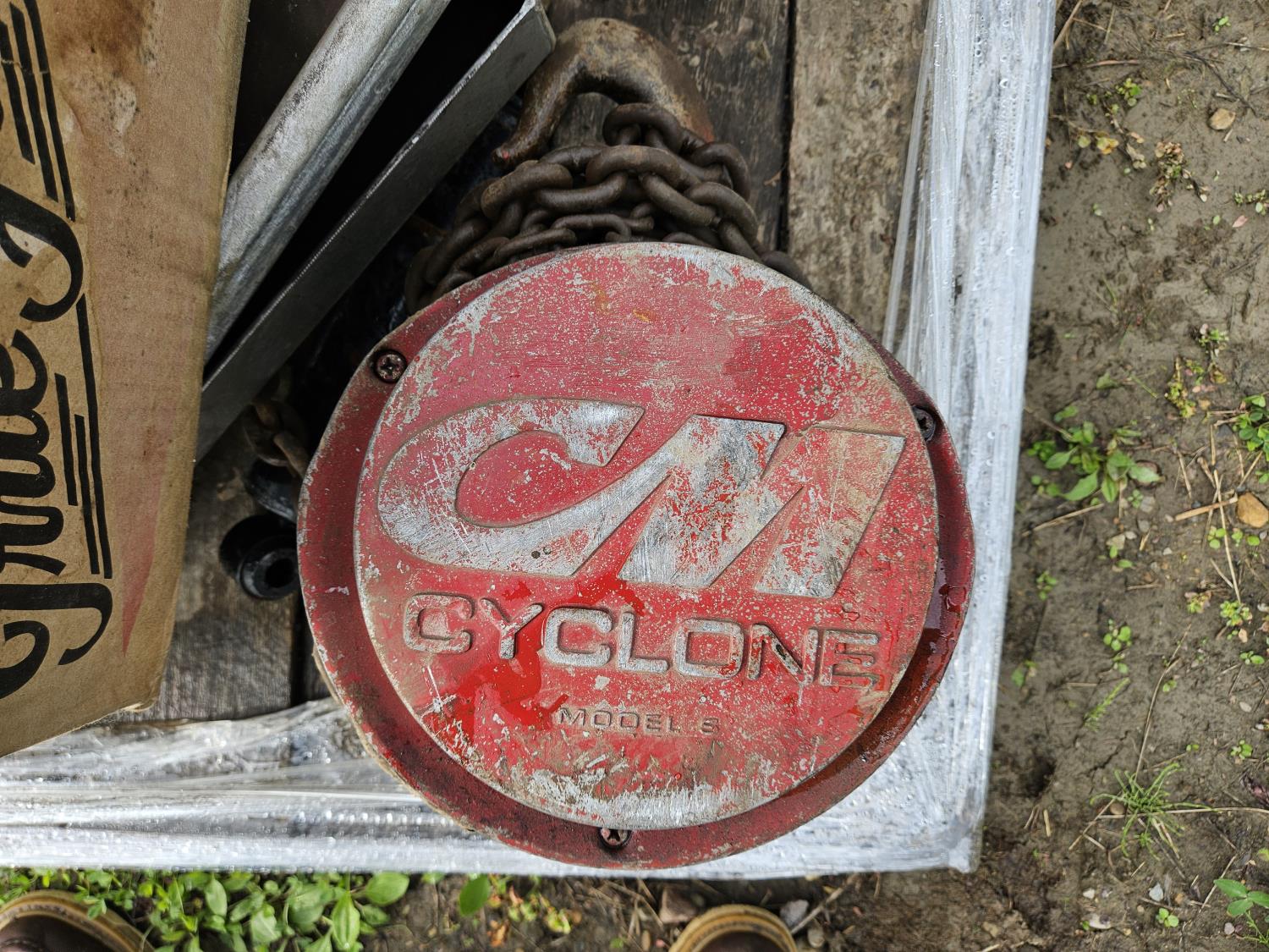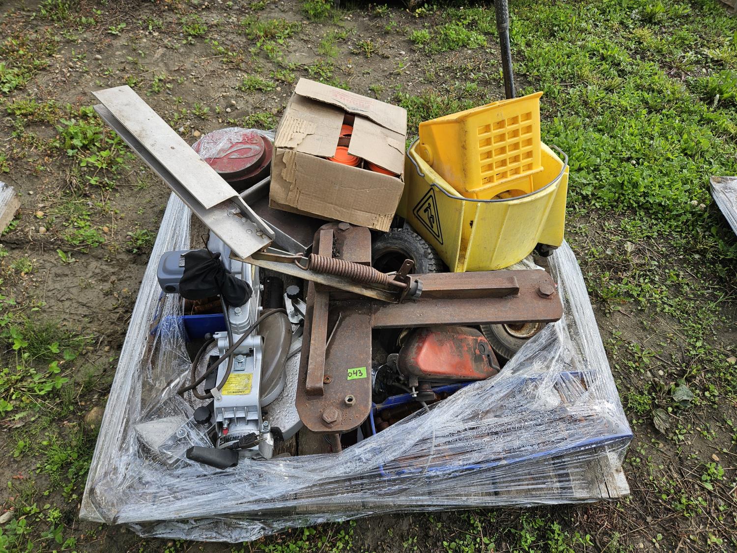 Skeet thrower and box of clay targets, miter saw, shocks, wheels, 1-1/2 ton chain hoist, mop bucket