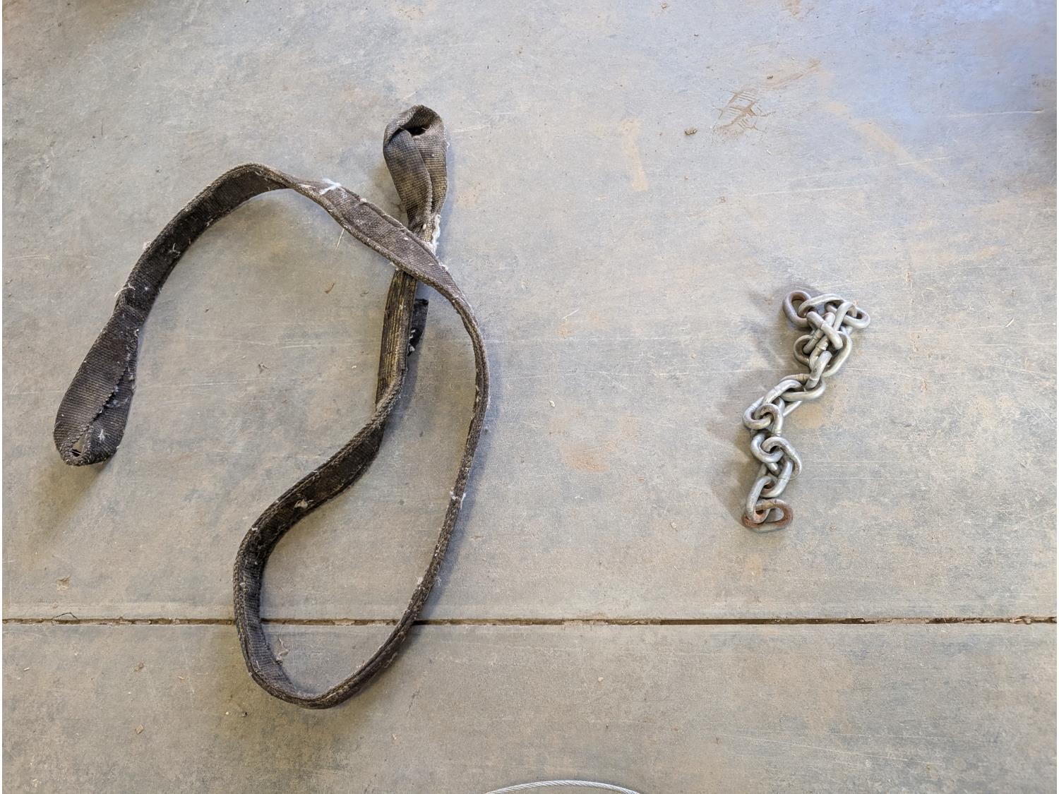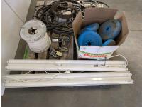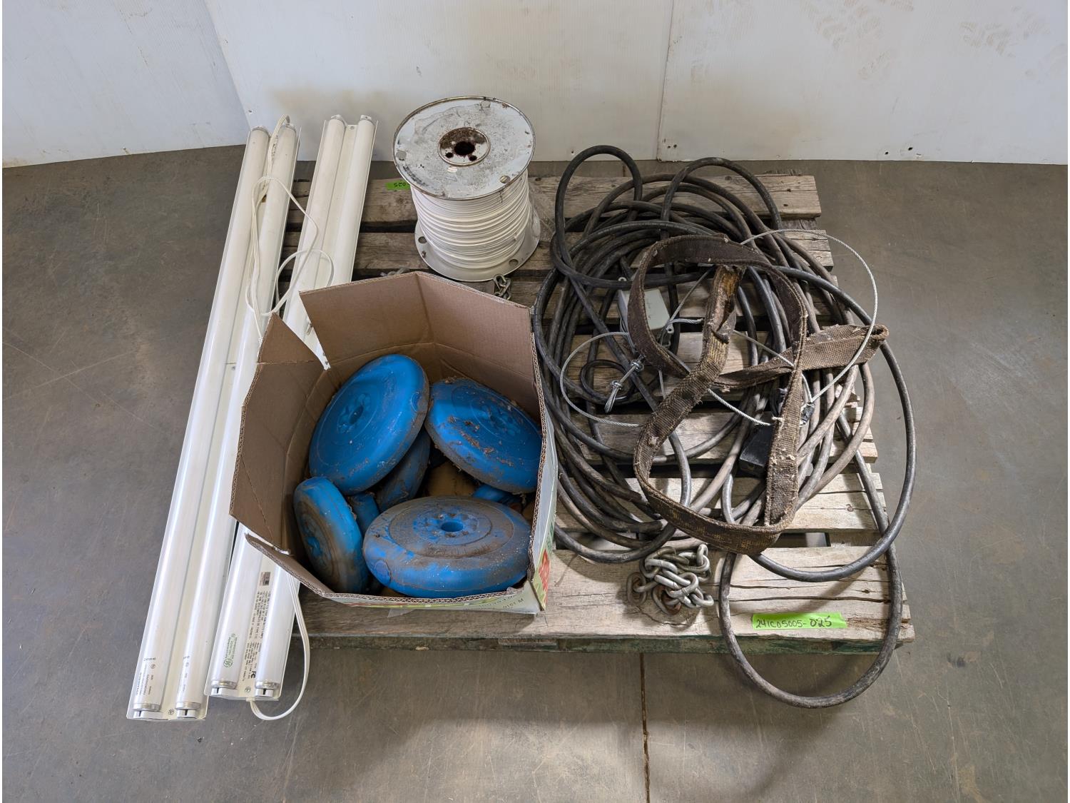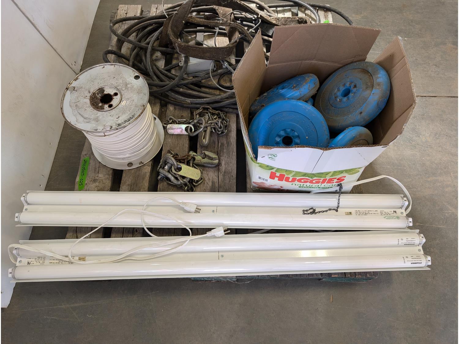 (2) fluorescent light fixtures, dumb bell weights, qty of wire, heavy duty extension cord, chains