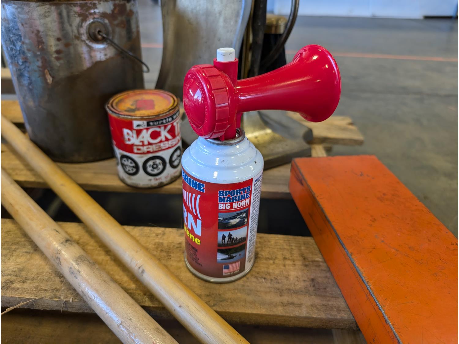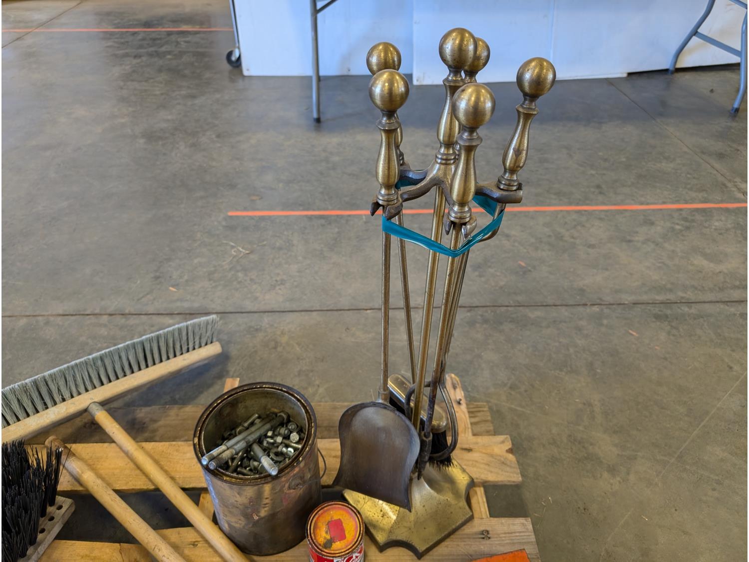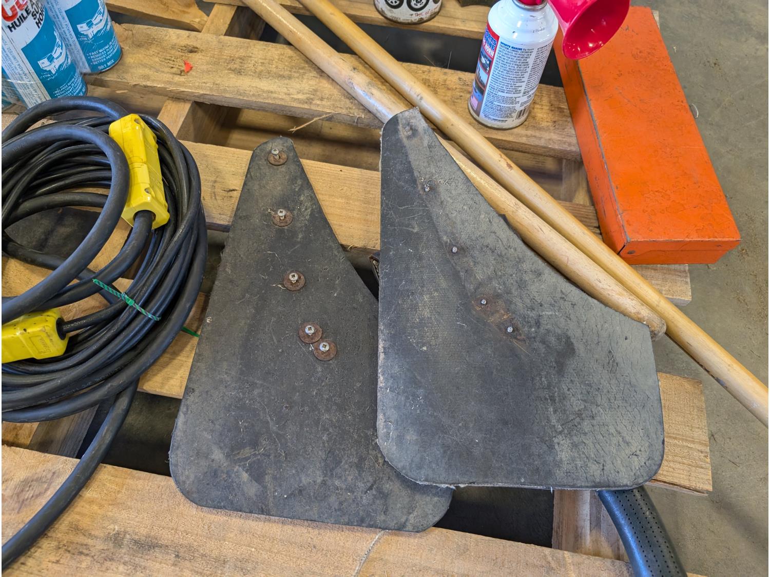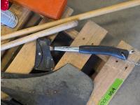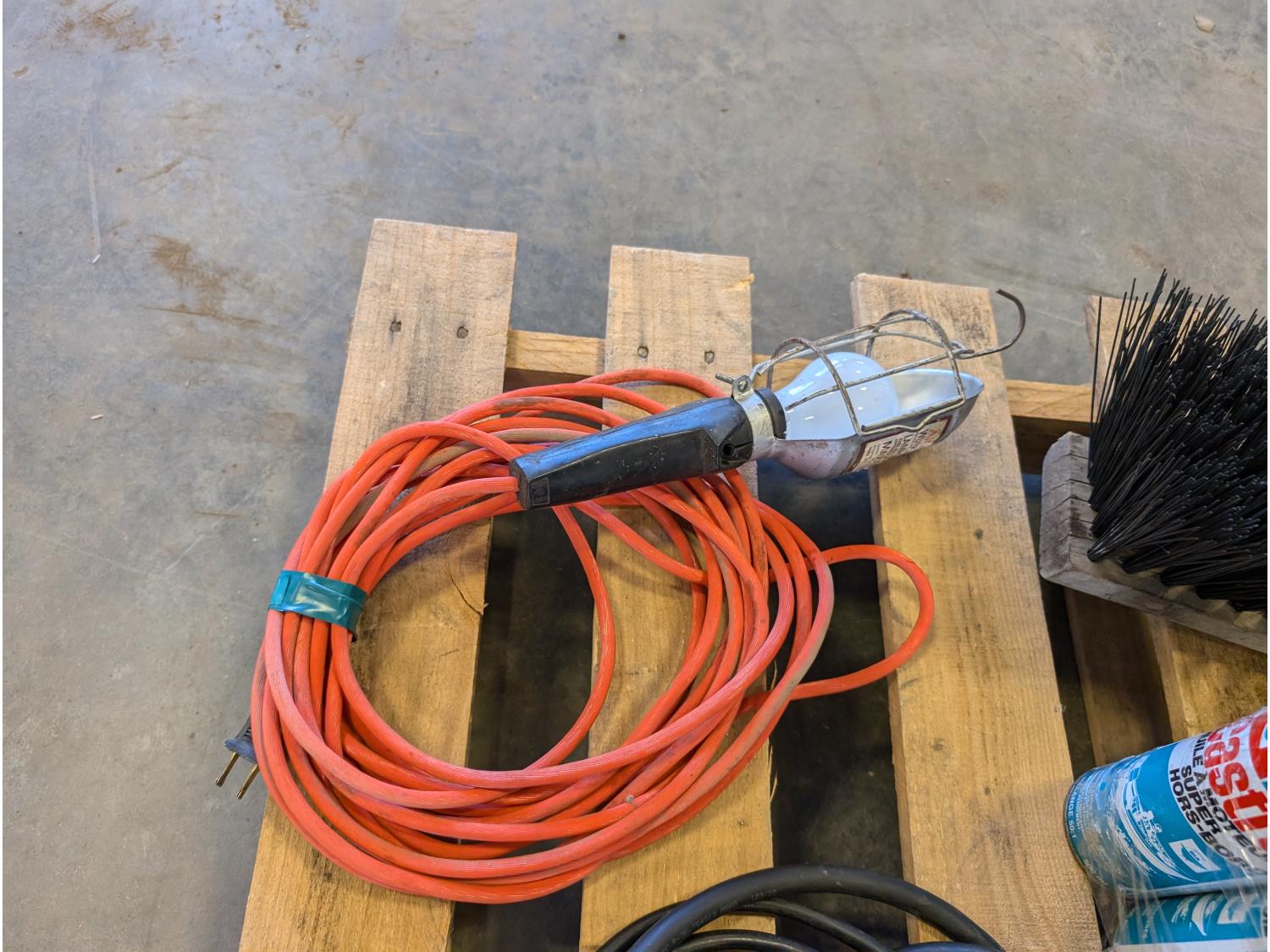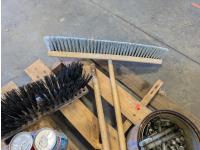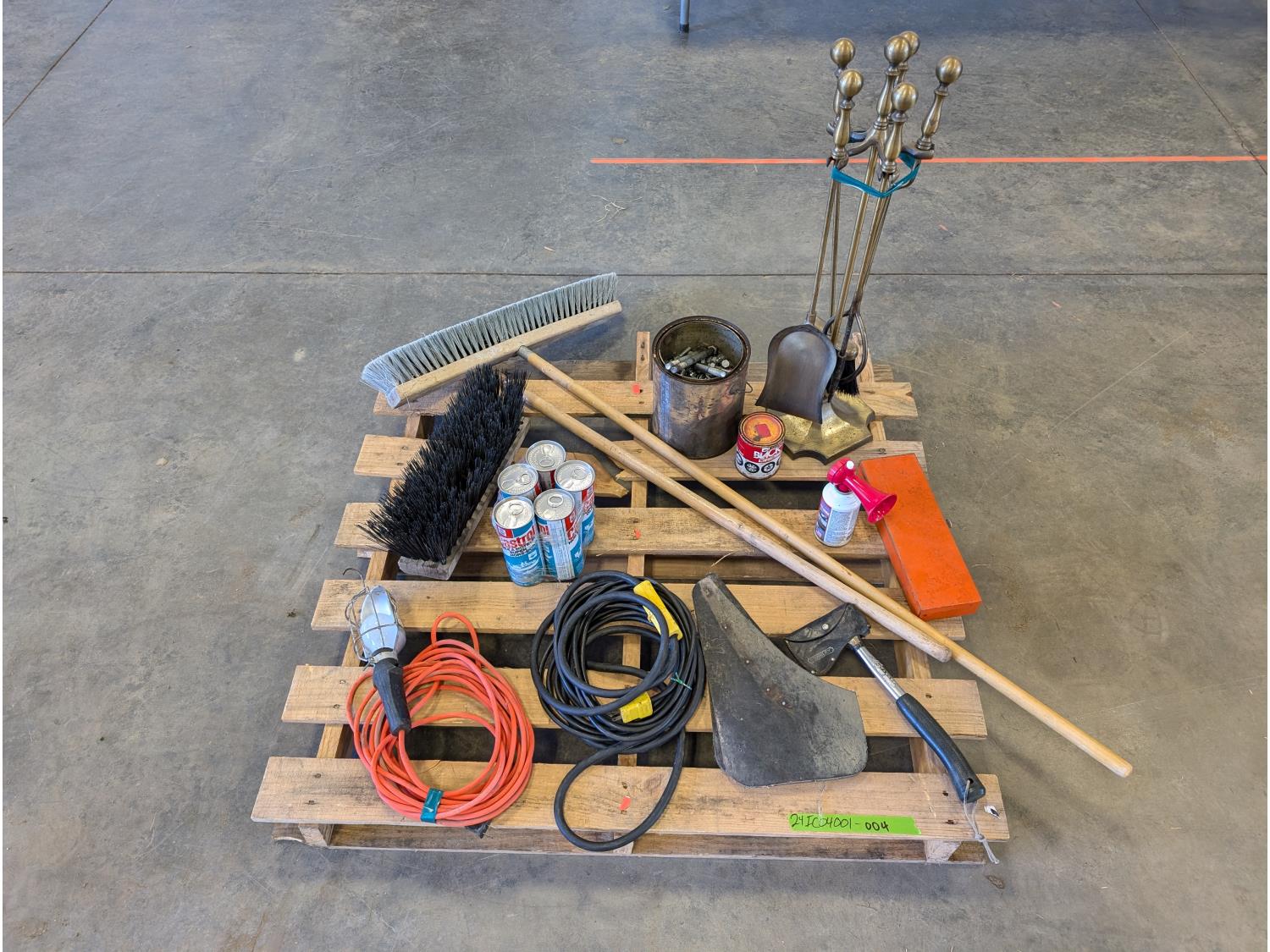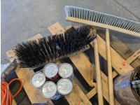 (2) brooms, trouble light, extension cord, air horn, hatchet, hand tools
