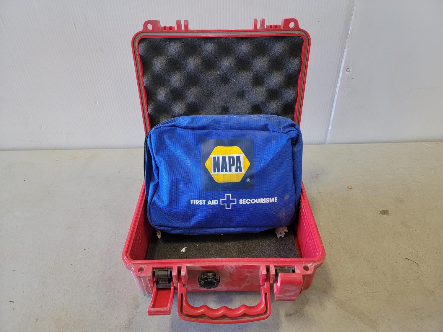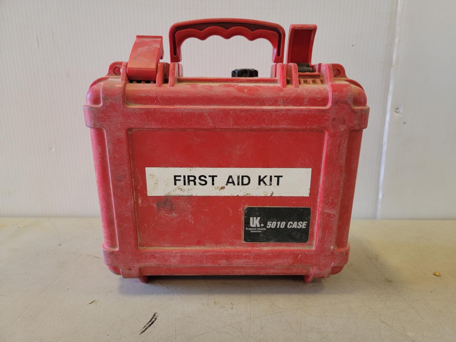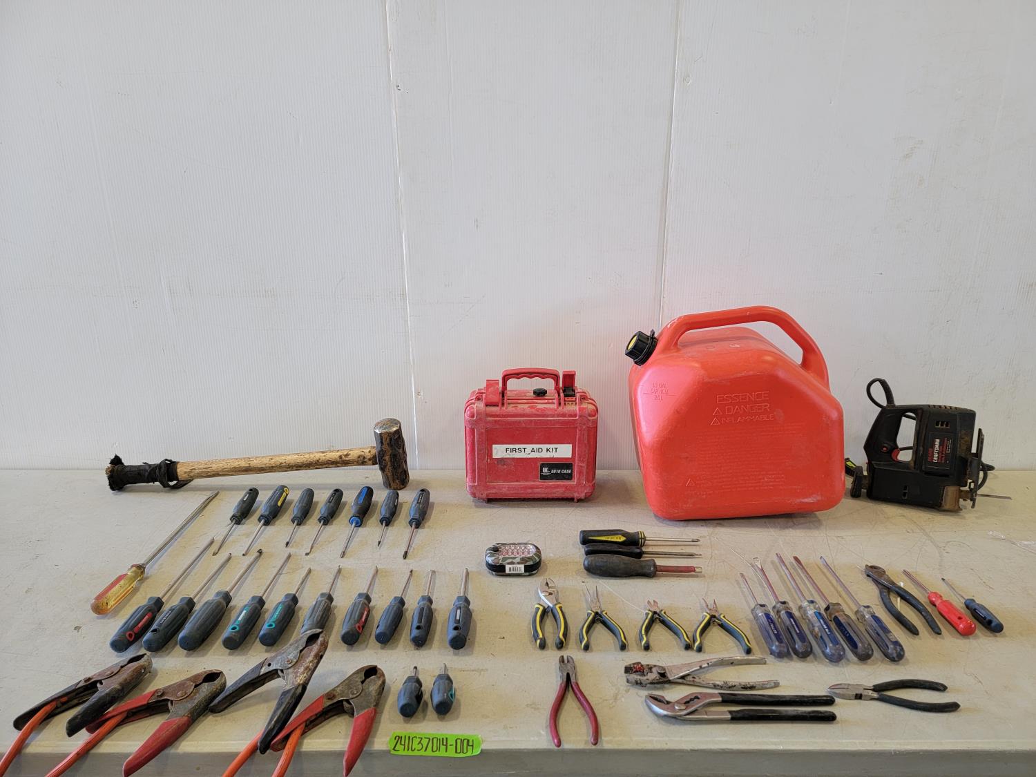 Jerry can, first aid kit, sledge hammer, booster cables, set of wrenches, screwdrivers, pliers