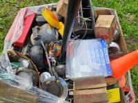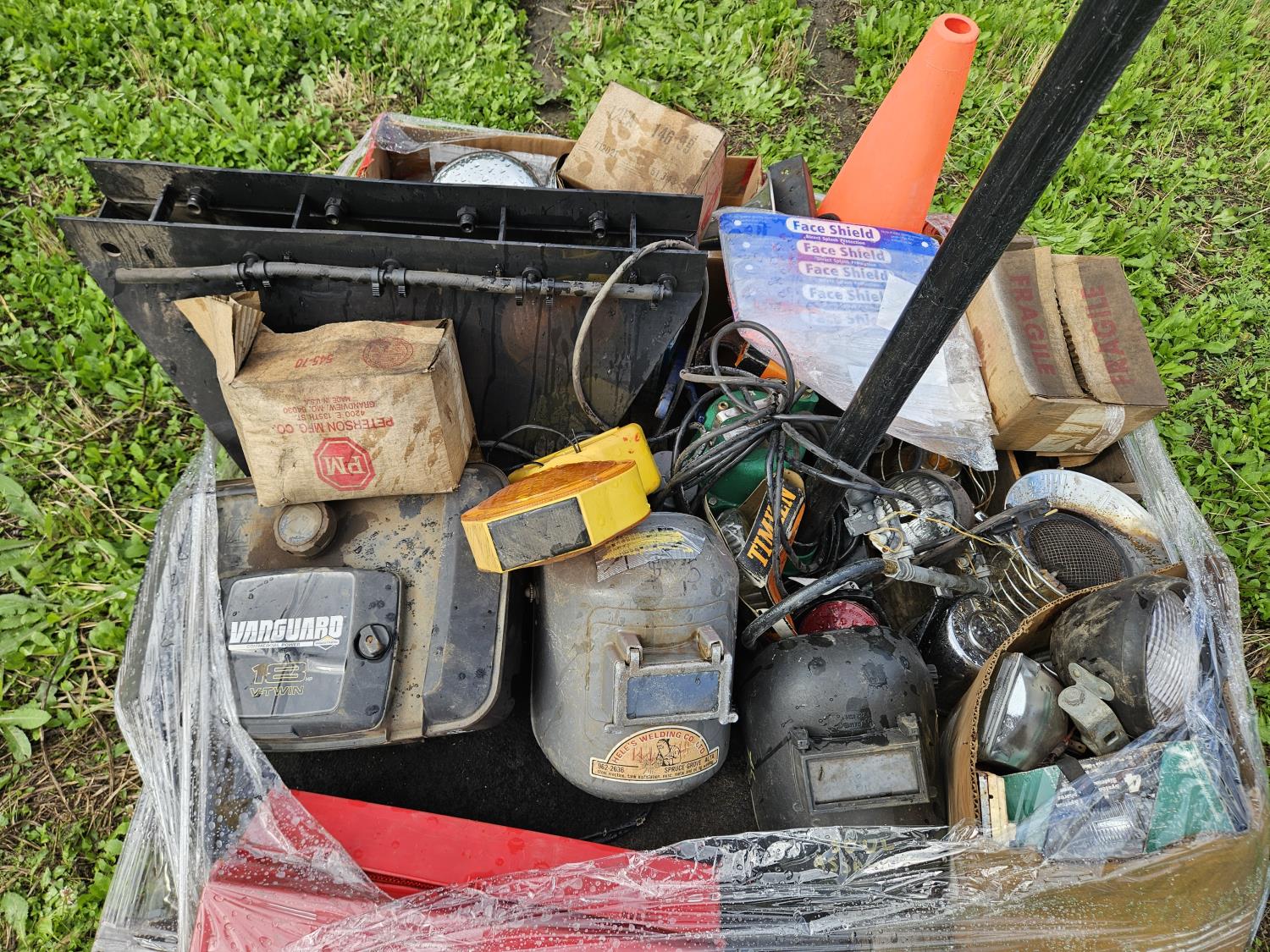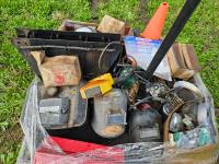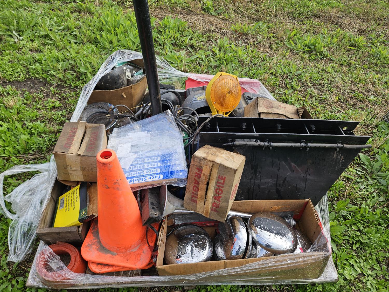 Chrome wheel caps, poly fuel tank, welding mask, septic pump, assorted lights, propane heater, face shield replacements, road flare