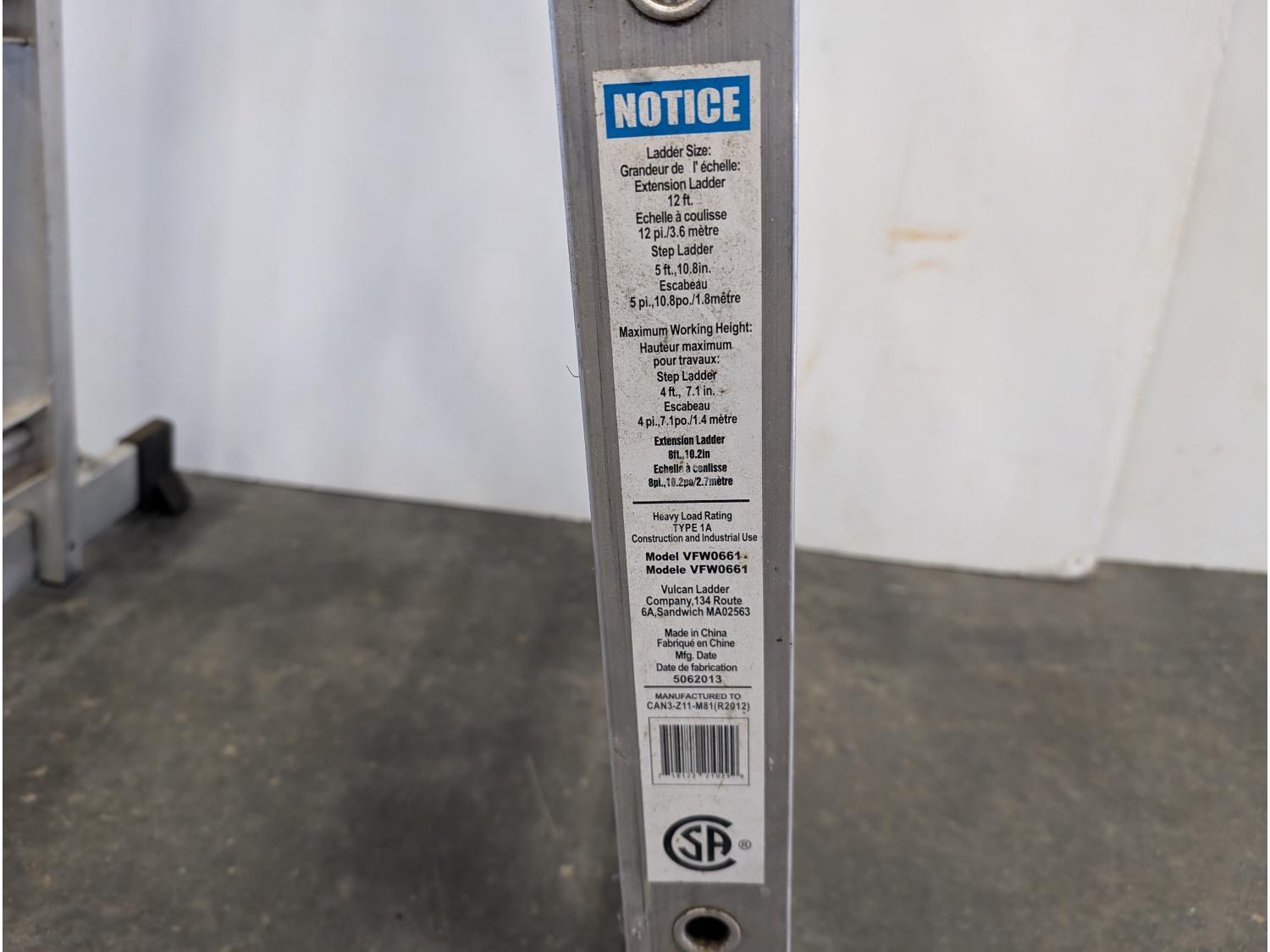 5335 Vulcan 12 Ft Aluminum Extension Ladder