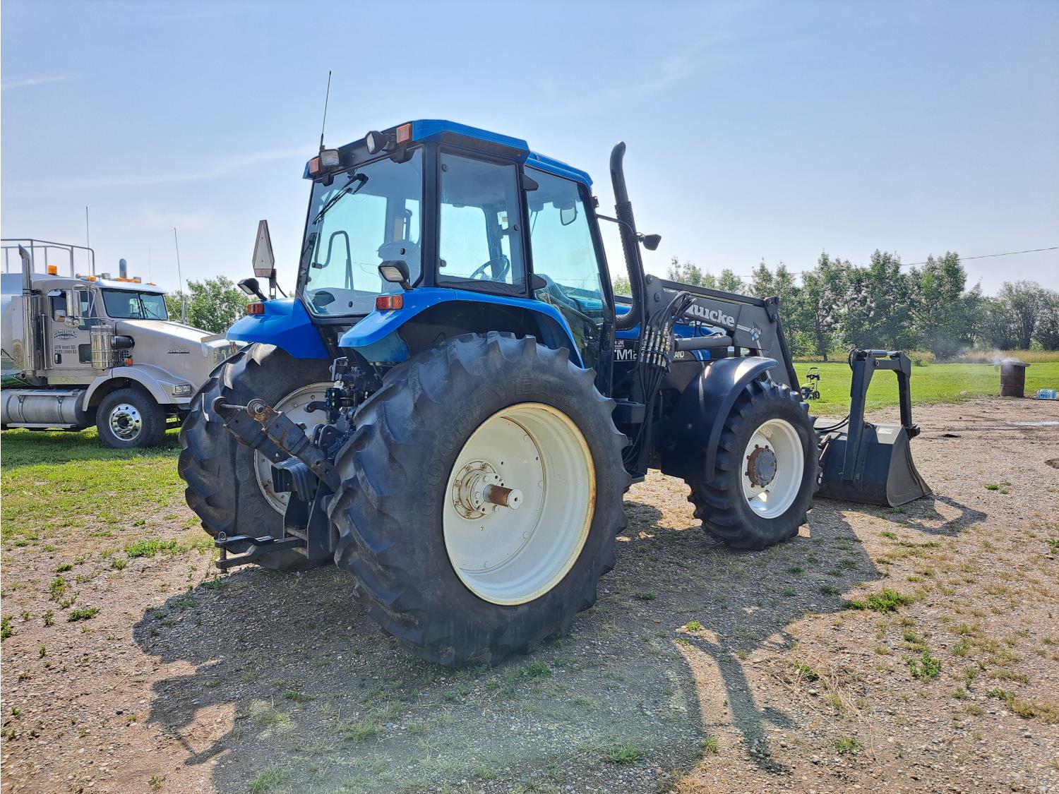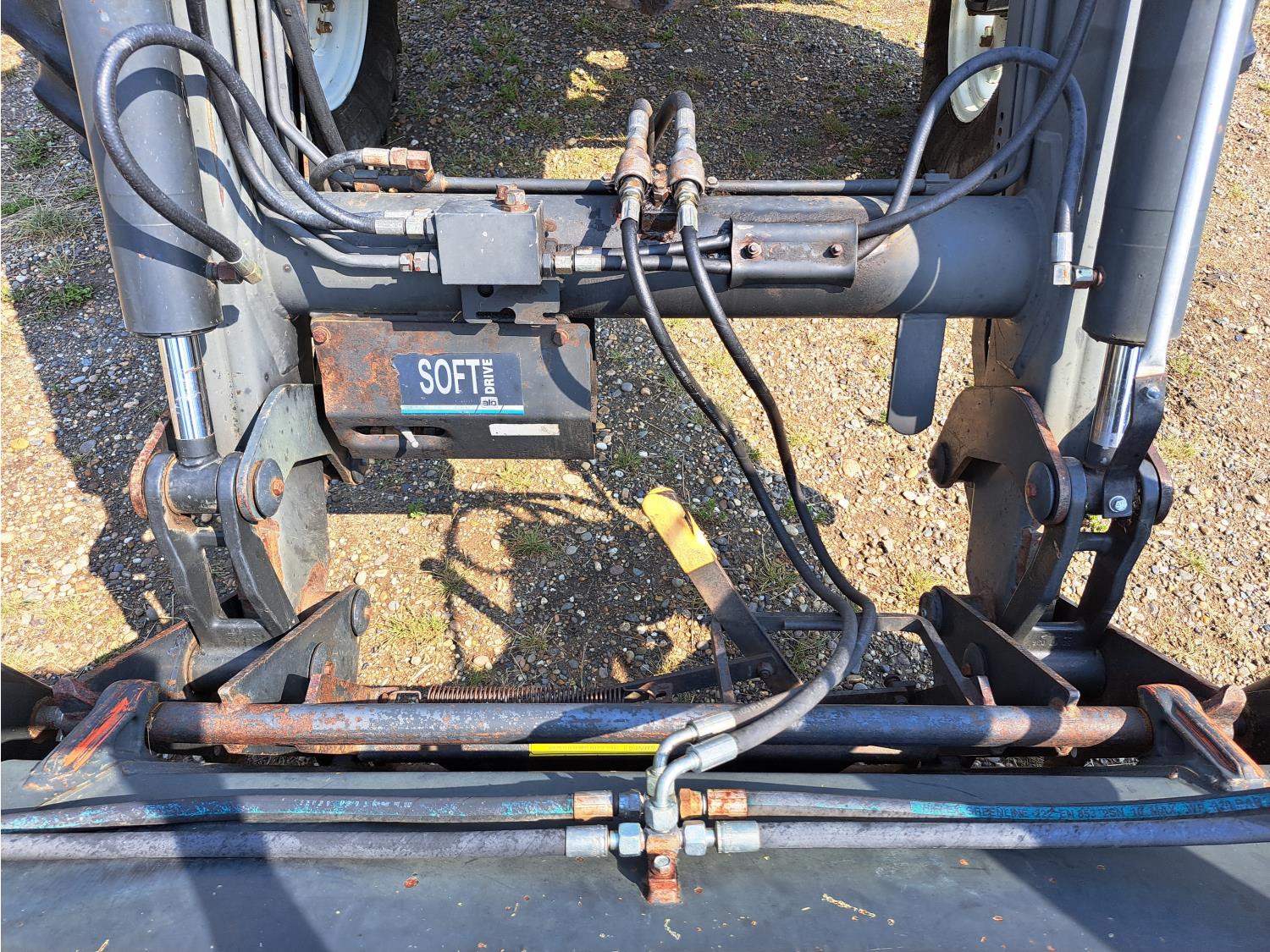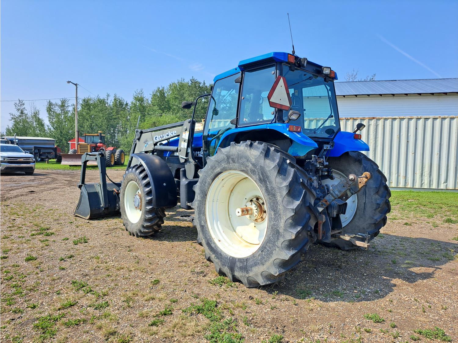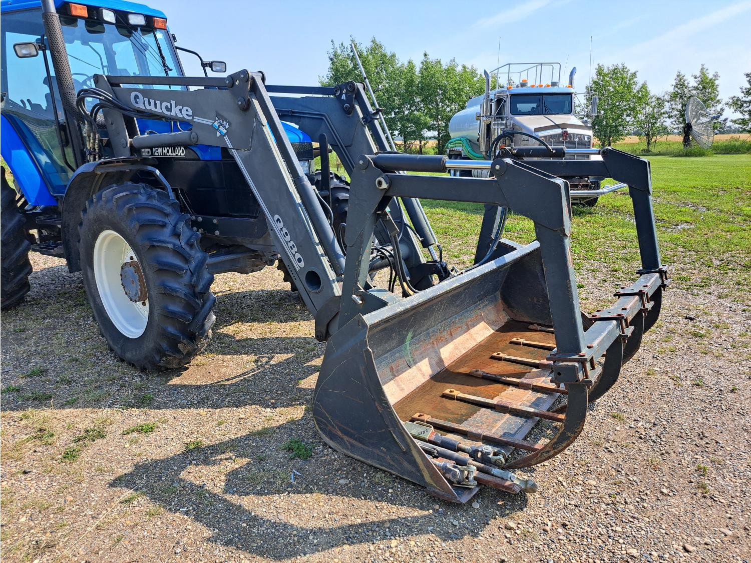 Quicke Q980 loader, 94 inch bucket, grapple, New Holland 7.5 L 6 cylinder 125 HP, diesel engine, 100 PTO HP, 18 speed power shift transmission, cab, A/C, radio, air ride seat, 540/1000 PTO, 2 rear hydraulic outlets, 14.9-28 front tires, 18.4R38 rear tires