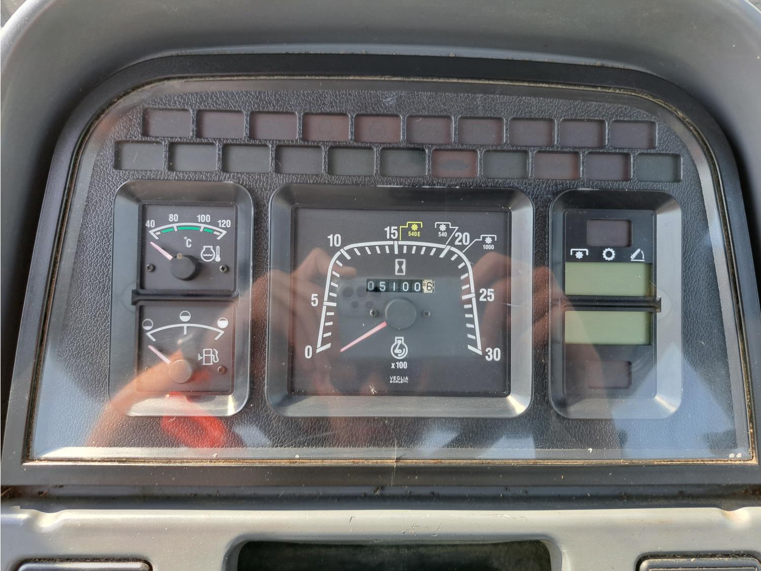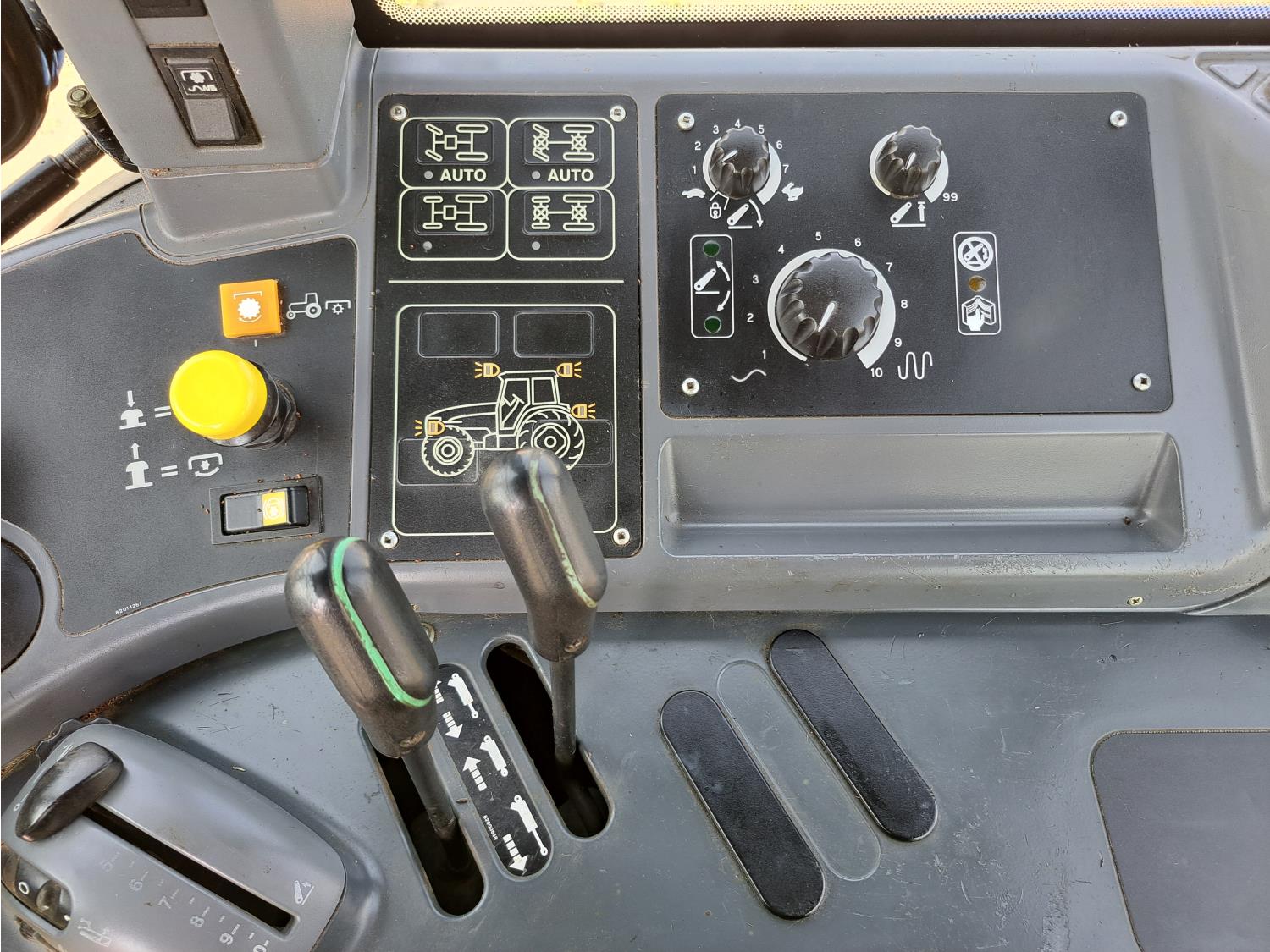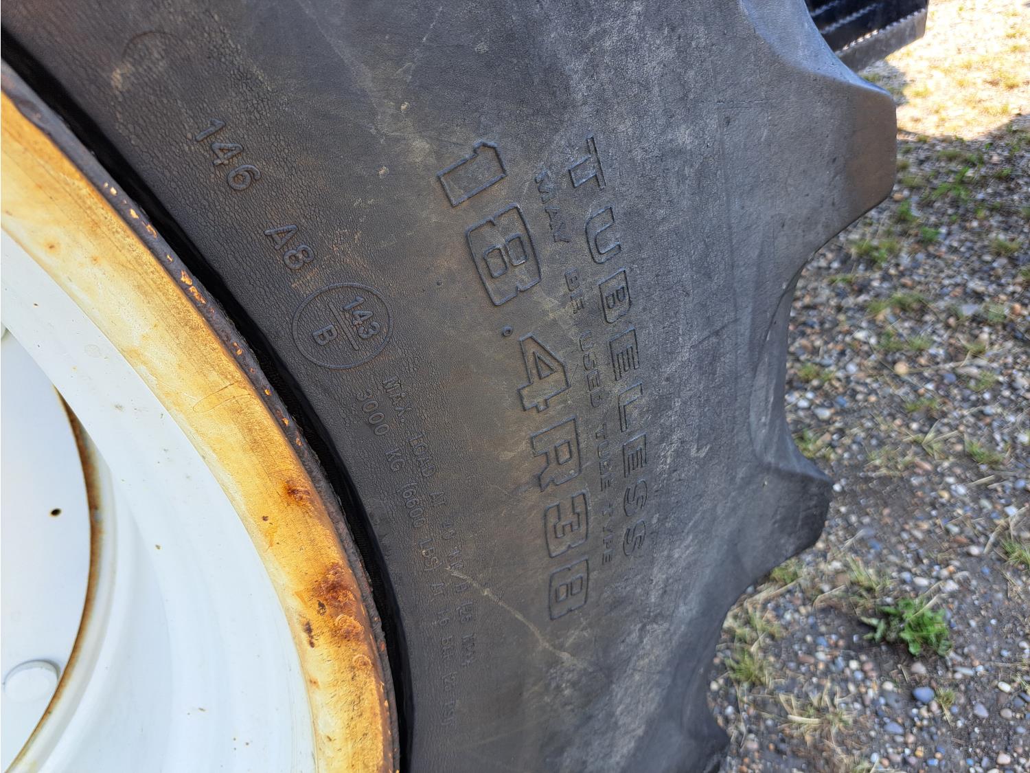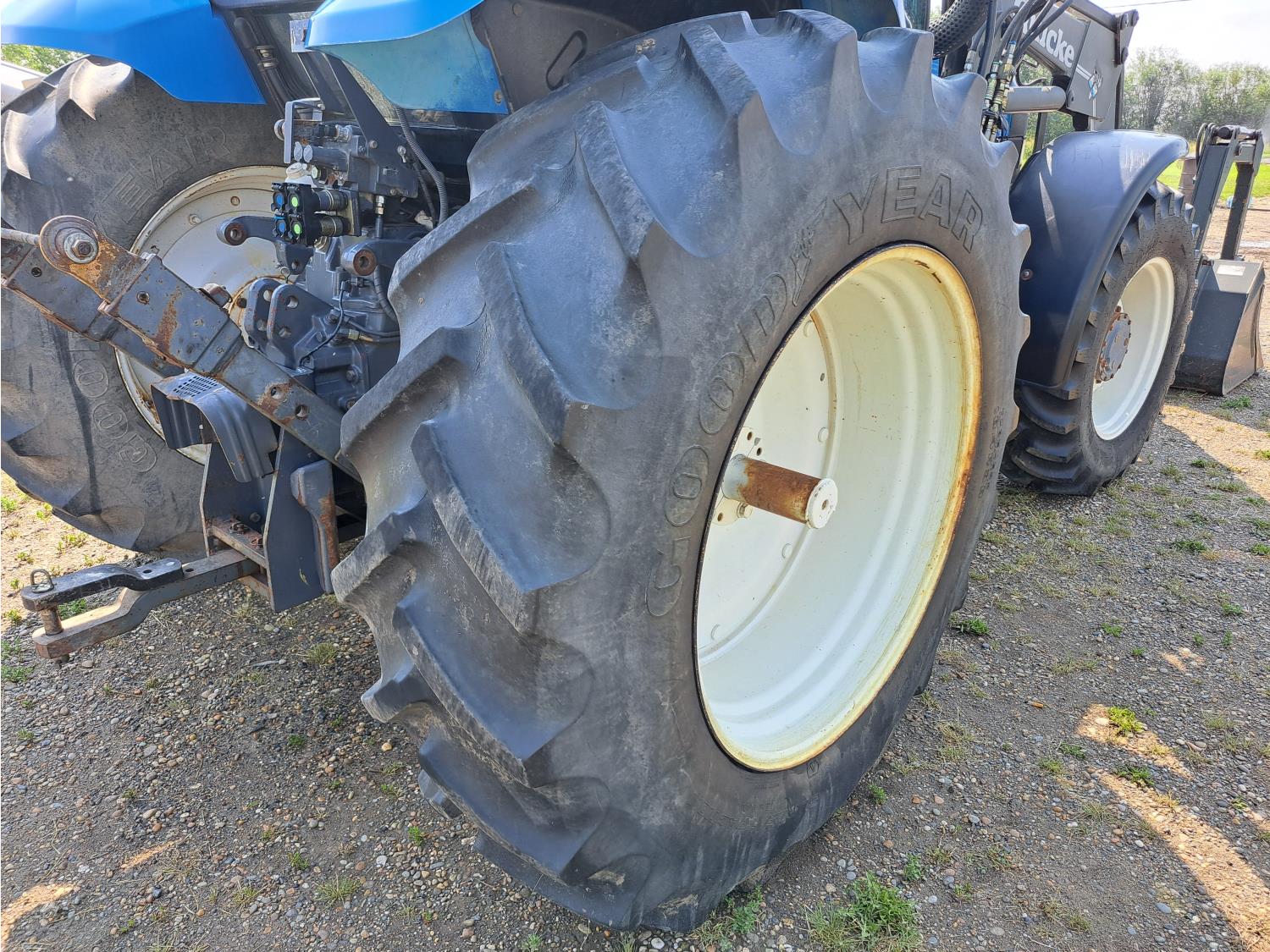 Quicke Q980 loader, 94 inch bucket, grapple, New Holland 7.5 L 6 cylinder 125 HP, diesel engine, 100 PTO HP, 18 speed power shift transmission, cab, A/C, radio, air ride seat, 540/1000 PTO, 2 rear hydraulic outlets, 14.9-28 front tires, 18.4R38 rear tires