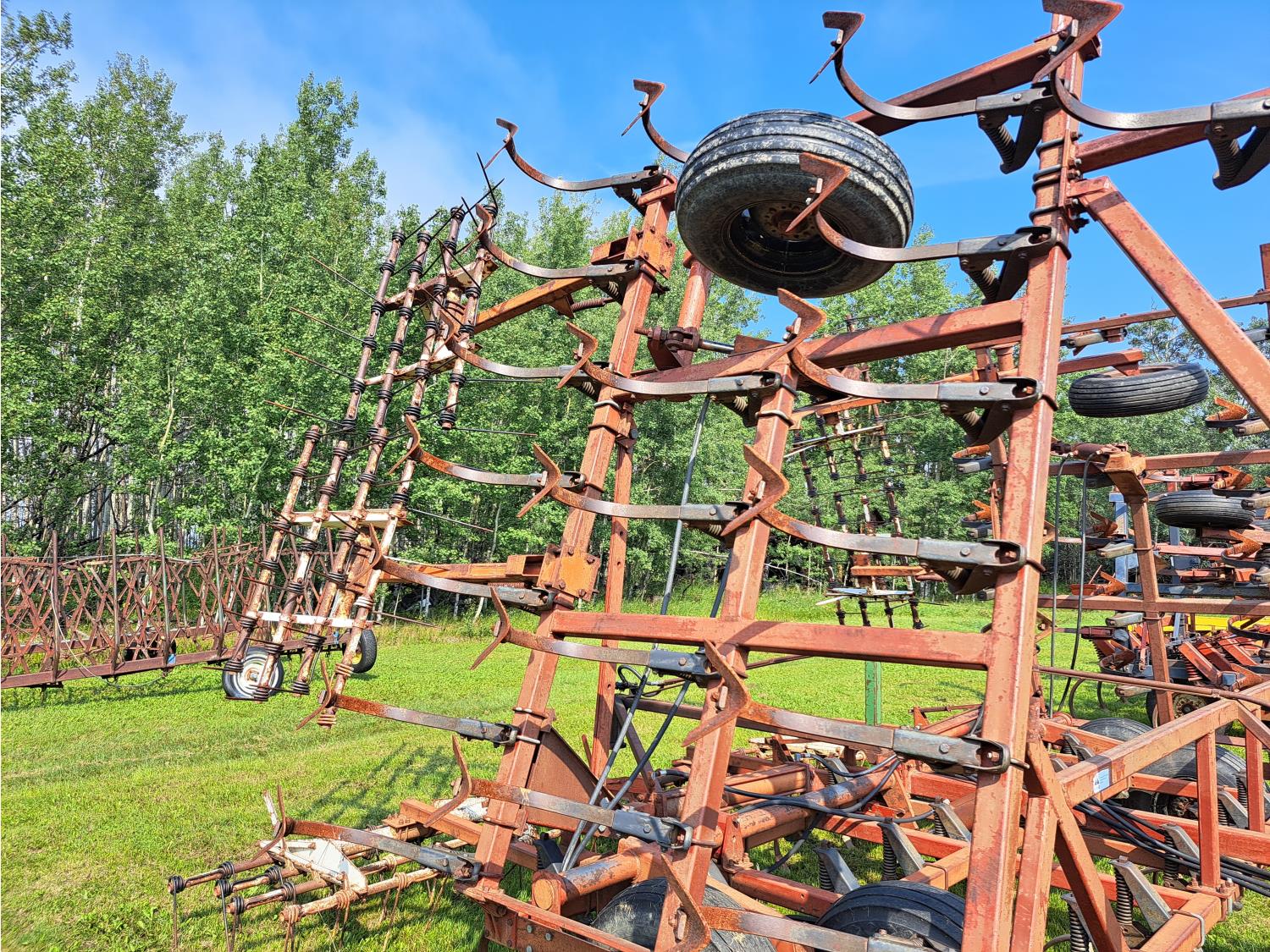 6 inch spacing, 9 inch sweeps, spring tooth harrows, rear hitch, 9.5L-15 tires