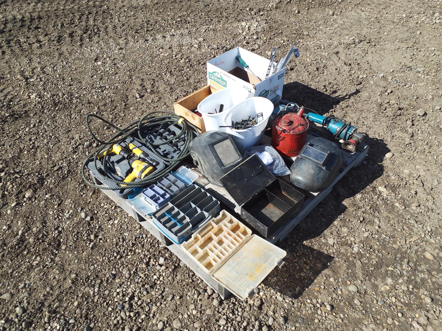 (2) welding helmets, hand tools, metal snippers, bucket of allen keys