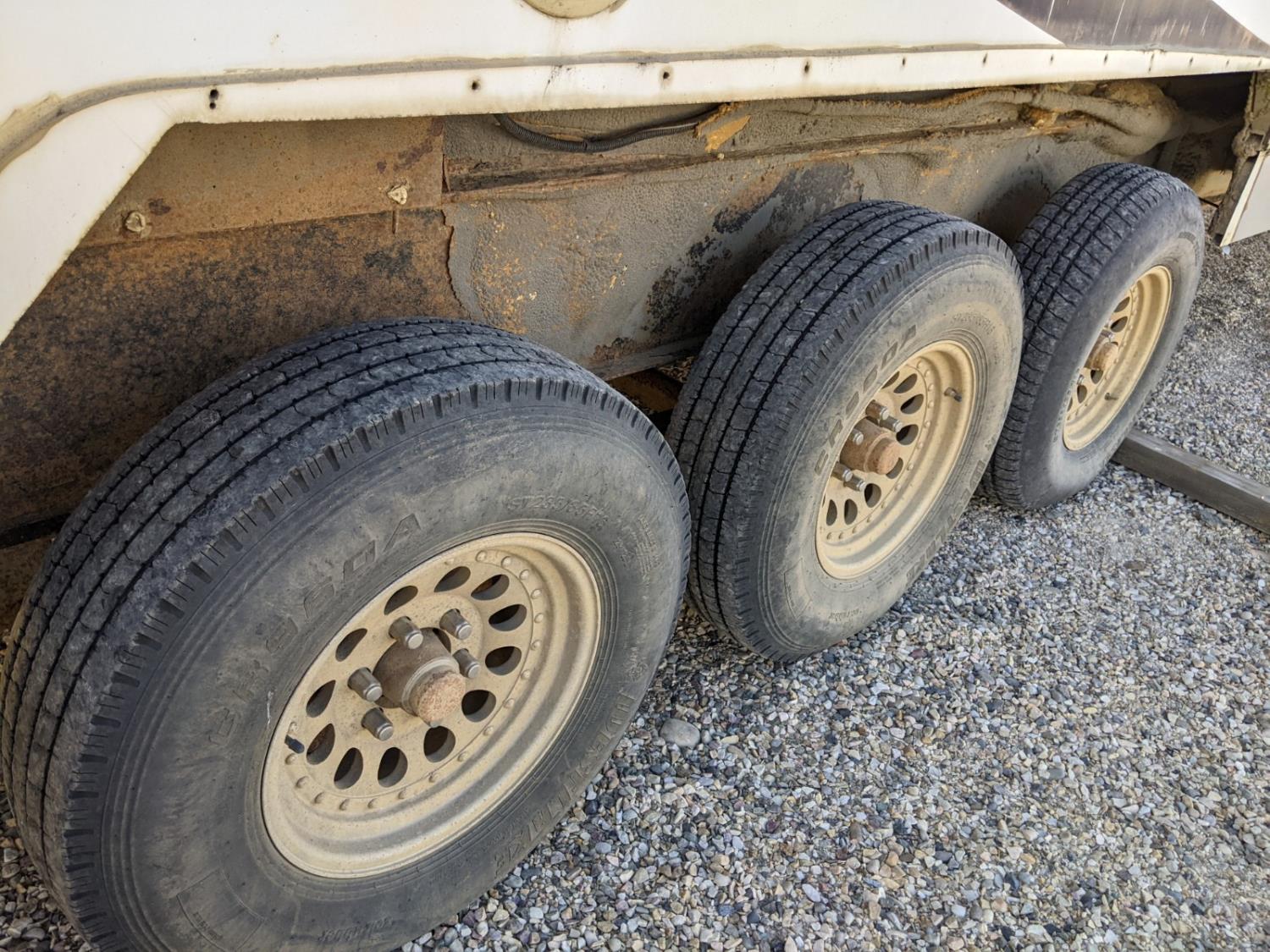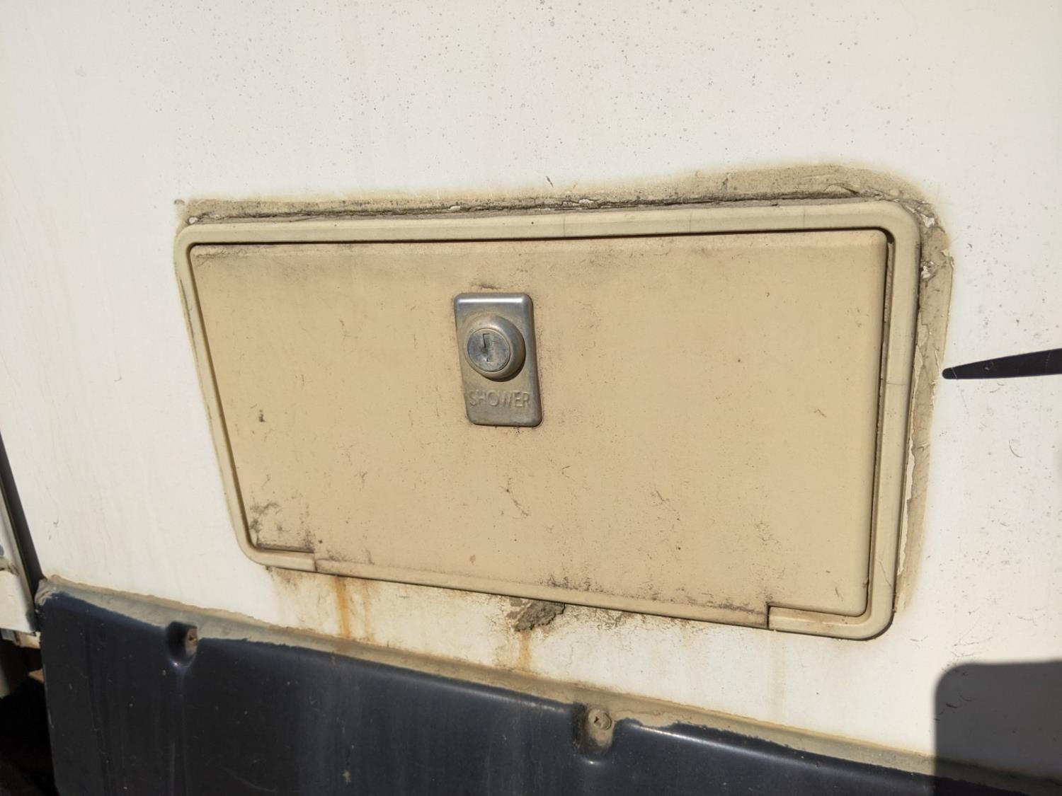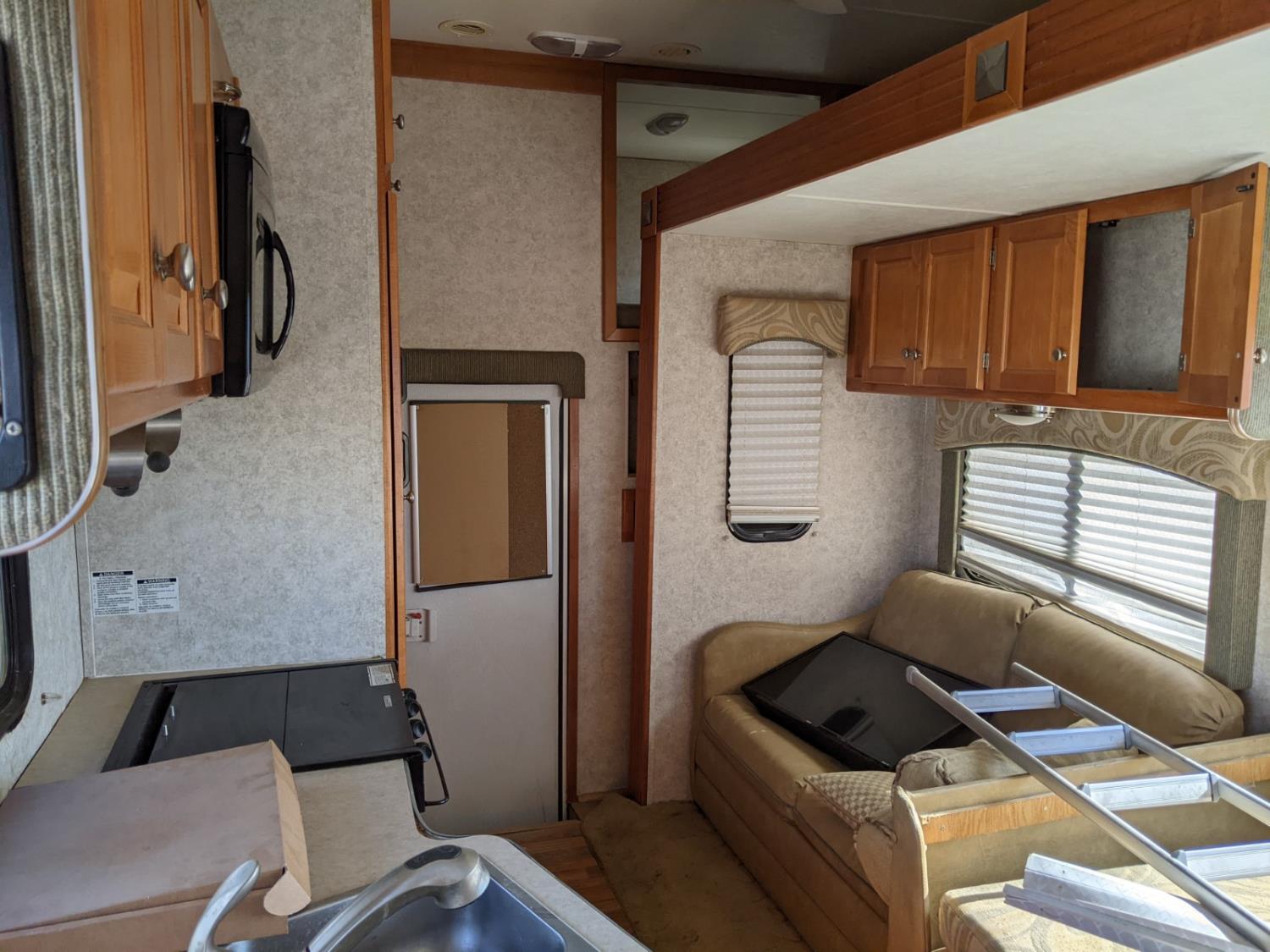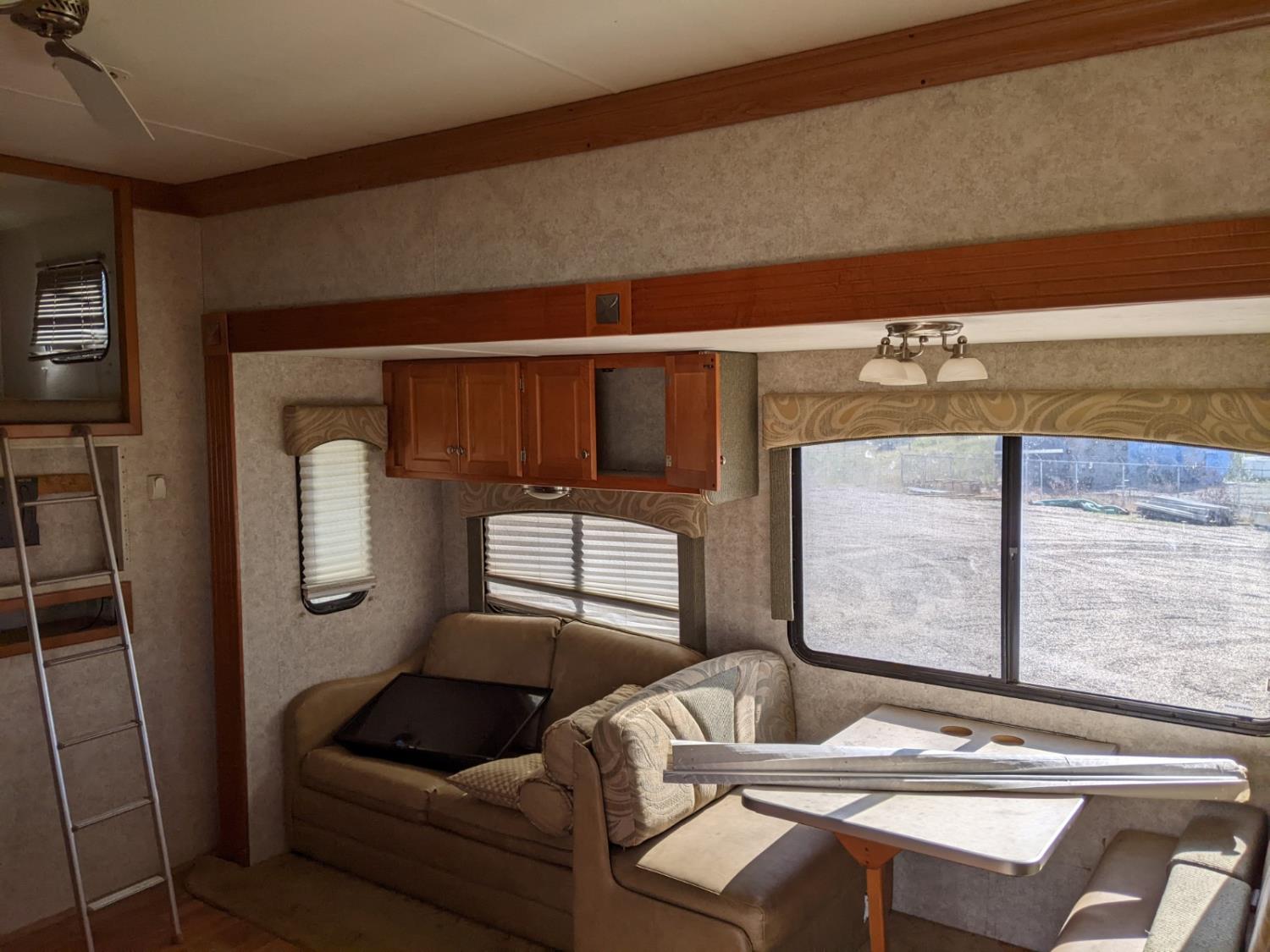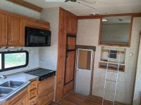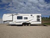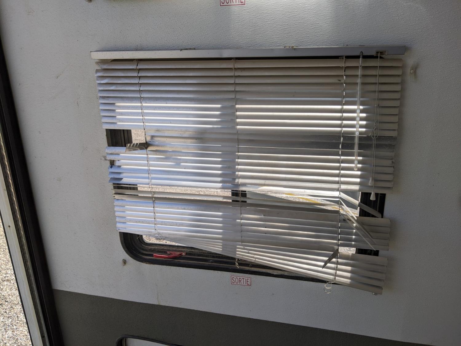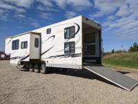 Sleeps 6, stove, fridge, microwave, full bath, master bedroom, A/C, outdoor shower, 2 slides, Onan generator, power levelling jacks, spring suspension, broken back window on drive's side, awning was ripped off, awning above slid has a rip, plastic fender skirts are broken, start button for generator doesn't work inside need to go outside to start it, generator has 1776hrs, rear toy hauler is 154 inch d x 98 inch w, ramp door is 101 inch h and has no form of assist , 238/85R16 tires