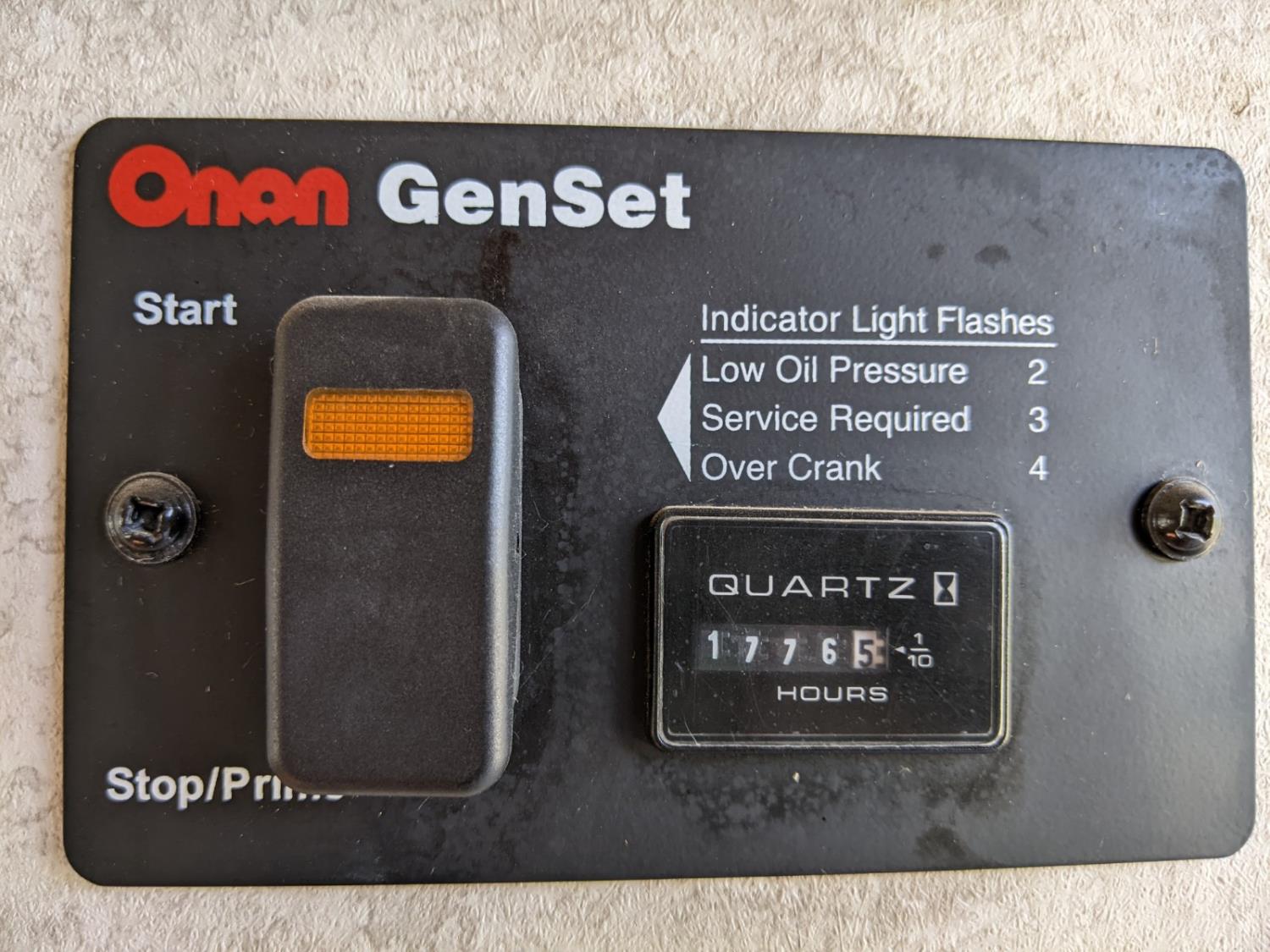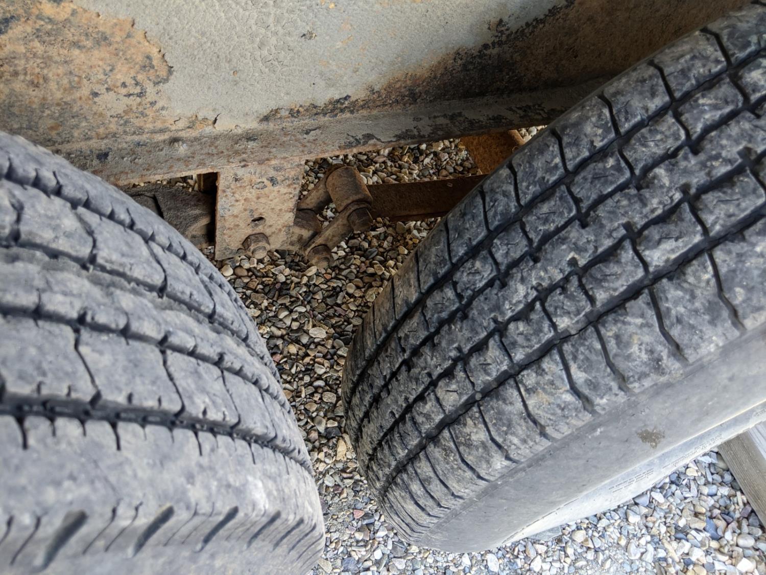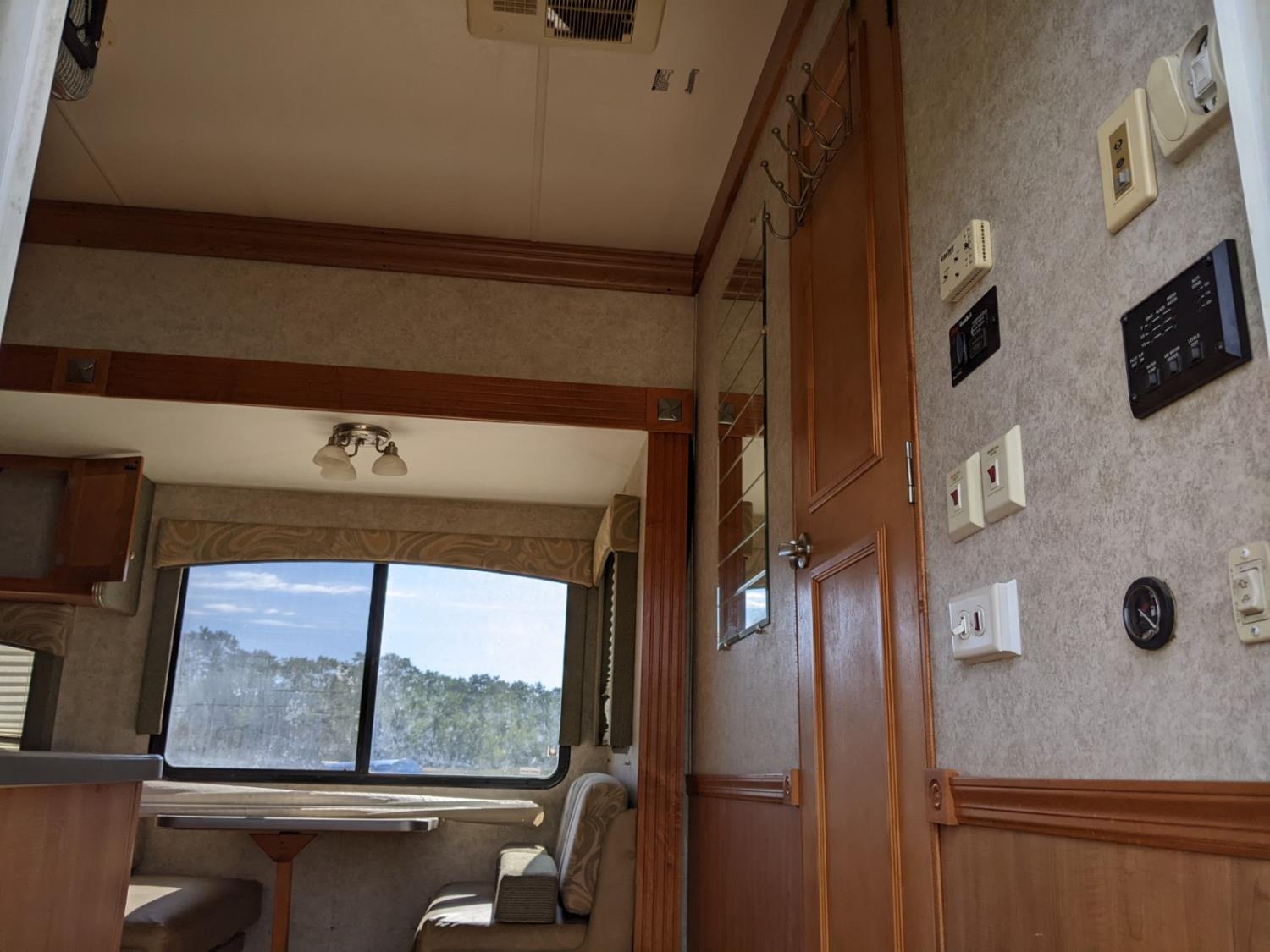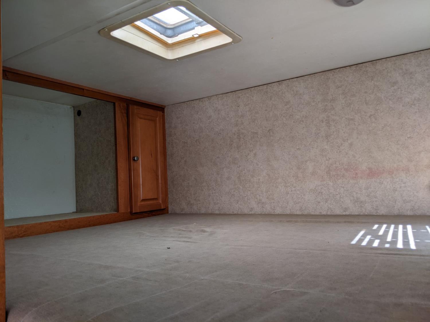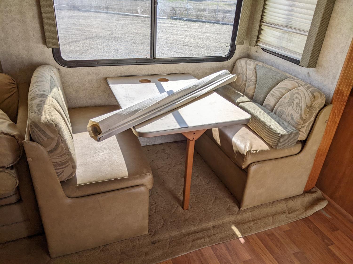 Sleeps 6, stove, fridge, microwave, full bath, master bedroom, A/C, outdoor shower, 2 slides, Onan generator, power levelling jacks, spring suspension, broken back window on drive's side, awning was ripped off, awning above slid has a rip, plastic fender skirts are broken, start button for generator doesn't work inside need to go outside to start it, generator has 1776hrs, rear toy hauler is 154 inch d x 98 inch w, ramp door is 101 inch h and has no form of assist , 238/85R16 tires