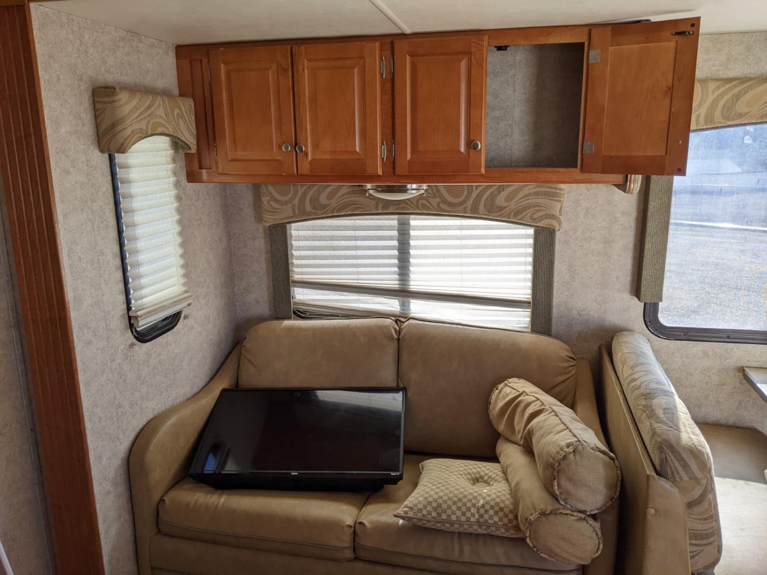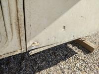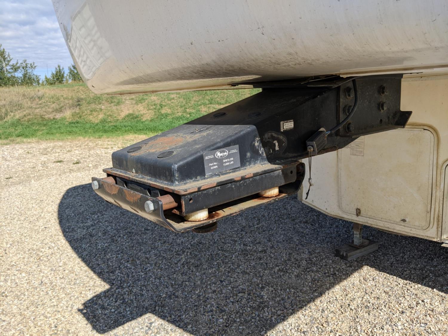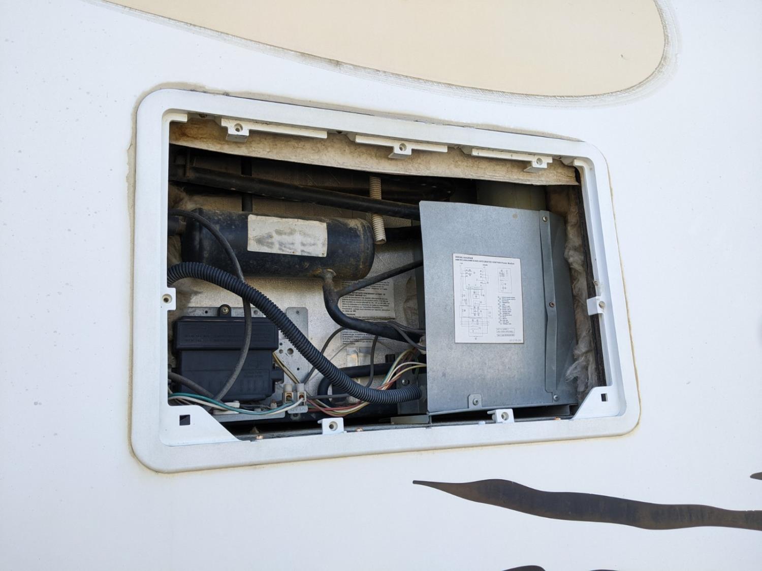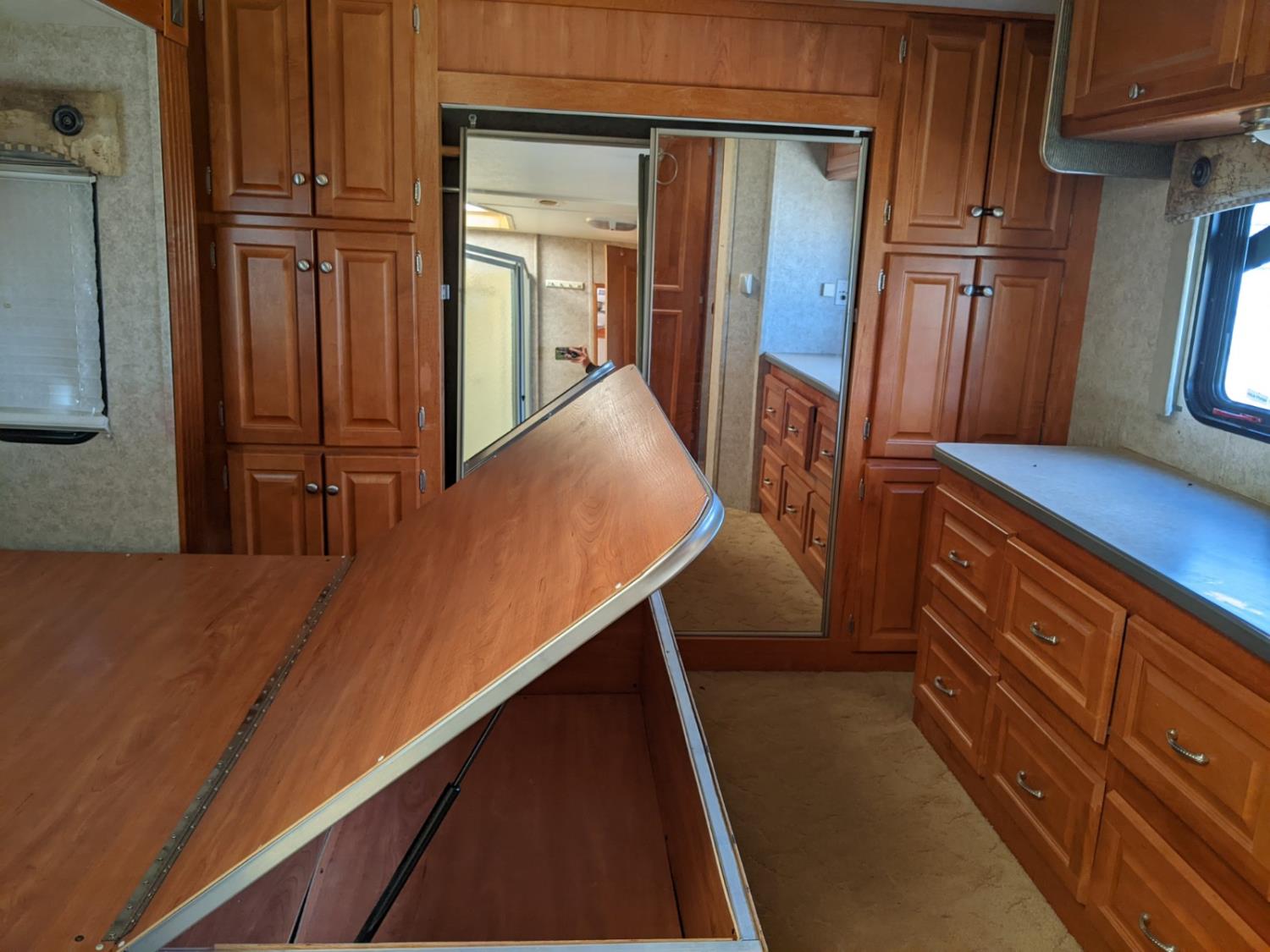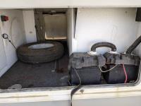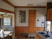 Sleeps 6, stove, fridge, microwave, full bath, master bedroom, A/C, outdoor shower, 2 slides, Onan generator, power levelling jacks, spring suspension, broken back window on drive's side, awning was ripped off, awning above slid has a rip, plastic fender skirts are broken, start button for generator doesn't work inside need to go outside to start it, generator has 1776hrs, rear toy hauler is 154 inch d x 98 inch w, ramp door is 101 inch h and has no form of assist , 238/85R16 tires
