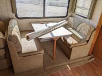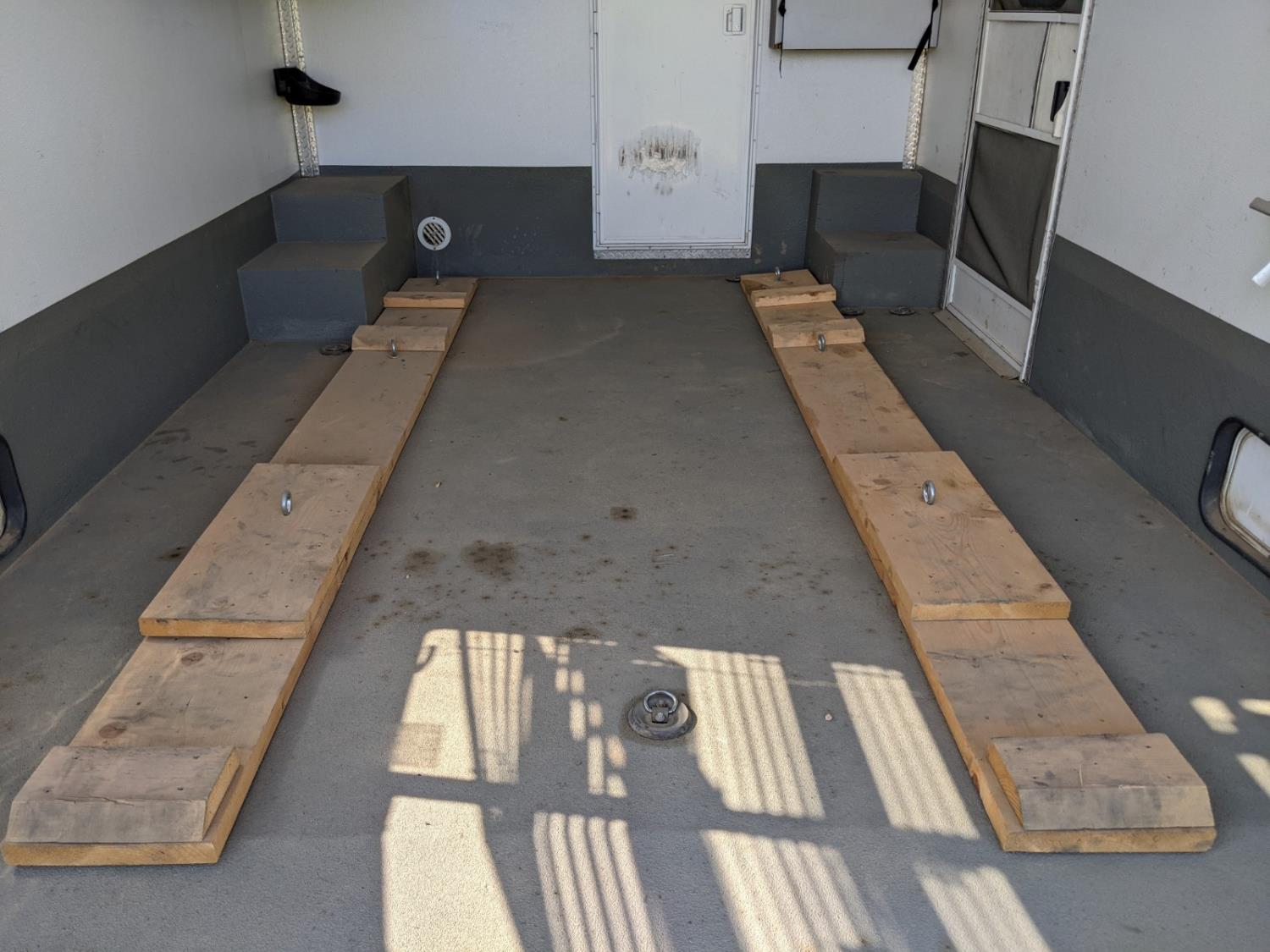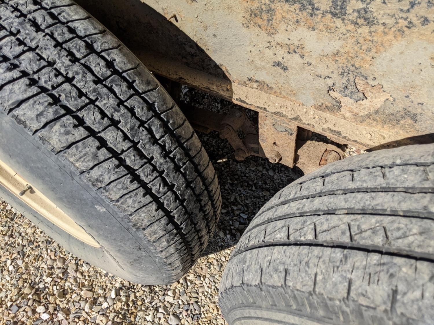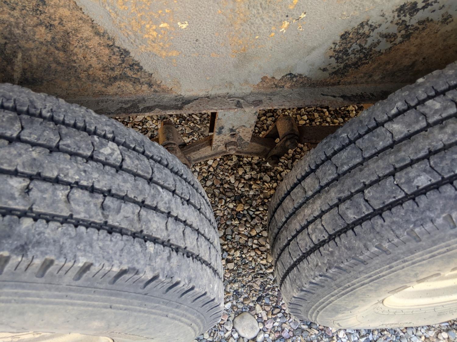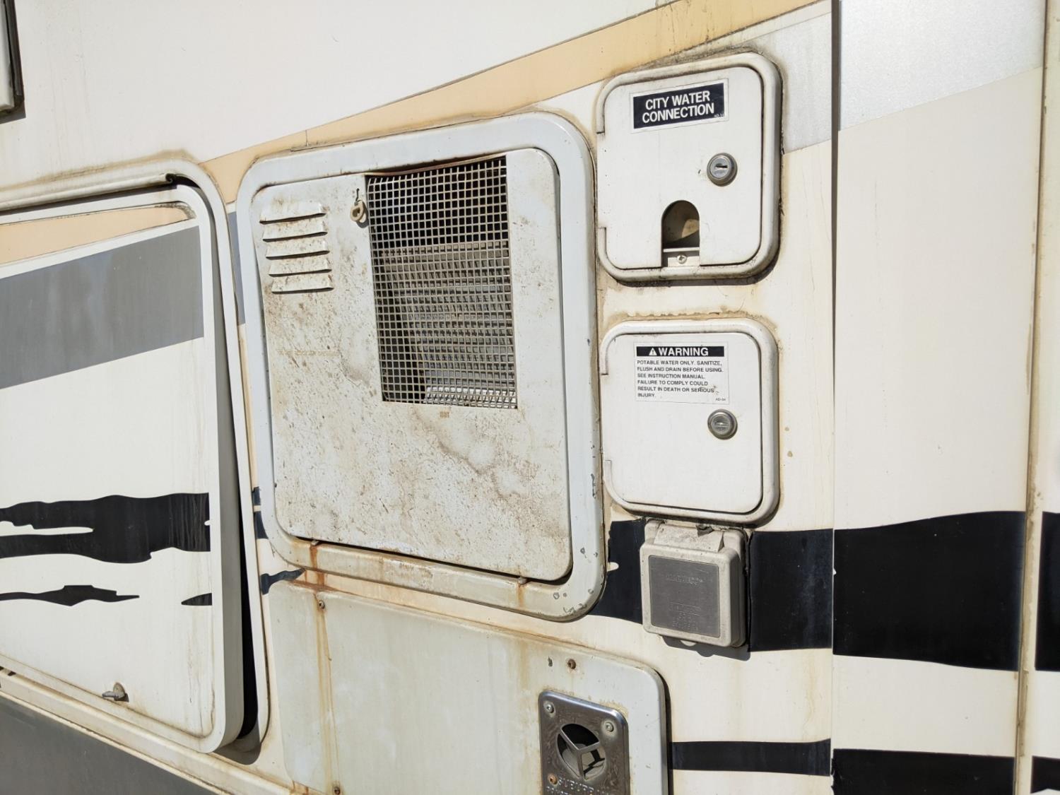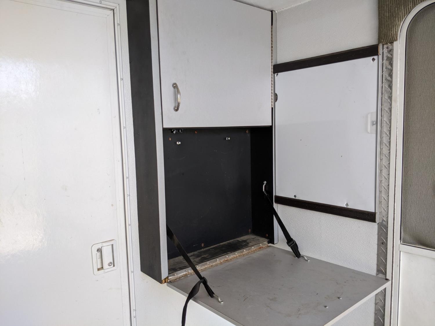 Sleeps 6, stove, fridge, microwave, full bath, master bedroom, A/C, outdoor shower, 2 slides, Onan generator, power levelling jacks, spring suspension, broken back window on drive's side, awning was ripped off, awning above slid has a rip, plastic fender skirts are broken, start button for generator doesn't work inside need to go outside to start it, generator has 1776hrs, rear toy hauler is 154 inch d x 98 inch w, ramp door is 101 inch h and has no form of assist , 238/85R16 tires