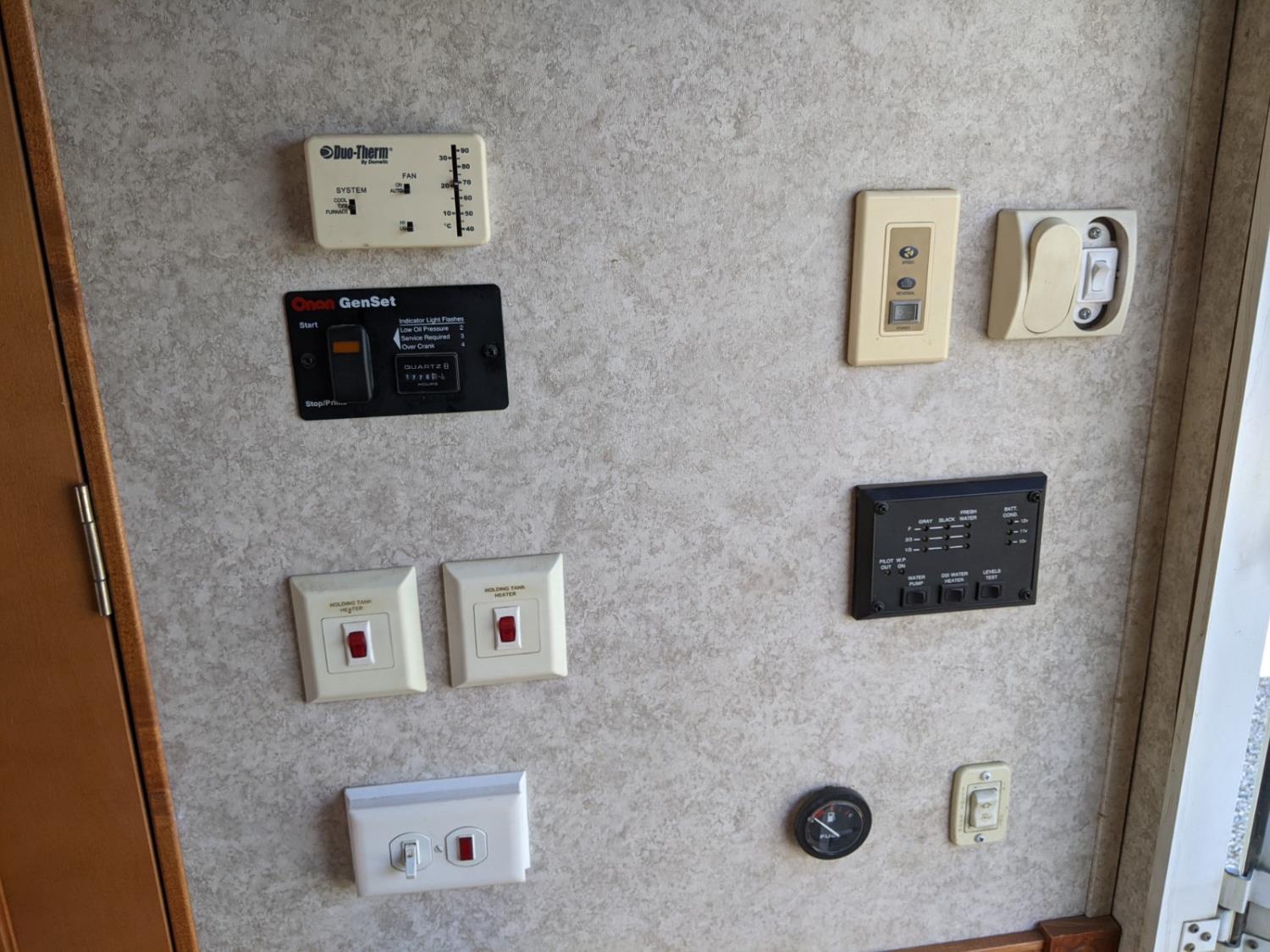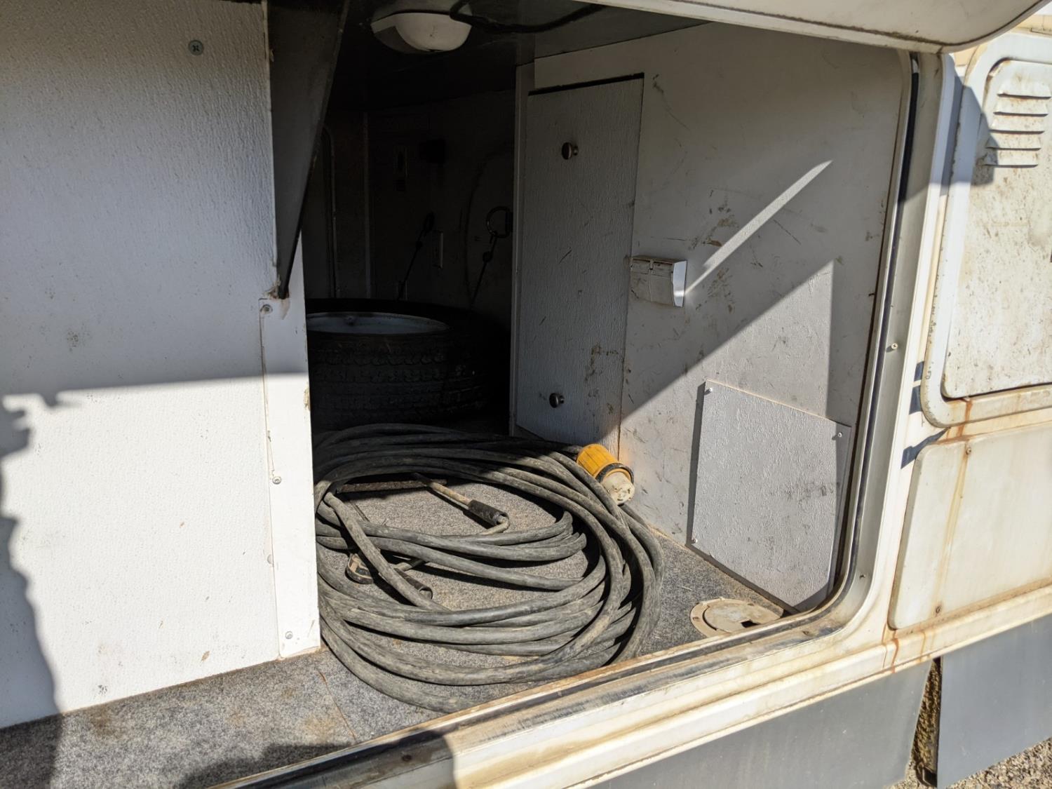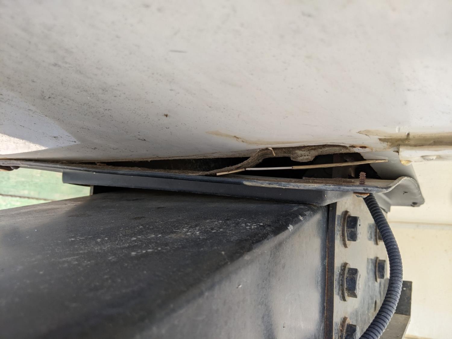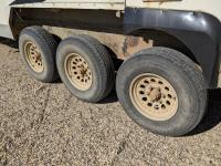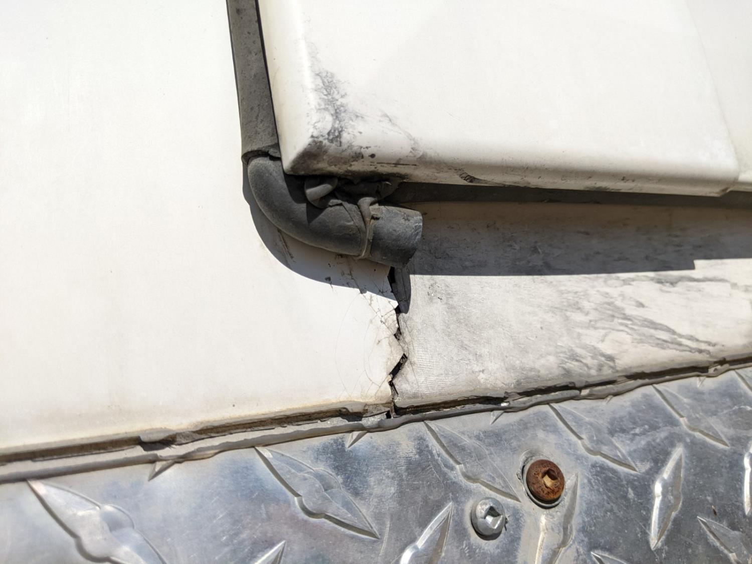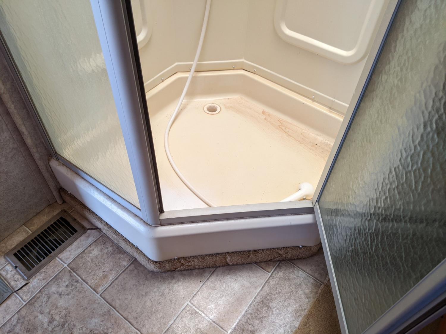 Sleeps 6, stove, fridge, microwave, full bath, master bedroom, A/C, outdoor shower, 2 slides, Onan generator, power levelling jacks, spring suspension, broken back window on drive's side, awning was ripped off, awning above slid has a rip, plastic fender skirts are broken, start button for generator doesn't work inside need to go outside to start it, generator has 1776hrs, rear toy hauler is 154 inch d x 98 inch w, ramp door is 101 inch h and has no form of assist , 238/85R16 tires