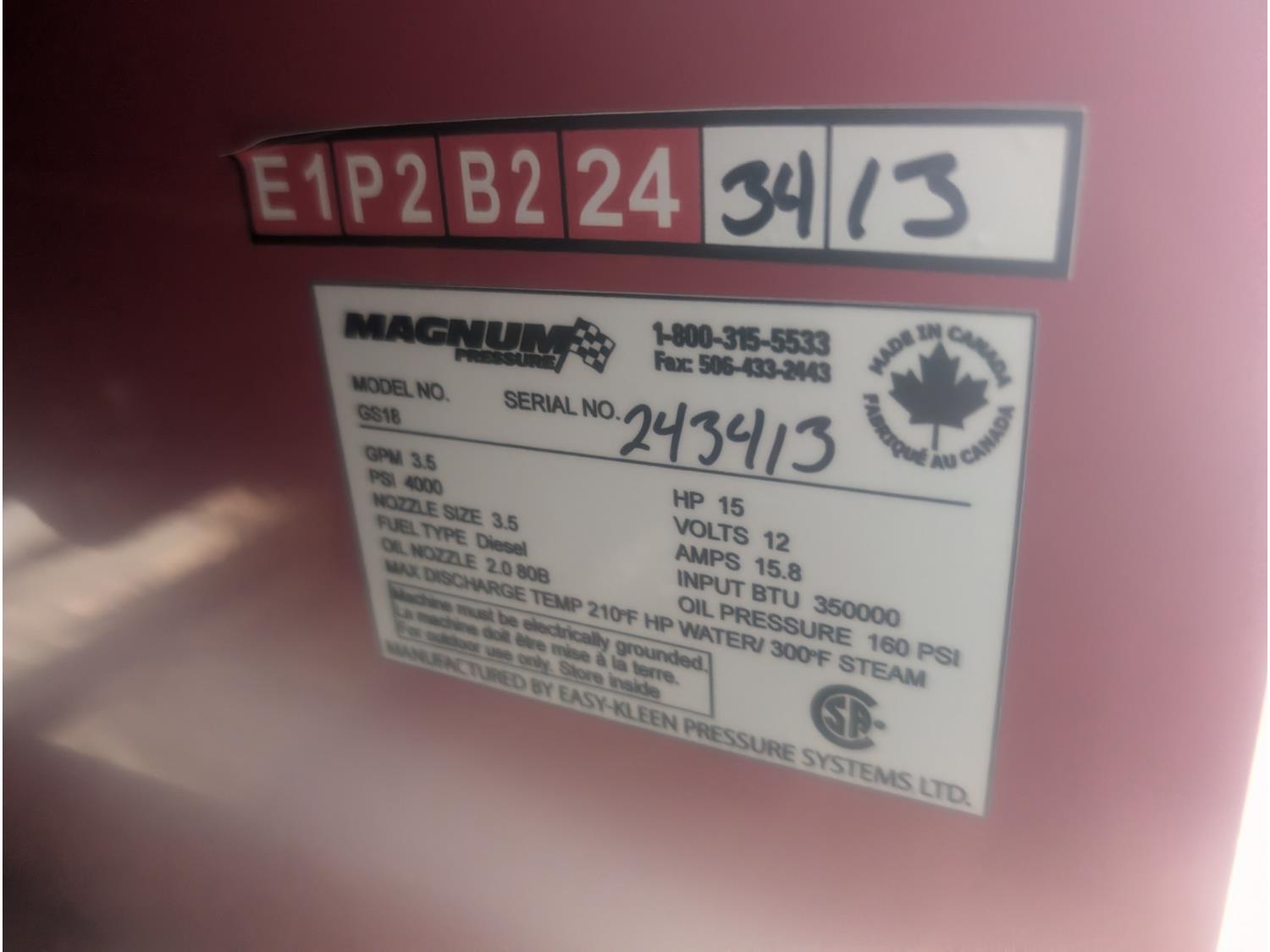 3.5 GPM at 4000 PSI, 15 HP, gasoline engine, electric start, 12 volt burner, oil/diesel fired burned/thermostat, schedule 80 coil with stainless steel housing, fully welded, powder coated frame, 10 gallon poly fuel tank