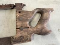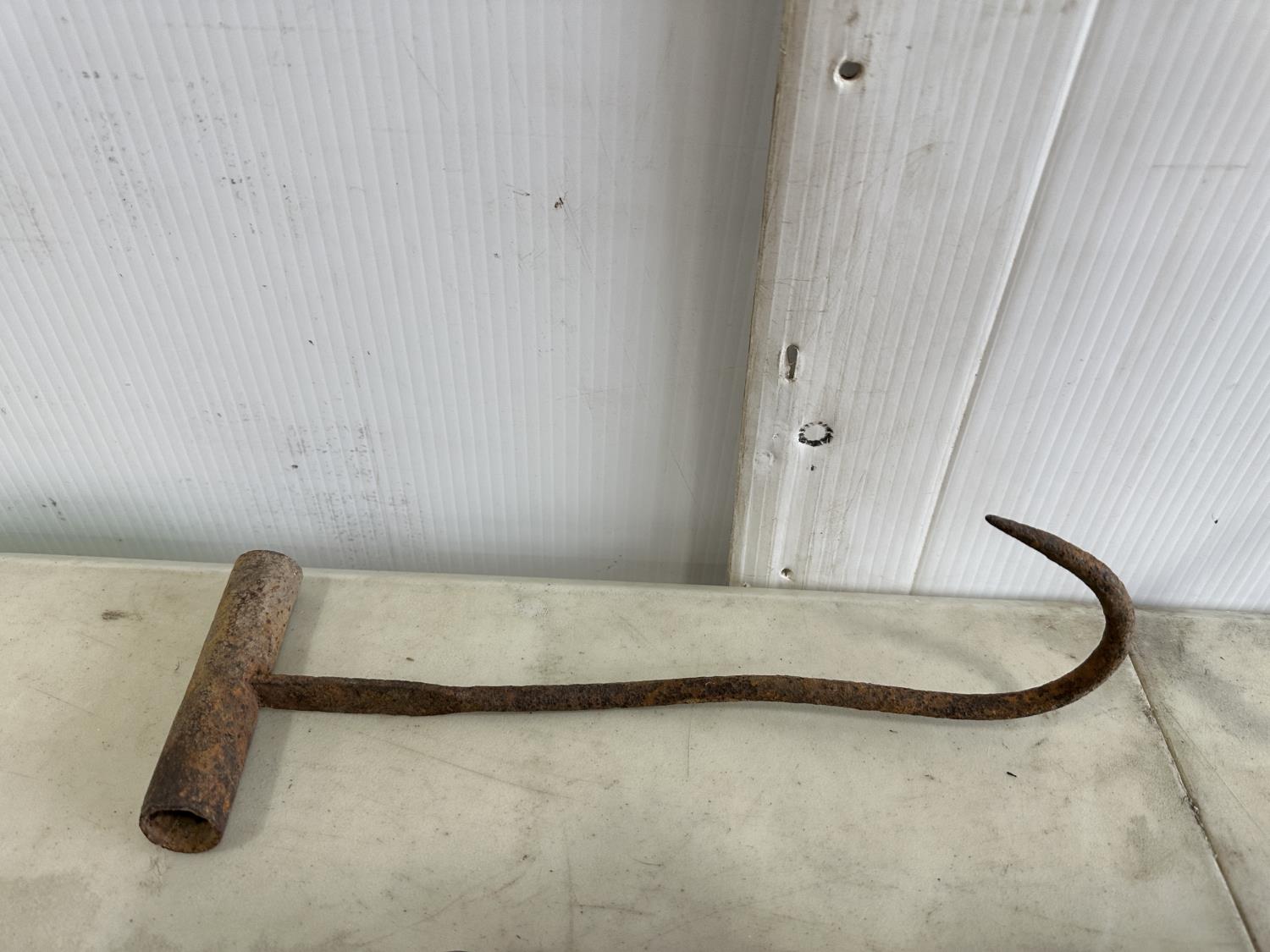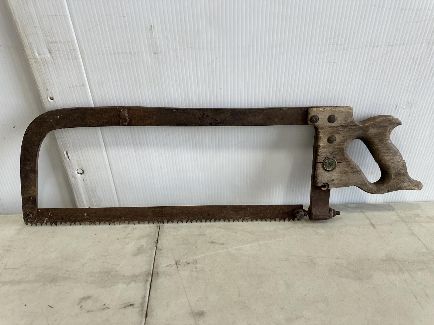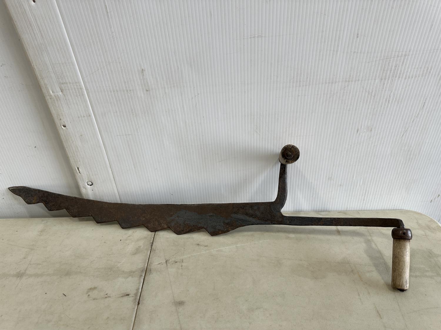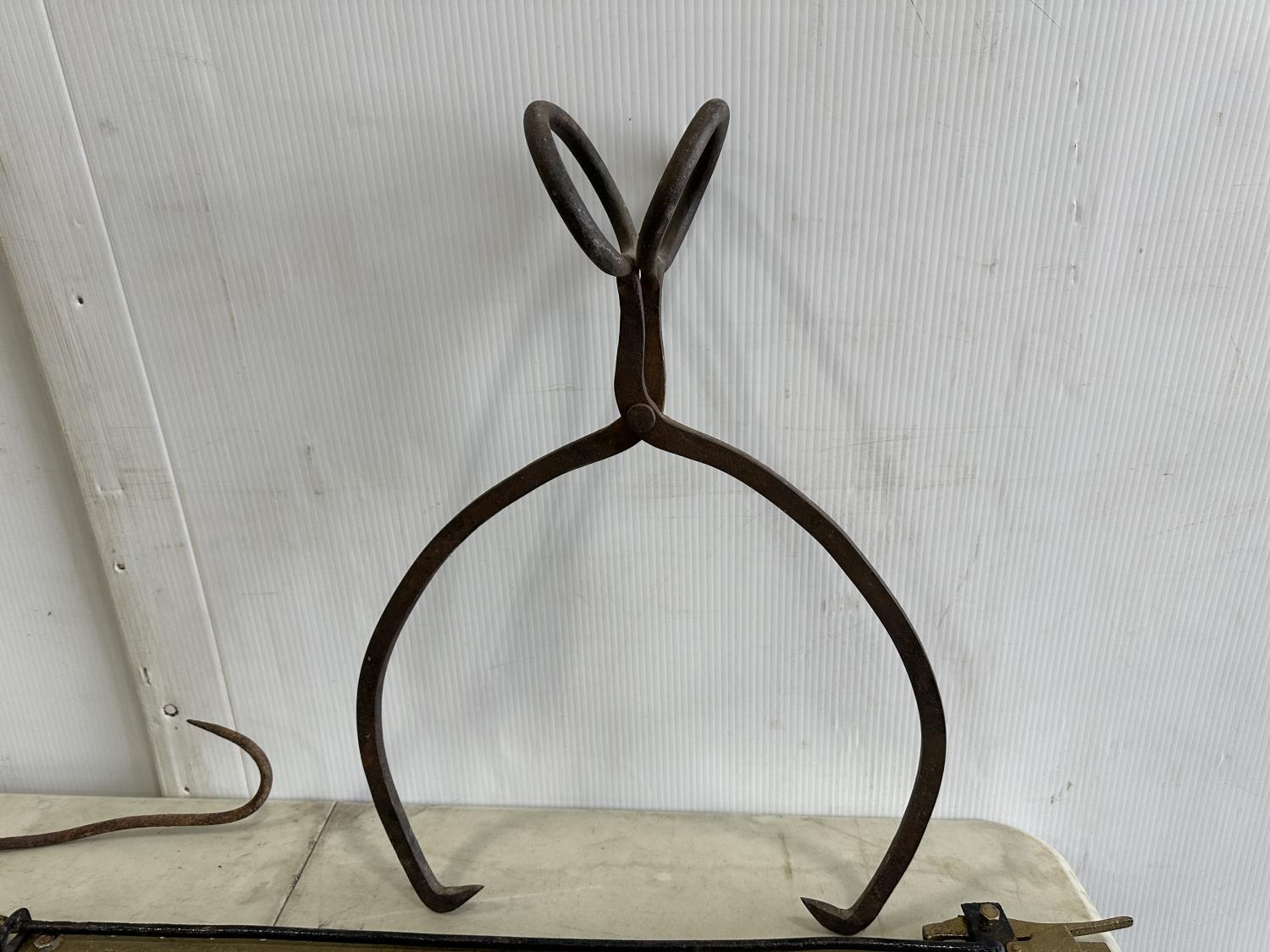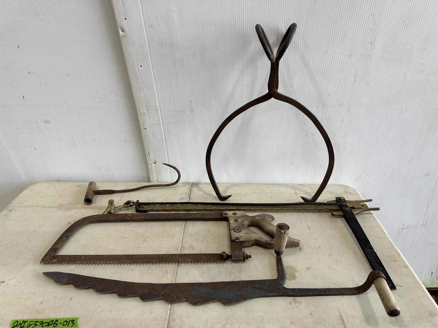 ice tongs, hay hook, fence stretcher, bow saw and hay saw