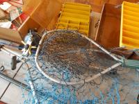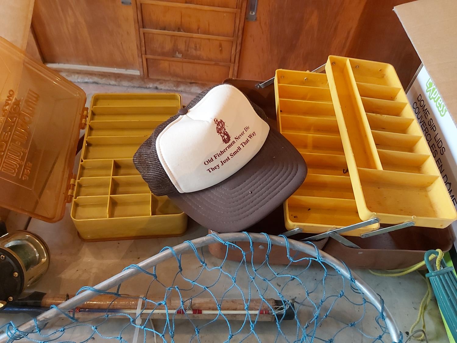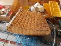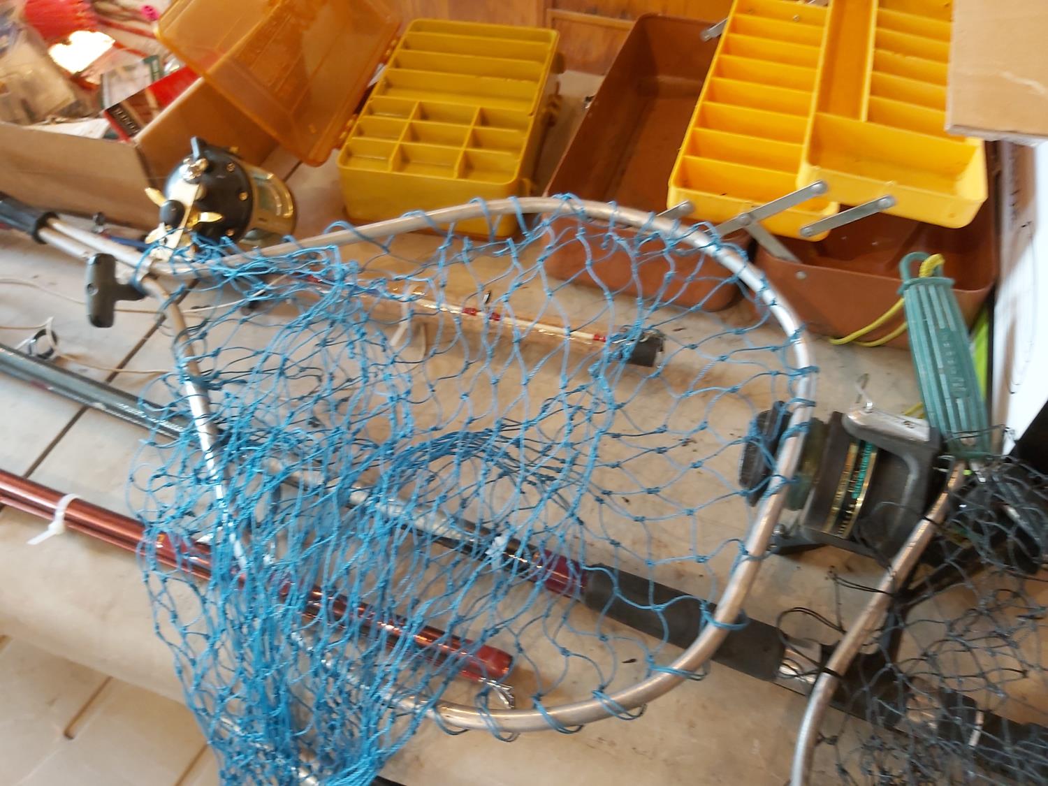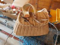 salmon rods, landing nets, qty of lures & tackle, (2) tackle boxes, vintage wicker baskets