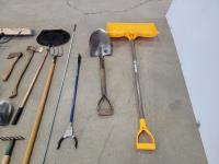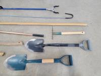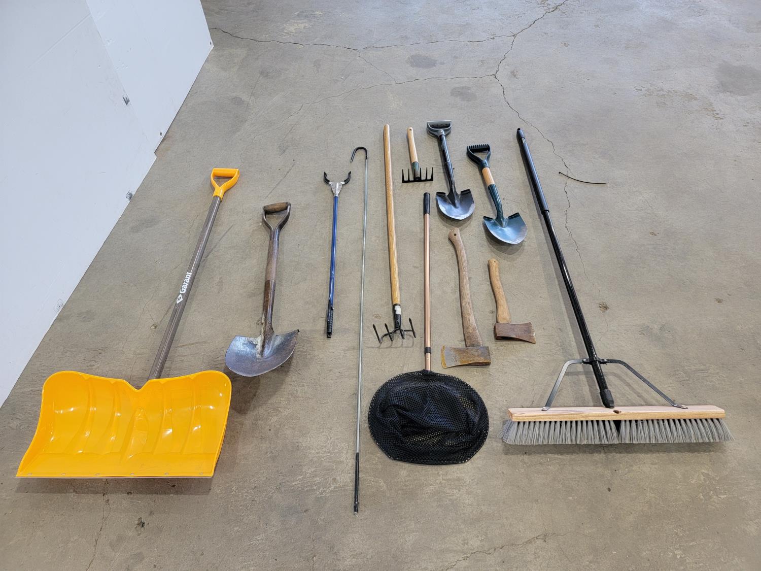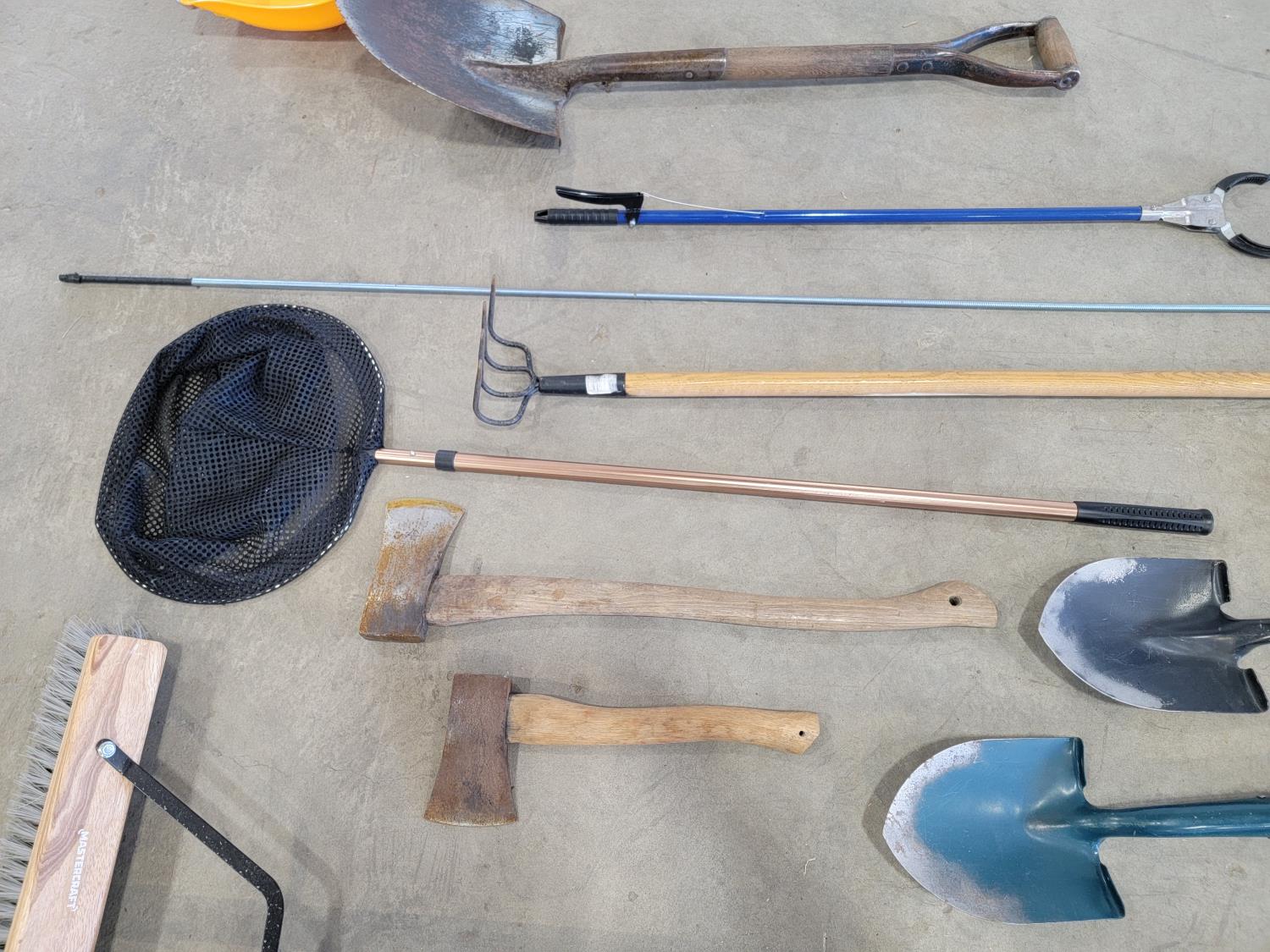 Broom, shovels, hoes, grabber tool, axe, hatchet