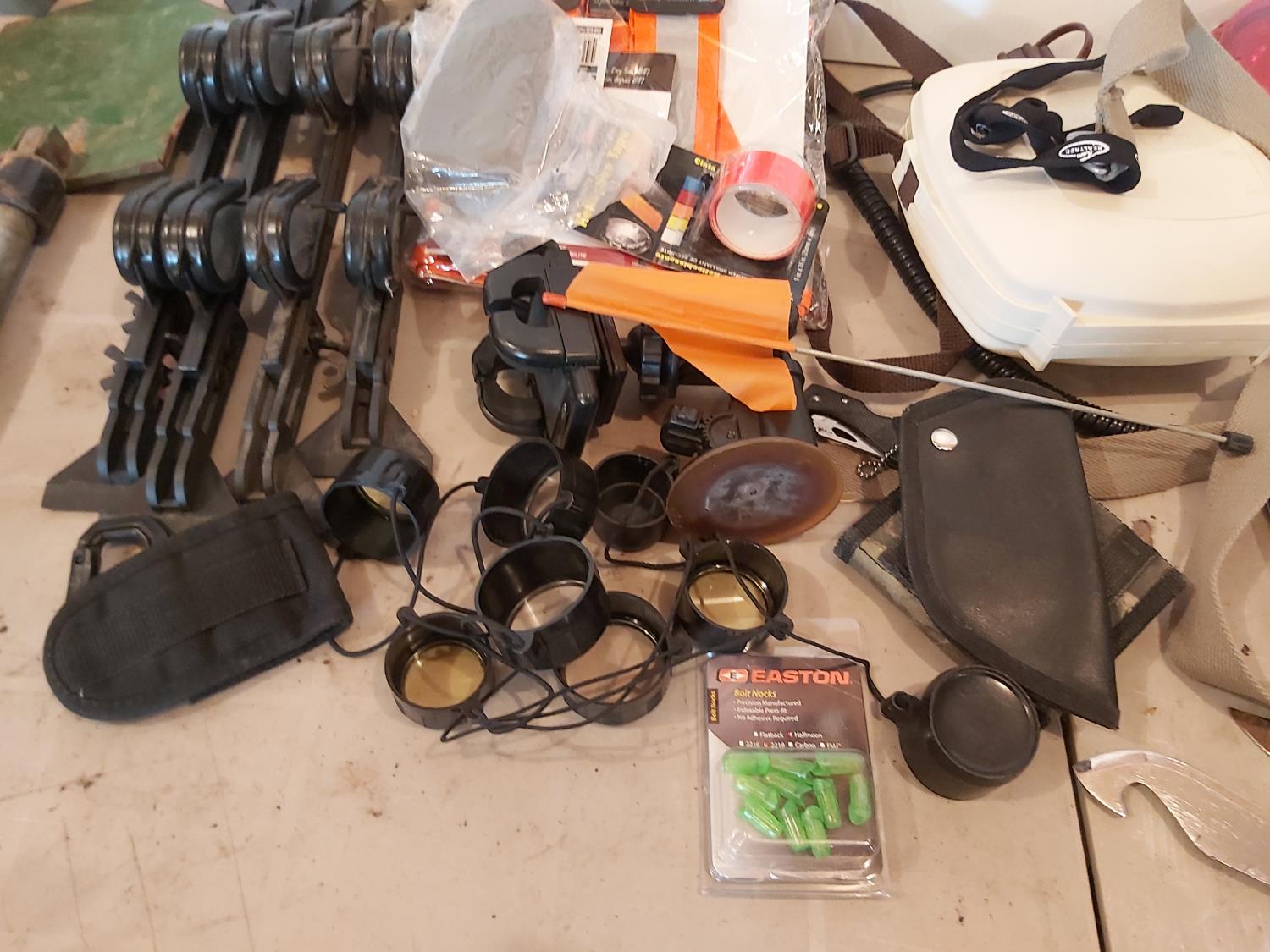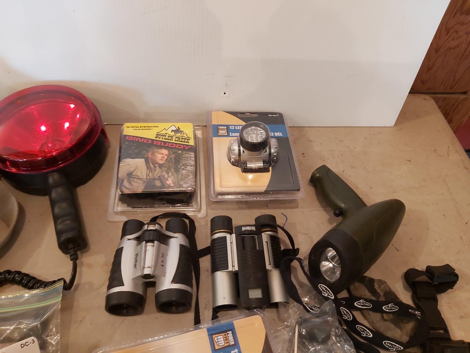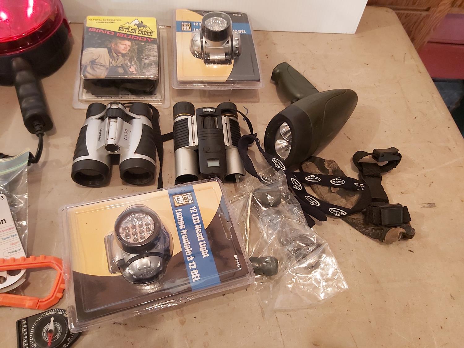 scope covers, hi-vis, lights, head lamps, knives, binoculars