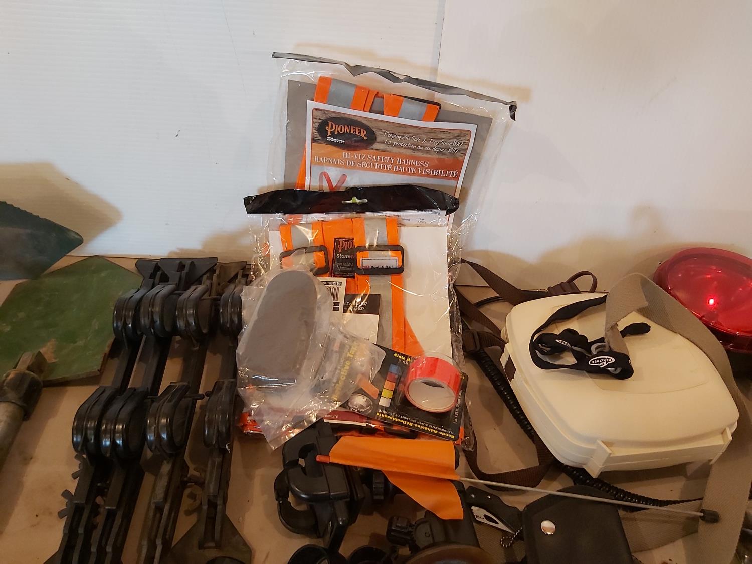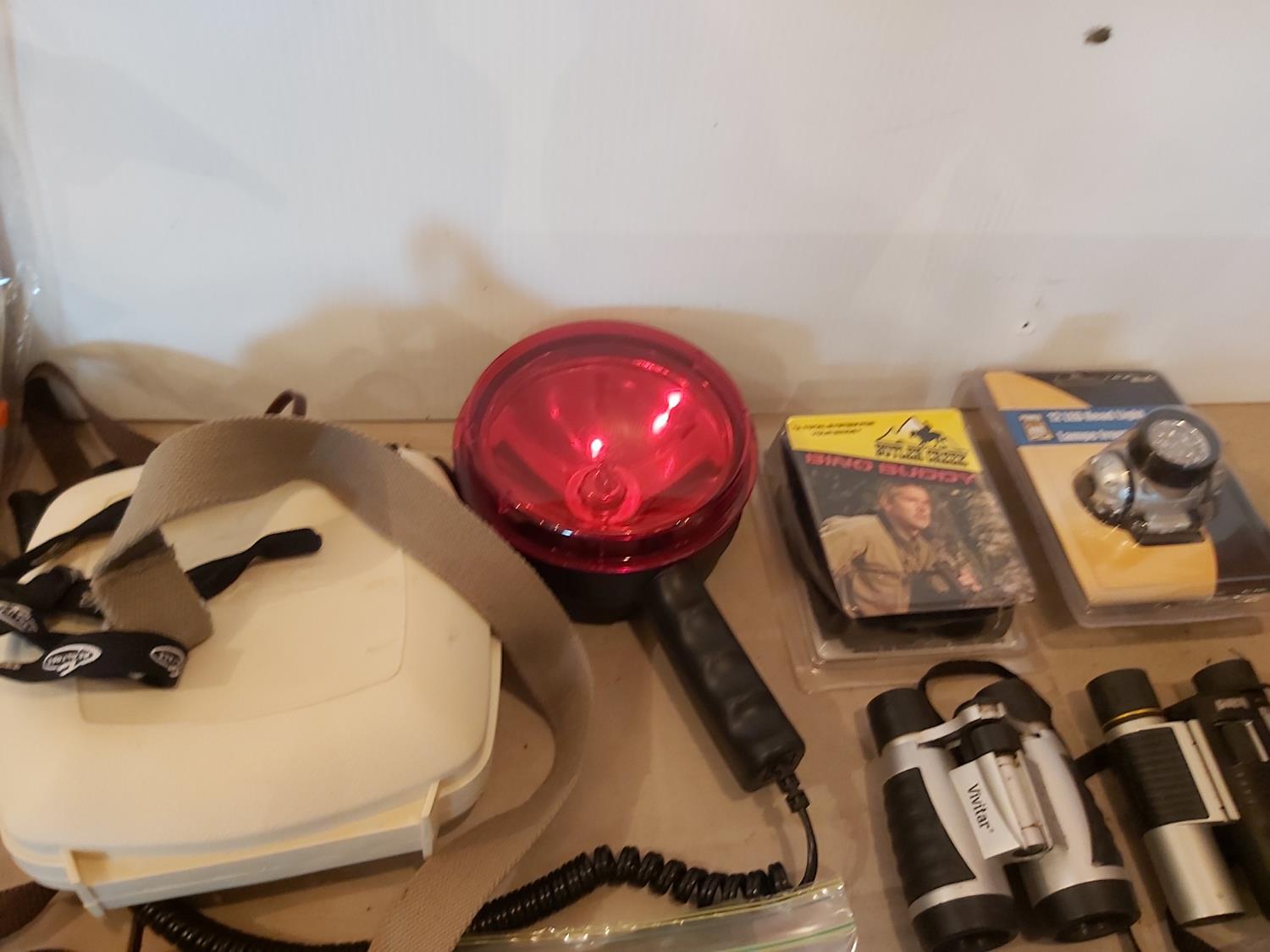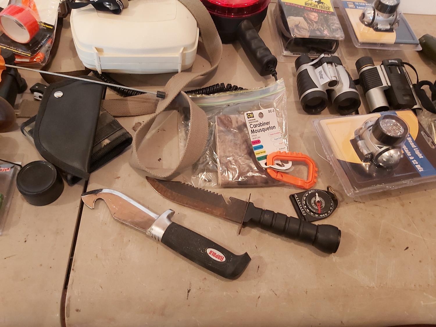 scope covers, hi-vis, lights, head lamps, knives, binoculars
