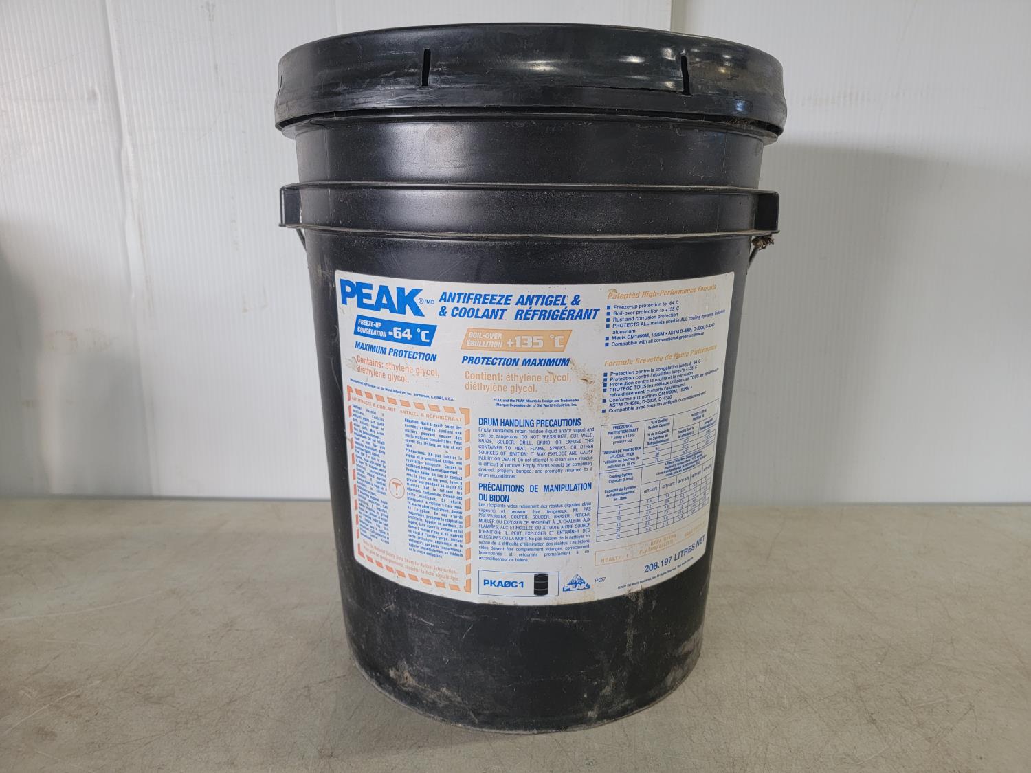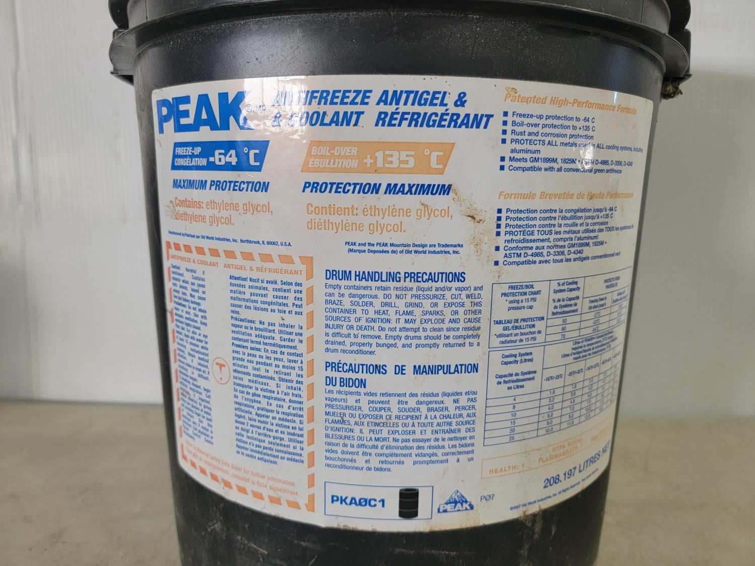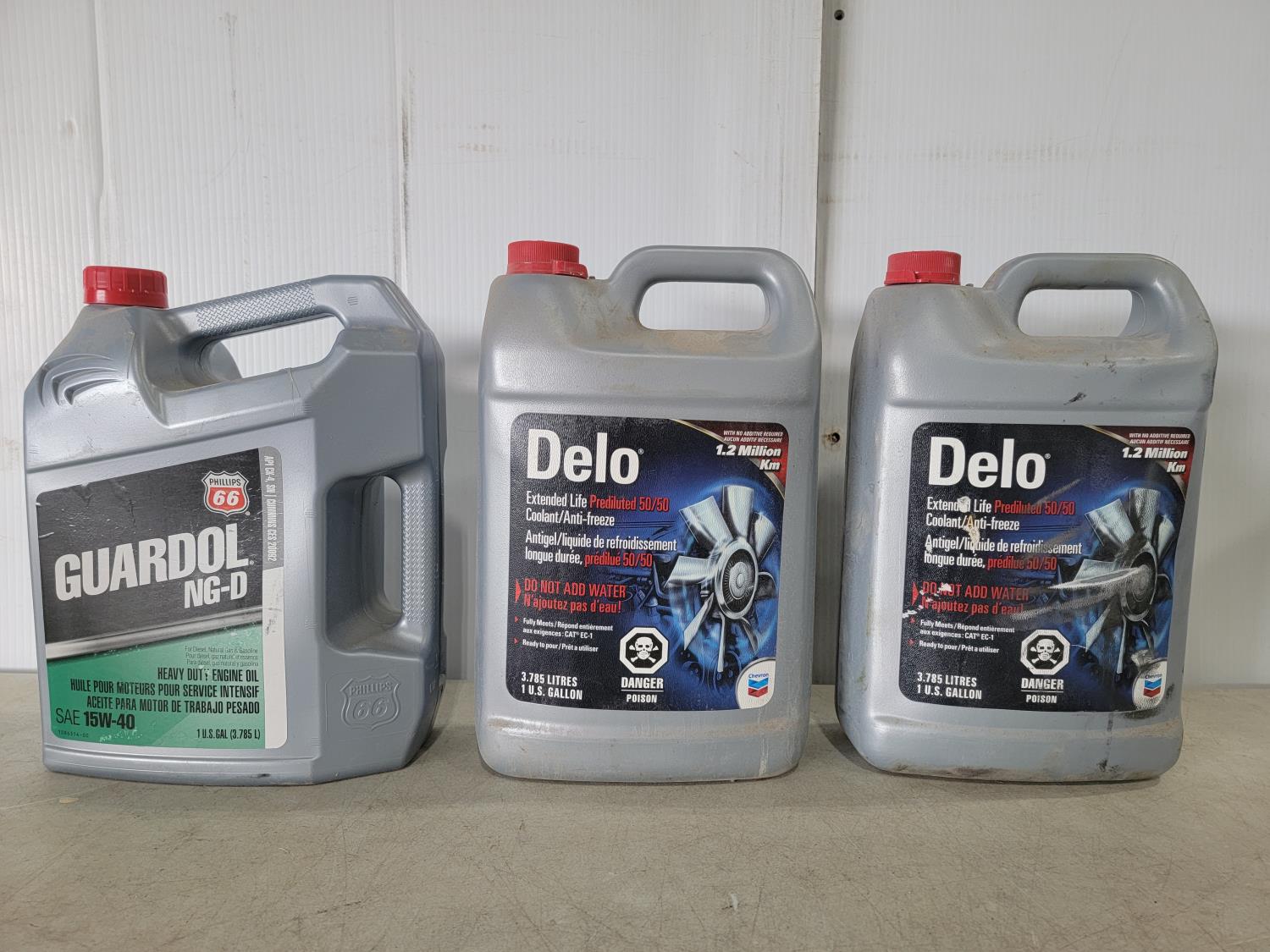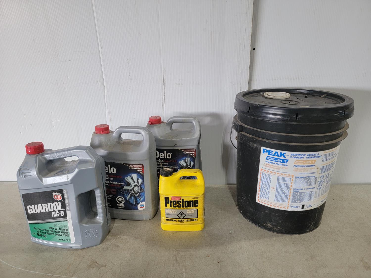 (2) 1 gallon Delo coolant, (1) Guardol NG-D 15W-40 engine oil, (1) 1L Prestone coolant, (1) 208.197L Peak coolant
