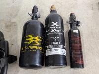 Gun, (3) CO2 cartridges, (2) tubes of paintballs, (3) helmets