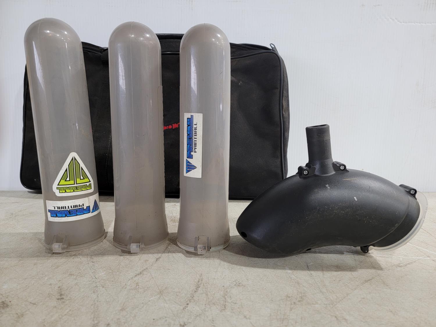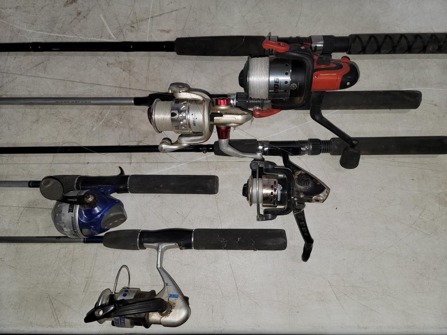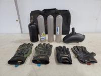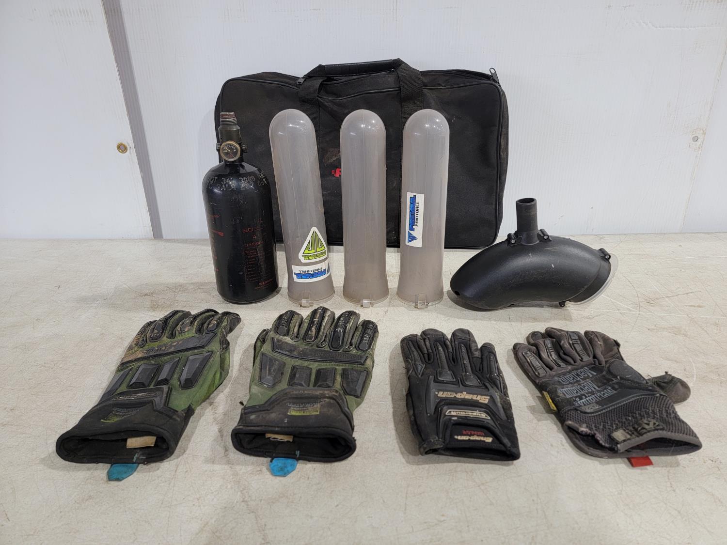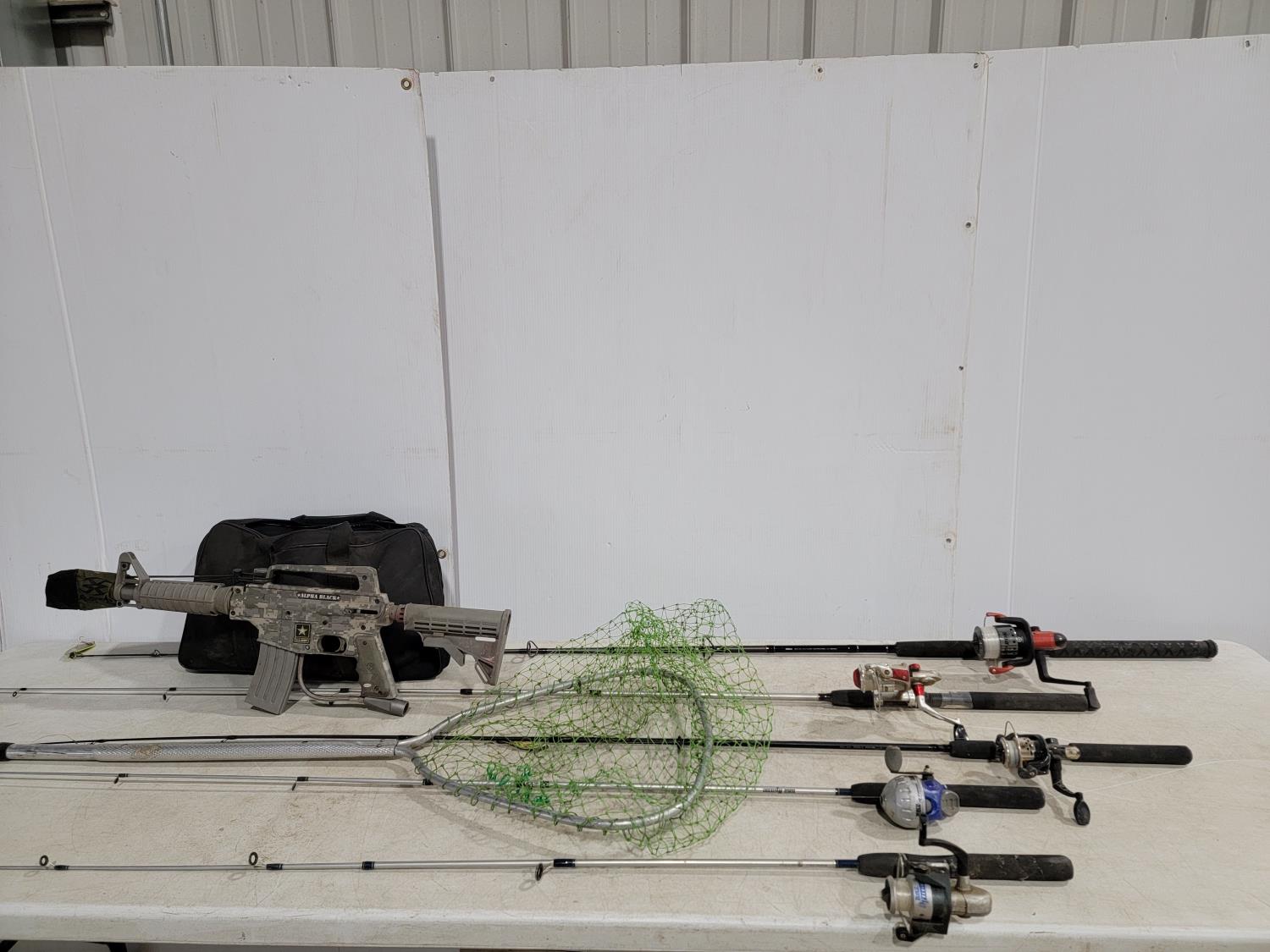 (5) fishing rods with reels, fishing net, paintball gun with accessories, CO2 bottle, (2) pairs of gloves