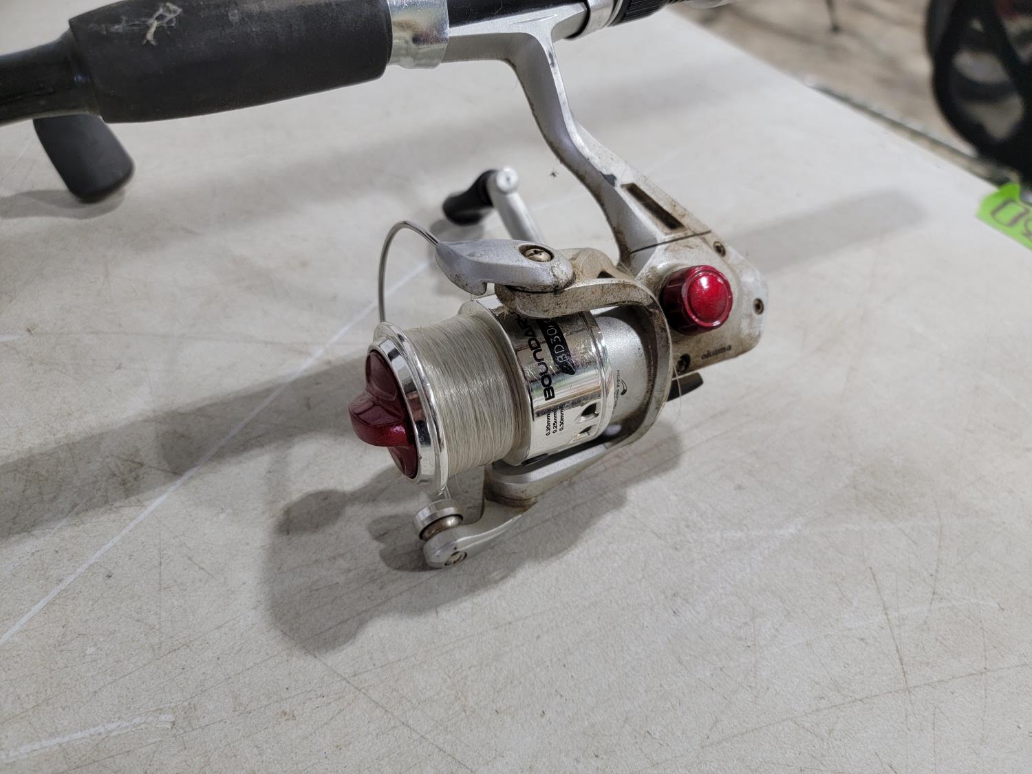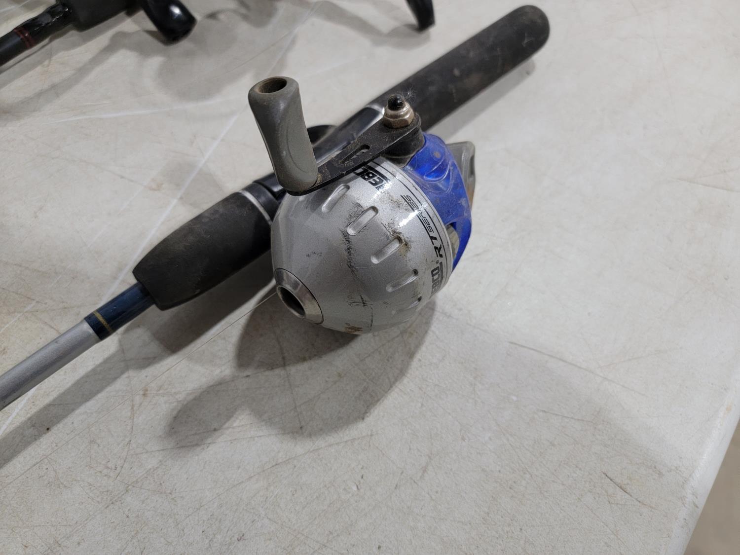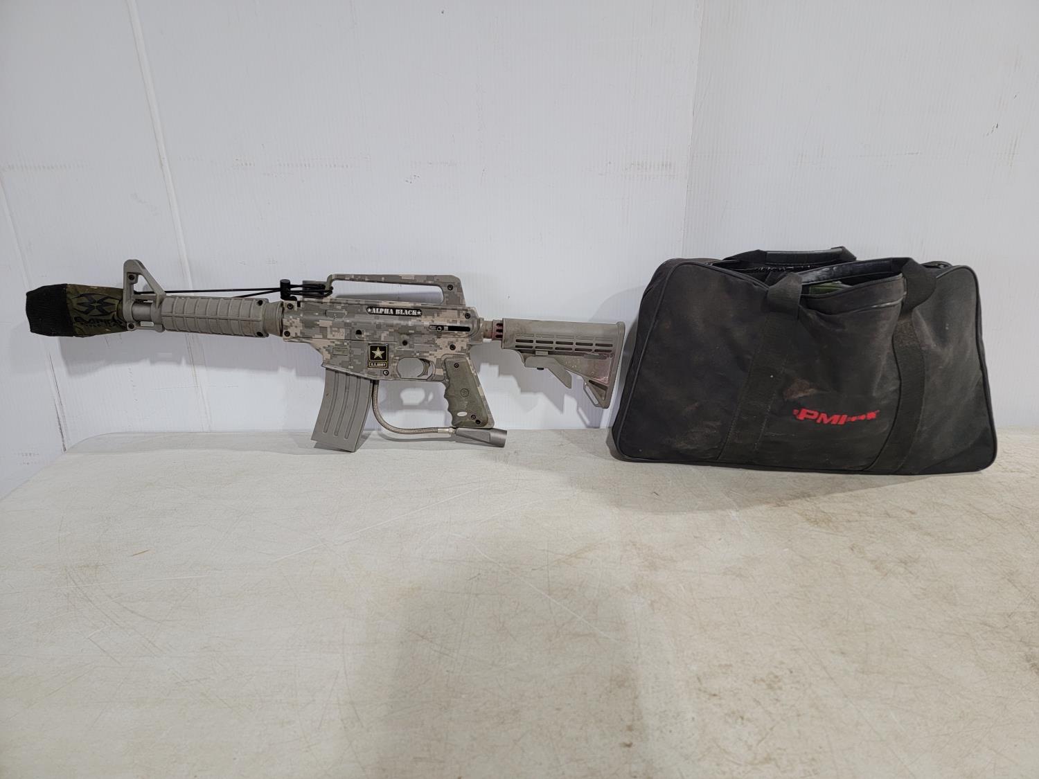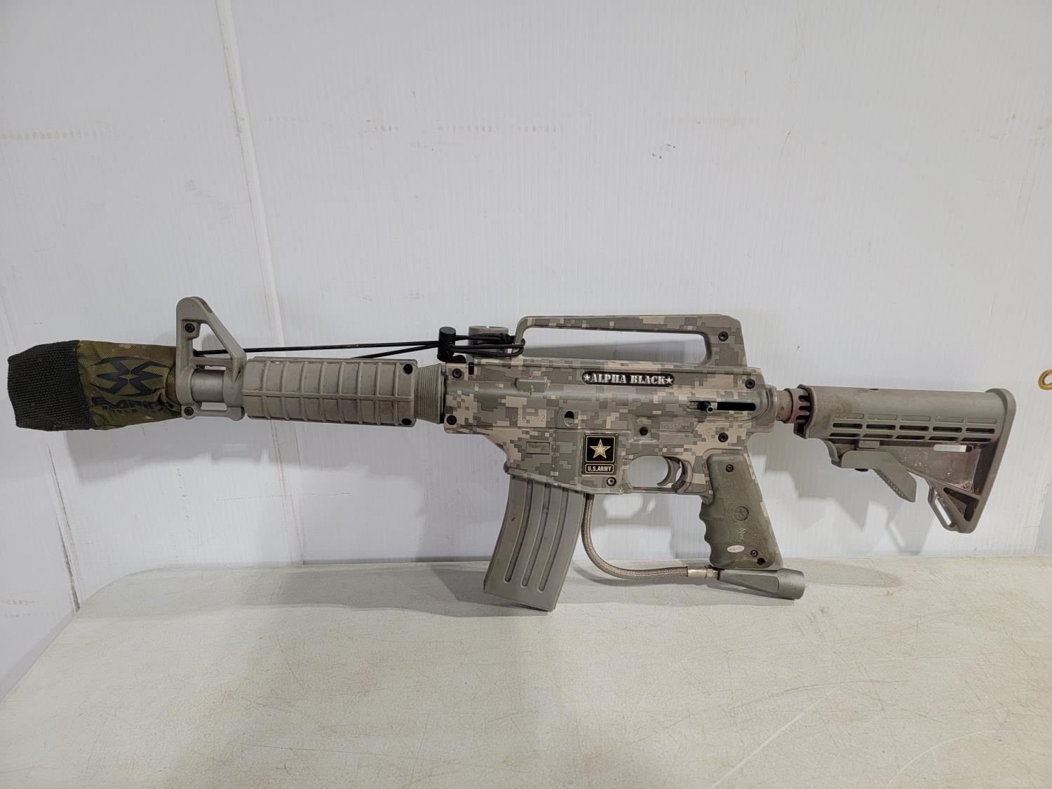 (5) fishing rods with reels, fishing net, paintball gun with accessories, CO2 bottle, (2) pairs of gloves