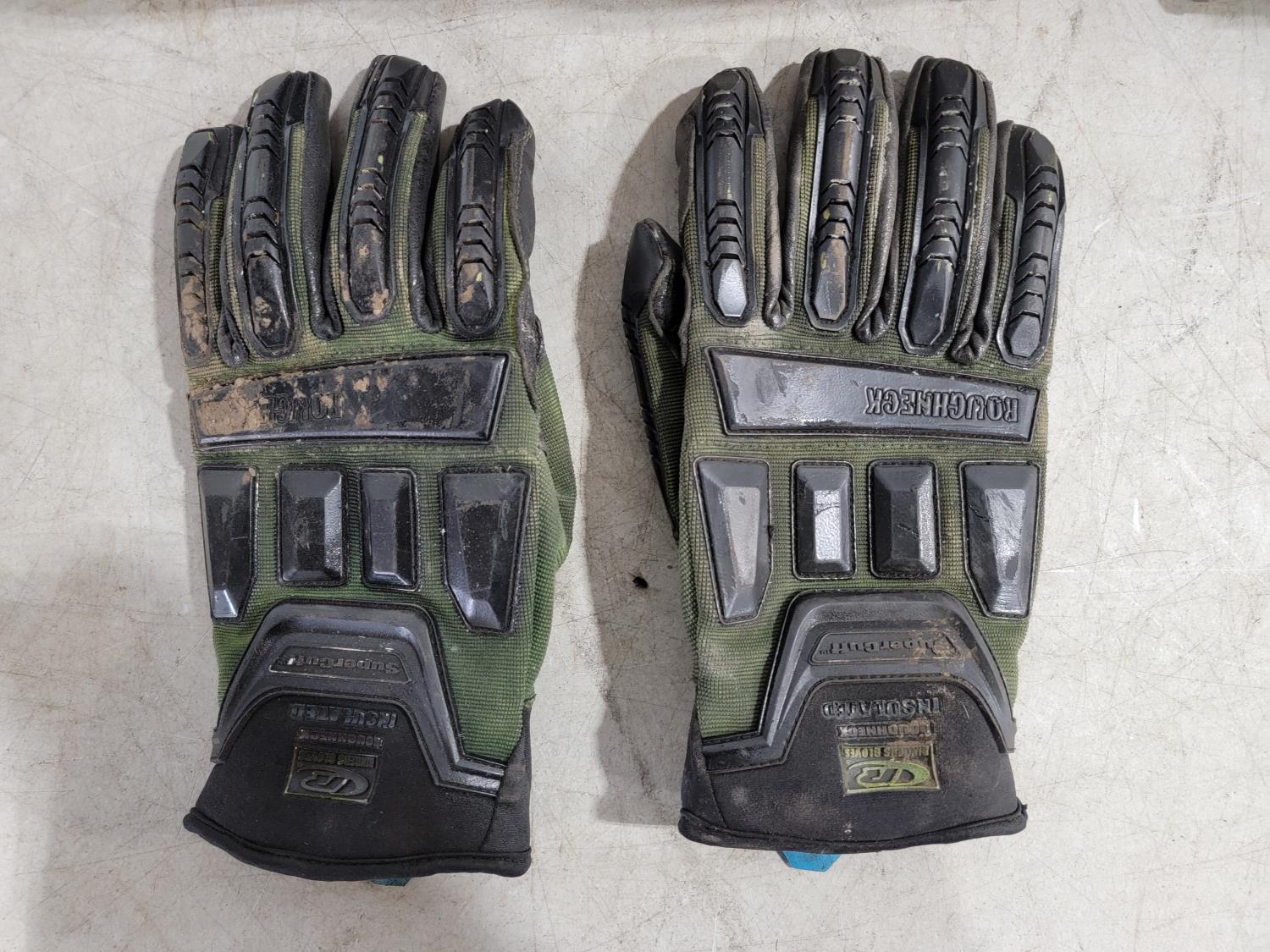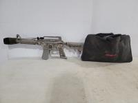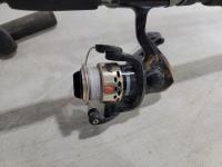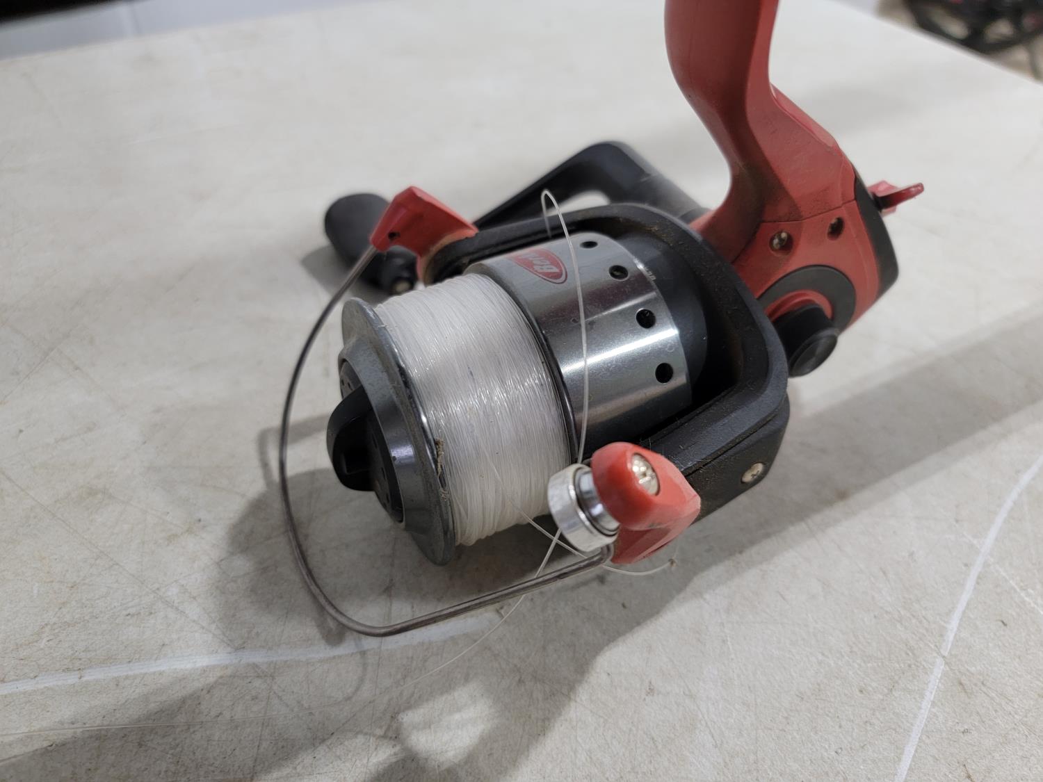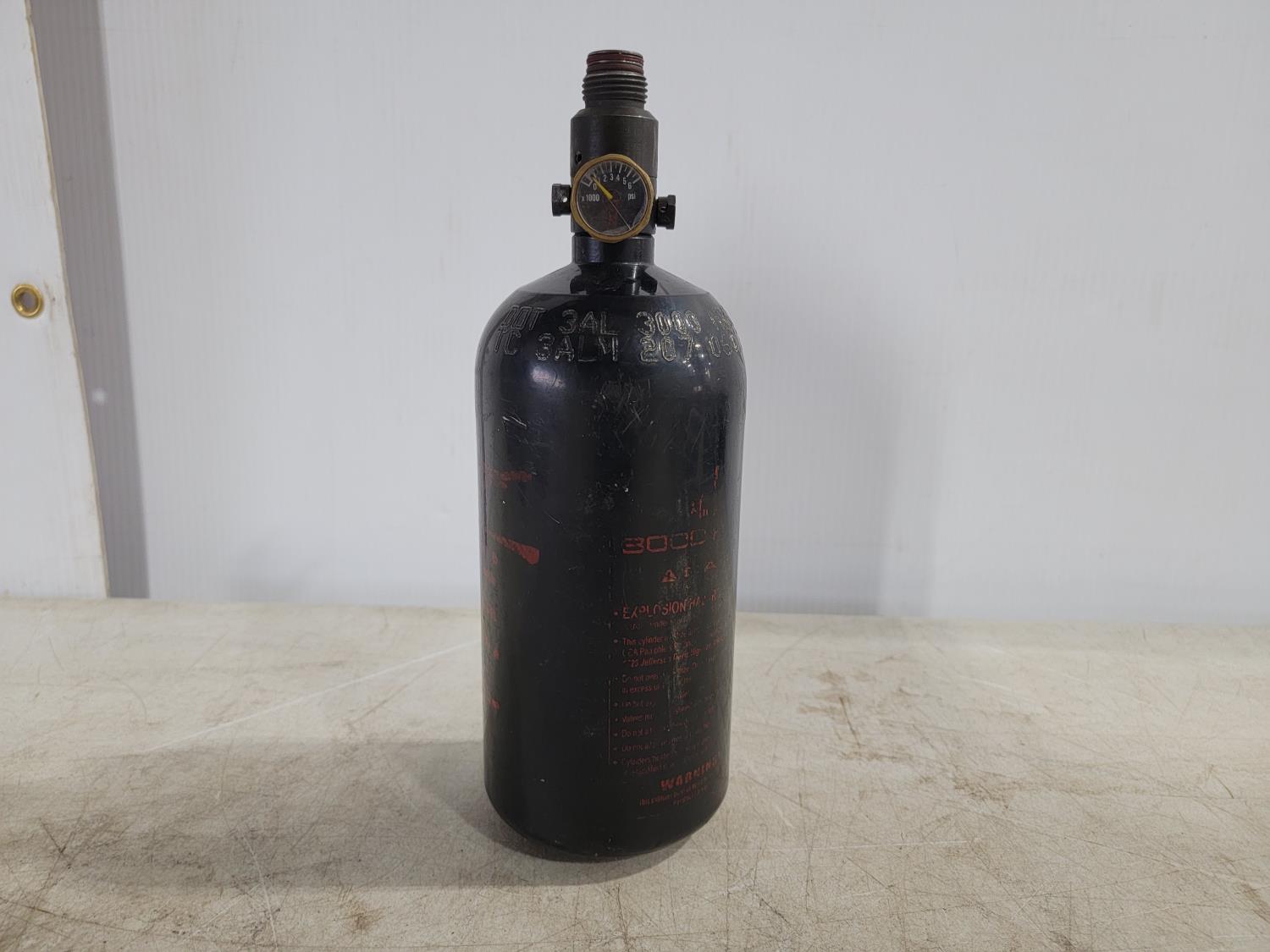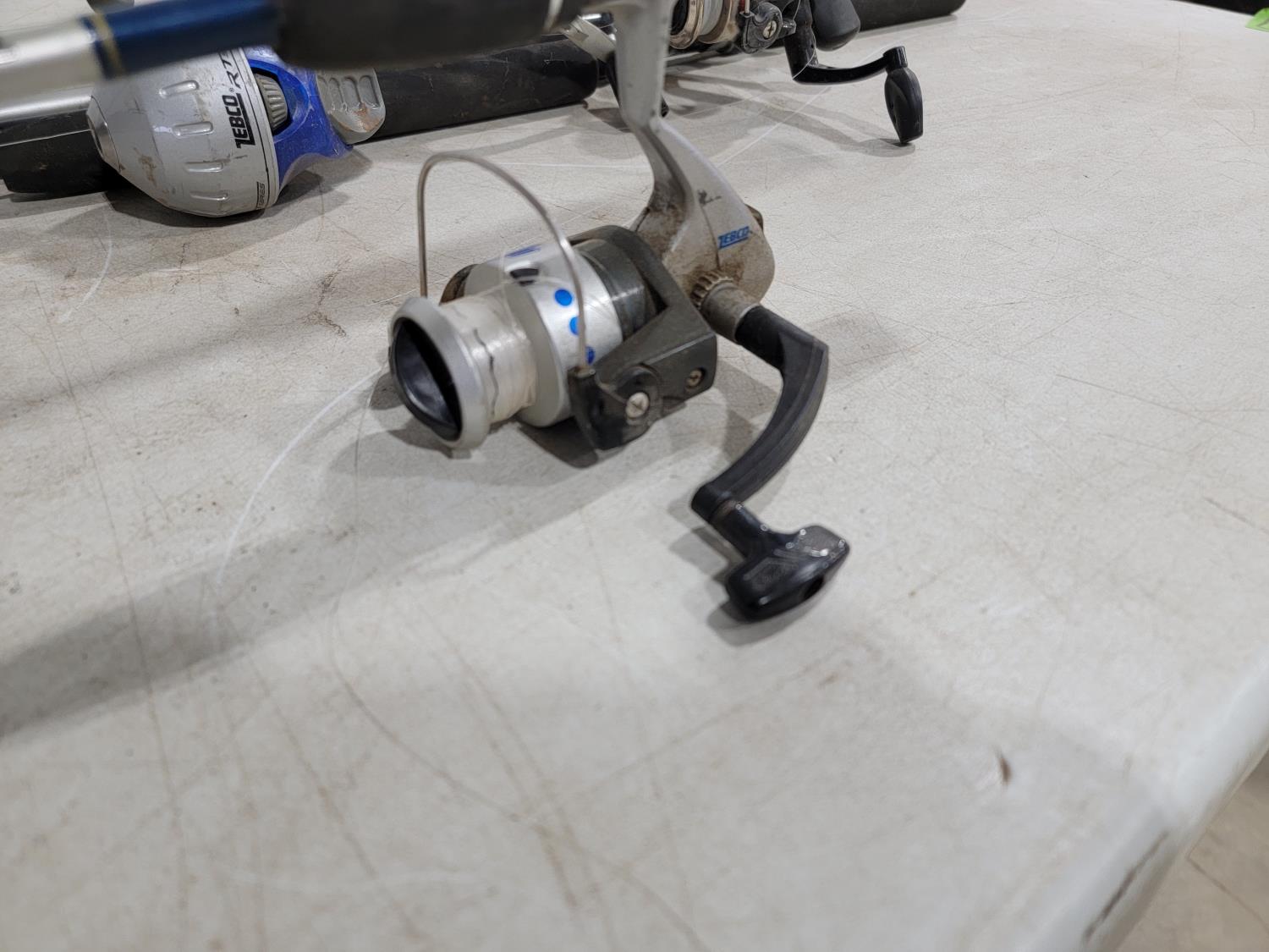 (5) fishing rods with reels, fishing net, paintball gun with accessories, CO2 bottle, (2) pairs of gloves